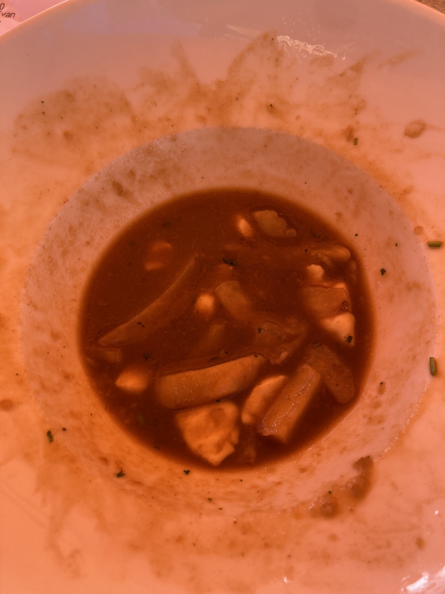 Commandé des frittes sauce poutine en pensant avoir un plat de frites avec fromage fondu un minimum gratiné mais je me suis retrouvé avec une soupe de frites baignant dans une sauce avec des blocs de fromage même pas fondu. Même si le menu mentionnait sauce bouillon je ne m’attendait pas à ça !