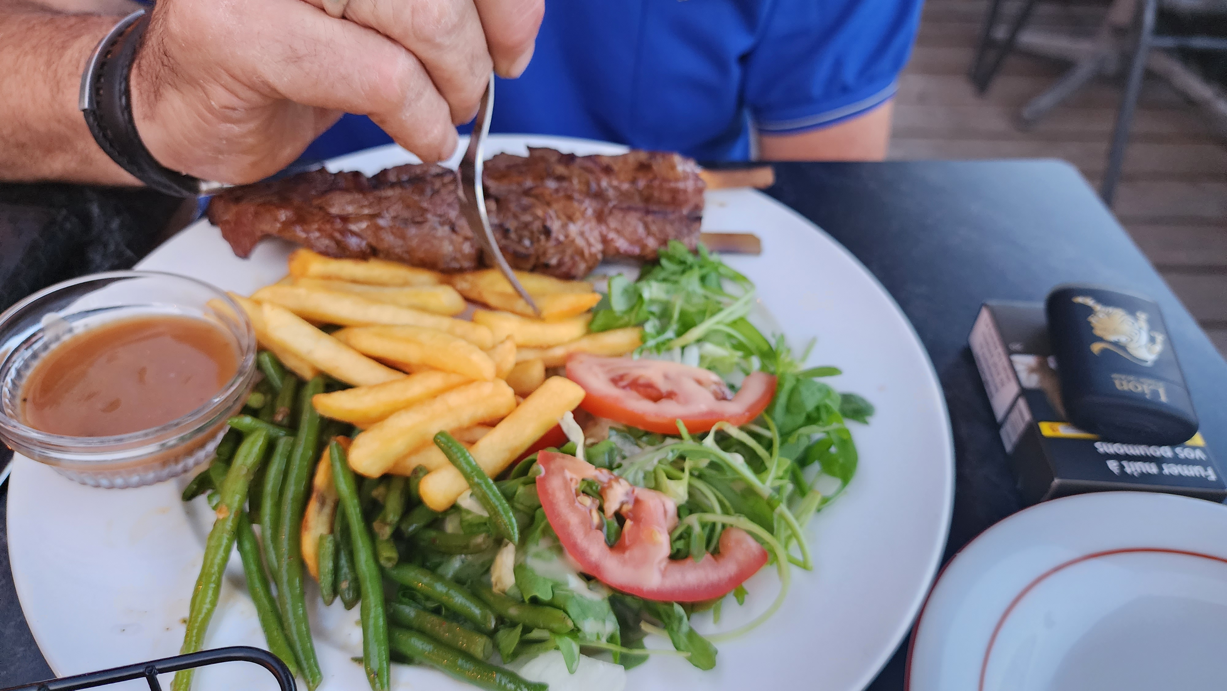 Délicieux Plat du jour + dessert @16,90€….Boeuf fait maison avec riz, léger comme une plume Gâteau de semoule fait maison en dessert….. Salade César au poulet, pain, deux grosses bières Leffe… 45€.