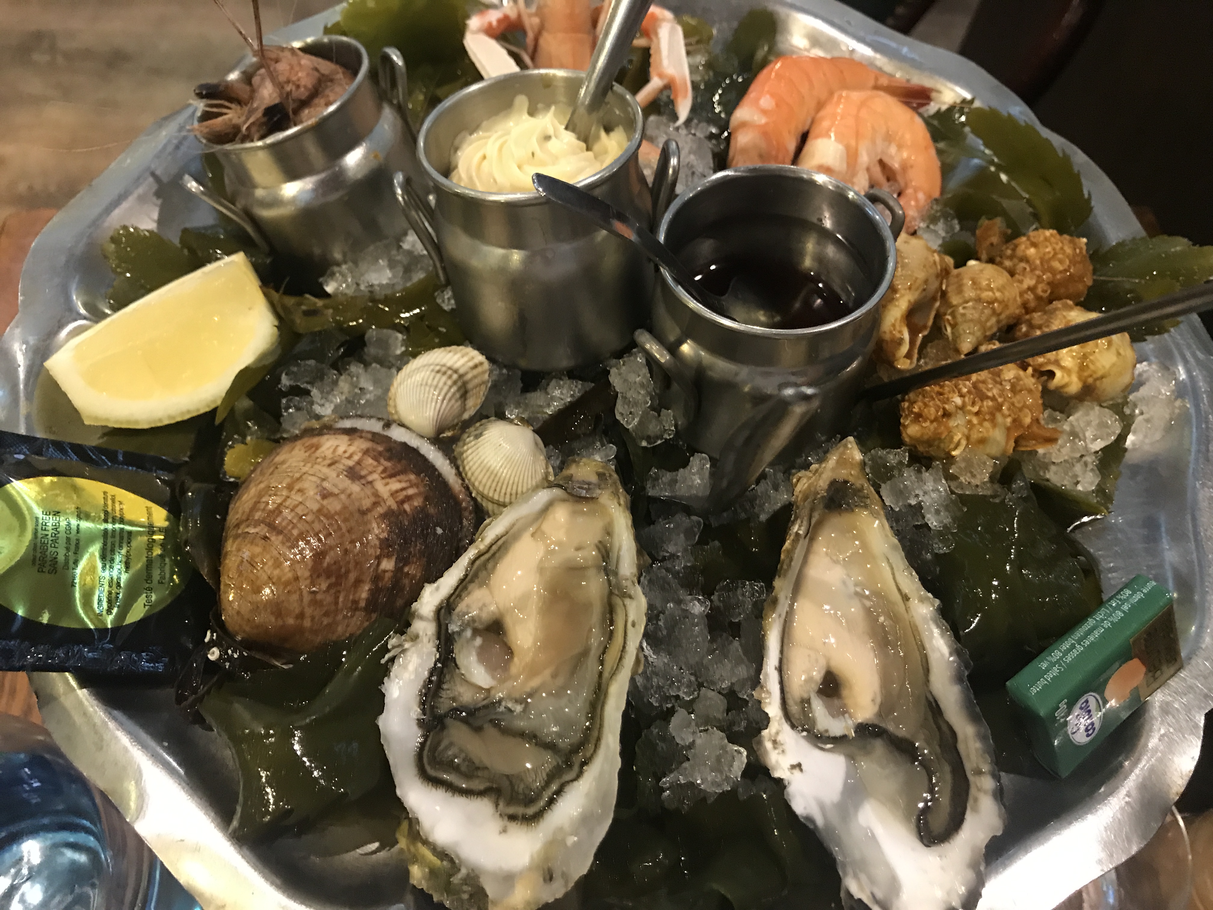 Ce restaurant propose de grands plateaux d'apéritifs/petits repas de fruits de mer. Pour un Américain, ces plateaux contiendront des choses auxquelles vous n'êtes pas habitué, comme des bulots, des petites crevettes entières et des muscles qui n'ont pas été élevés à la ferme. Tout cela est bien, mais si vous n’y êtes pas habitué, c’est peut-être un peu trop. Le service pour commander et obtenir de la nourriture était correct, mais au moment de payer, nous avons été confrontés à une certaine confusion. Je pense qu'on aurait pu s'attendre à ce que nous payions à la caisse… ce que nous avons fait après avoir reçu le chèque. Mais nous avons vu d'autres personnes payer avant de recevoir une facture. Alors tenez-en compte.