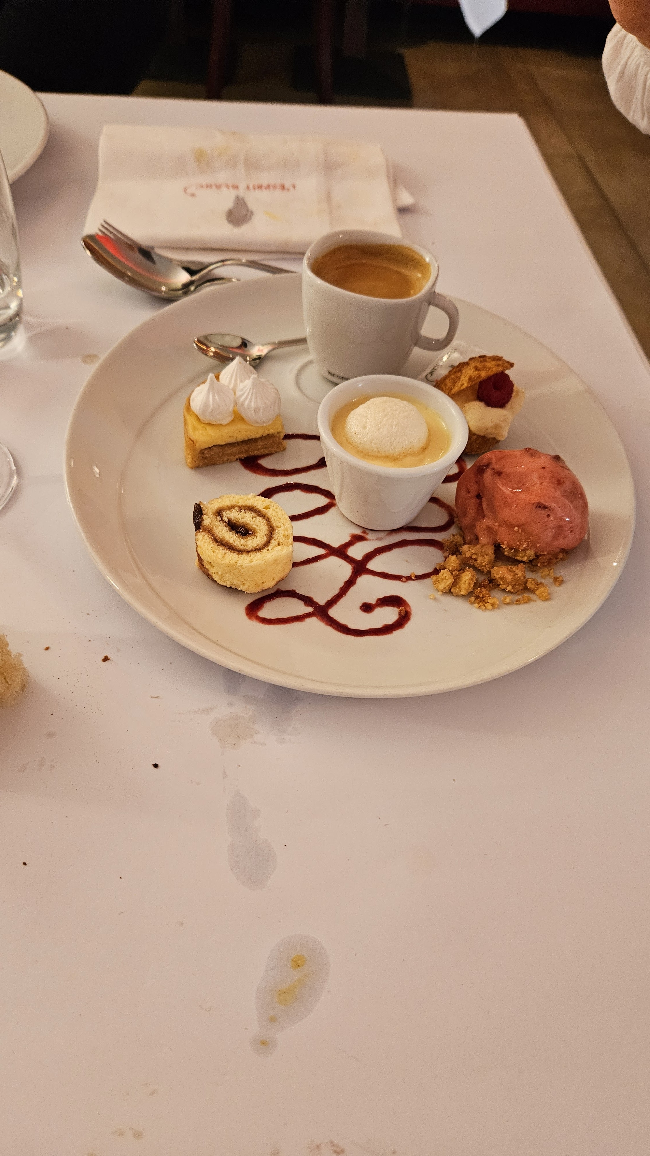 Nous sommes venus pour nos 13 ans de mariage repas bon dans l'ensemble cadre sympa mais déçu de ce restaurant après un spritz sur ma robe, du papier toilette dans la serviette de mon mari nous nous attendions à un geste commercial de la part de ce gastro ou ne serait ce qu'un café mais rien. Pas satisfait du tout