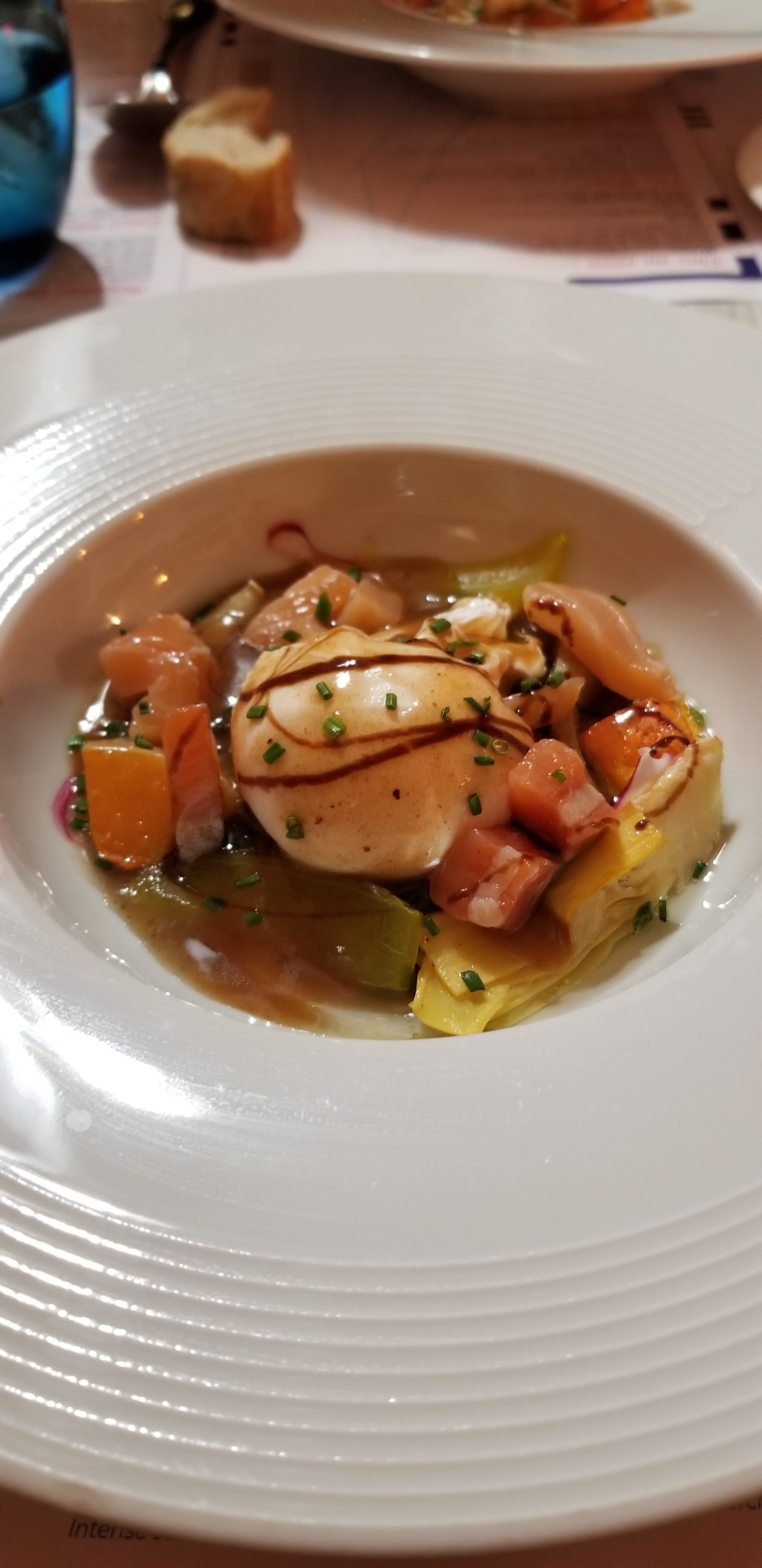 Beaucoup de maladresse et de non chalance du serveur qui vous retire le verre non terminé et du patron qui vous pose l’addition avant la fin du repas : cest léger… Le repas commence par une assiette de gougères sèches, creuses, froides et sans goûts, qui ont au moins le méritent d’annoncer la couleur de la suite. Les ormeaux baignaient dans l’huile ainsi que tout le reste de l’assiette: ce qui vous coupe l’appétit. Le dessert, un moelleux au chocolat indigeste difficile à terminer est accompagné d’une glace citron elle même difficile à terminer. Une note positive est la présence d’un Pianiste qui a joué pendant le repas ce qui est très très appréciable.
