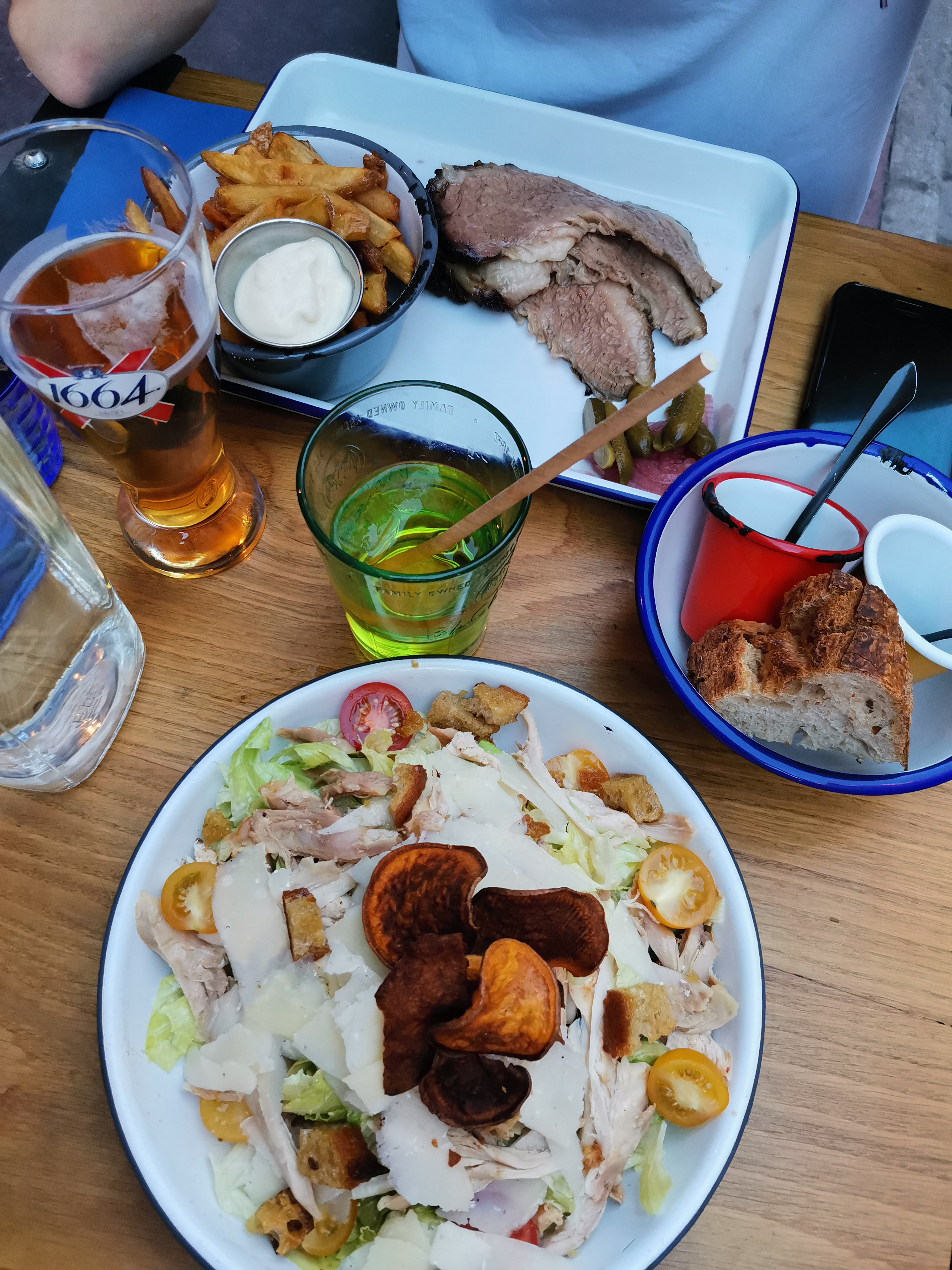 Même table que MC le 06juin midi. Le serveur a fait une petite remarque quant à notre manière de commander les boissons ah ok on va surtout pas regrouper les commandes alors que nous simplement nous n'arrivions pas à commander ensemble car il tournait tres vite les talons. Certainement de l'humour. Il ne savait si il avait de la bière blanche ou pas : je sais plus si on a rechargé en blanche mais passons. Cela dit nos verres sont arrivés vite. Les plats sont arrivés moyennement vite mais étaient plutôt bons. Bon burger était très bon mais cher avec l'accompagnement. La salade caesar de ma collègue était très radine en poulet.Rapport qualité/prix défavorable à mon sens. Le dessert quant à lui n'est jamais venu après 30 minutes d'attente. Quand nous nous sommes renseignés le serveur a répondu quil ne savait pas du tout où ça en était et a proposé de procéder au remboursement vu le timing. Pendant qu'il nous remboursait avec un petit désolédu bout des levres, on a vu quelque-un passer la tête de la cuisine et dire il faut que je prépare les cafés gourmands ?