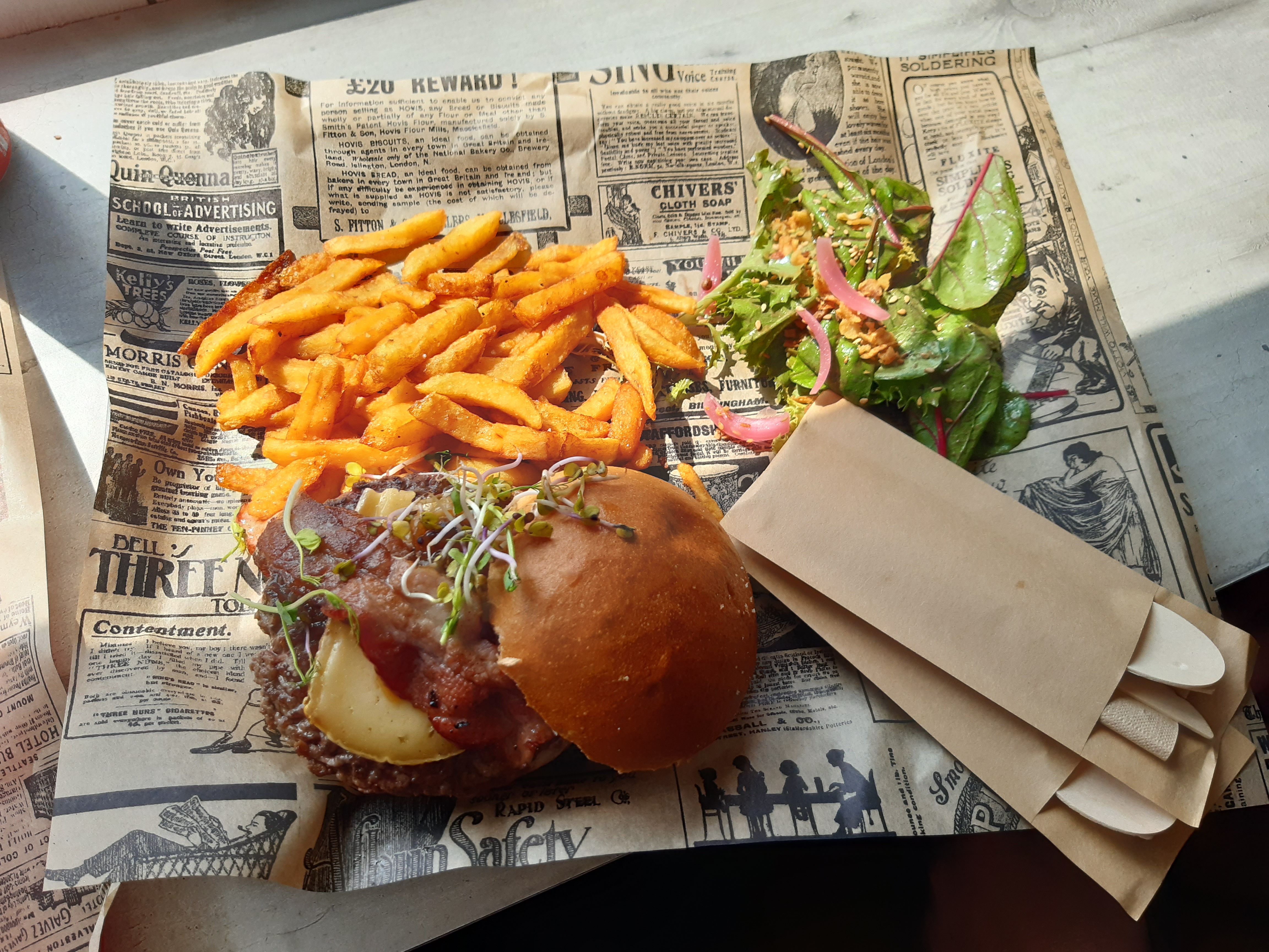 Une bonne découverte après une grosse journée de vélo. Je me suis laissé tenter par le burger local andouille camembert. C'était super bon.
