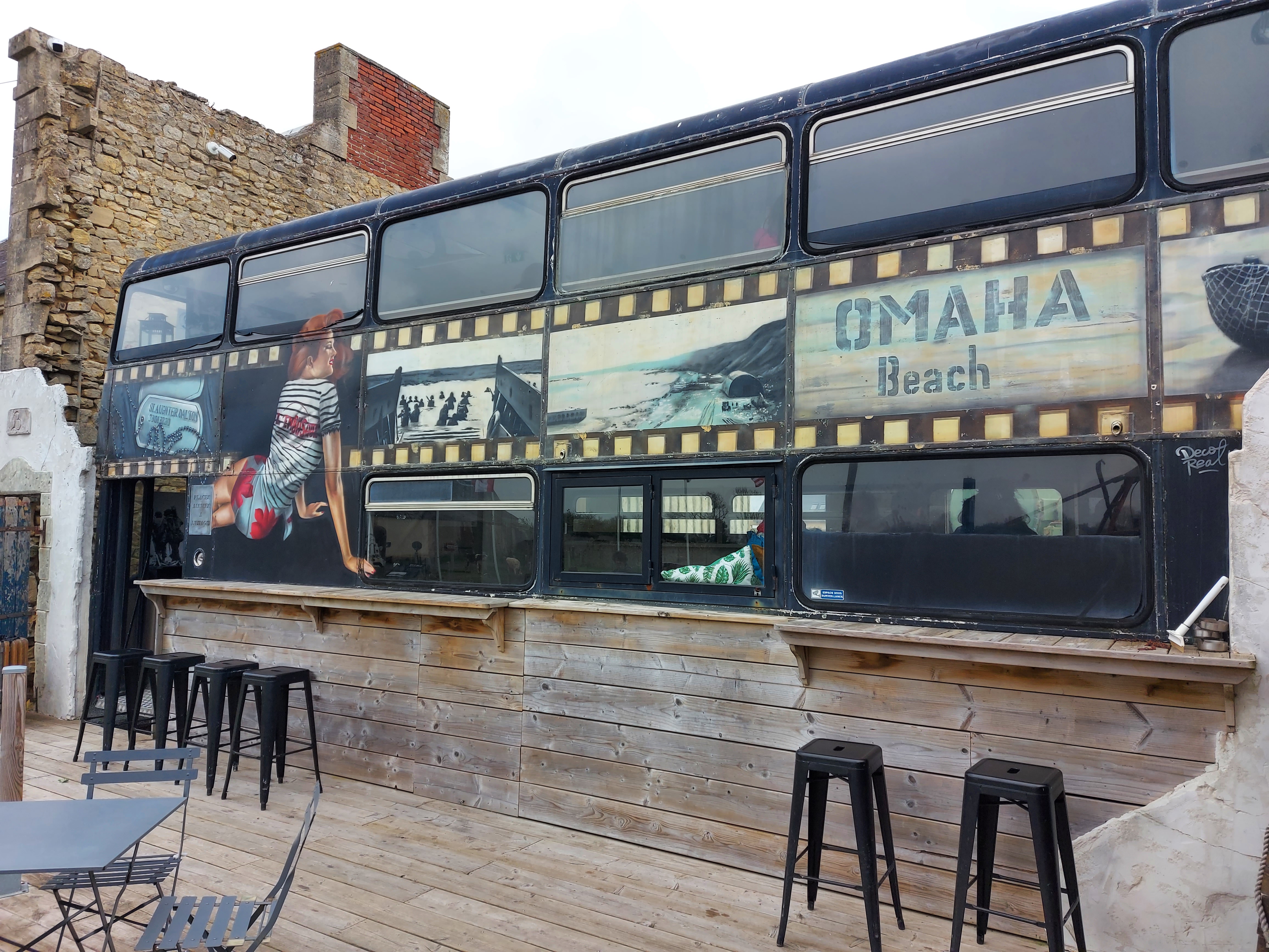 A côté d'un musée sur le bord de la route de Omaha beach. Restaurant avec bus aménagé avec photos noir et blanc, platine de disque. Avec une terrasse. Recommandation le burger normand andouille camembert avec la bière locale de formigny. Bravo bel endroit.