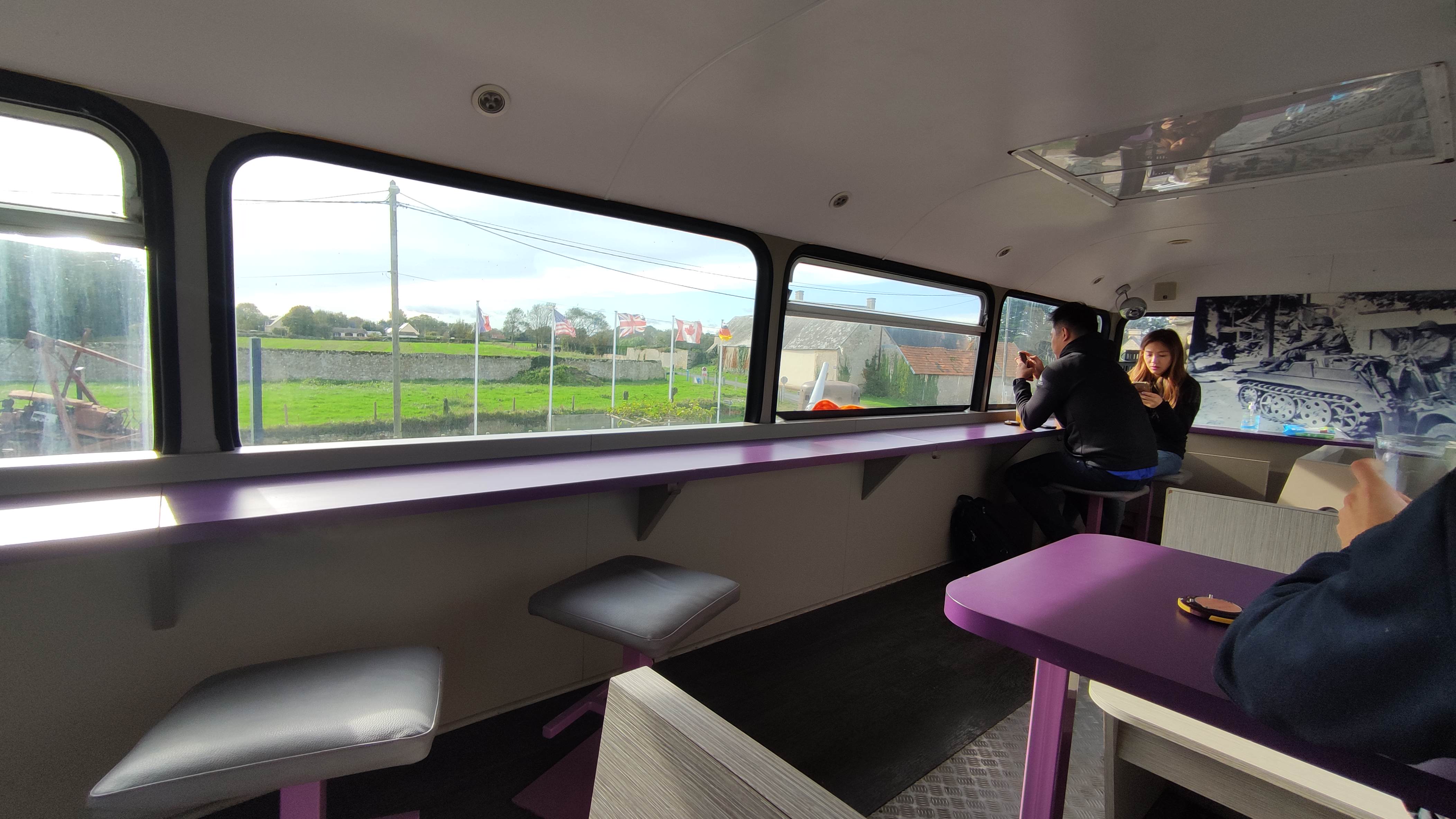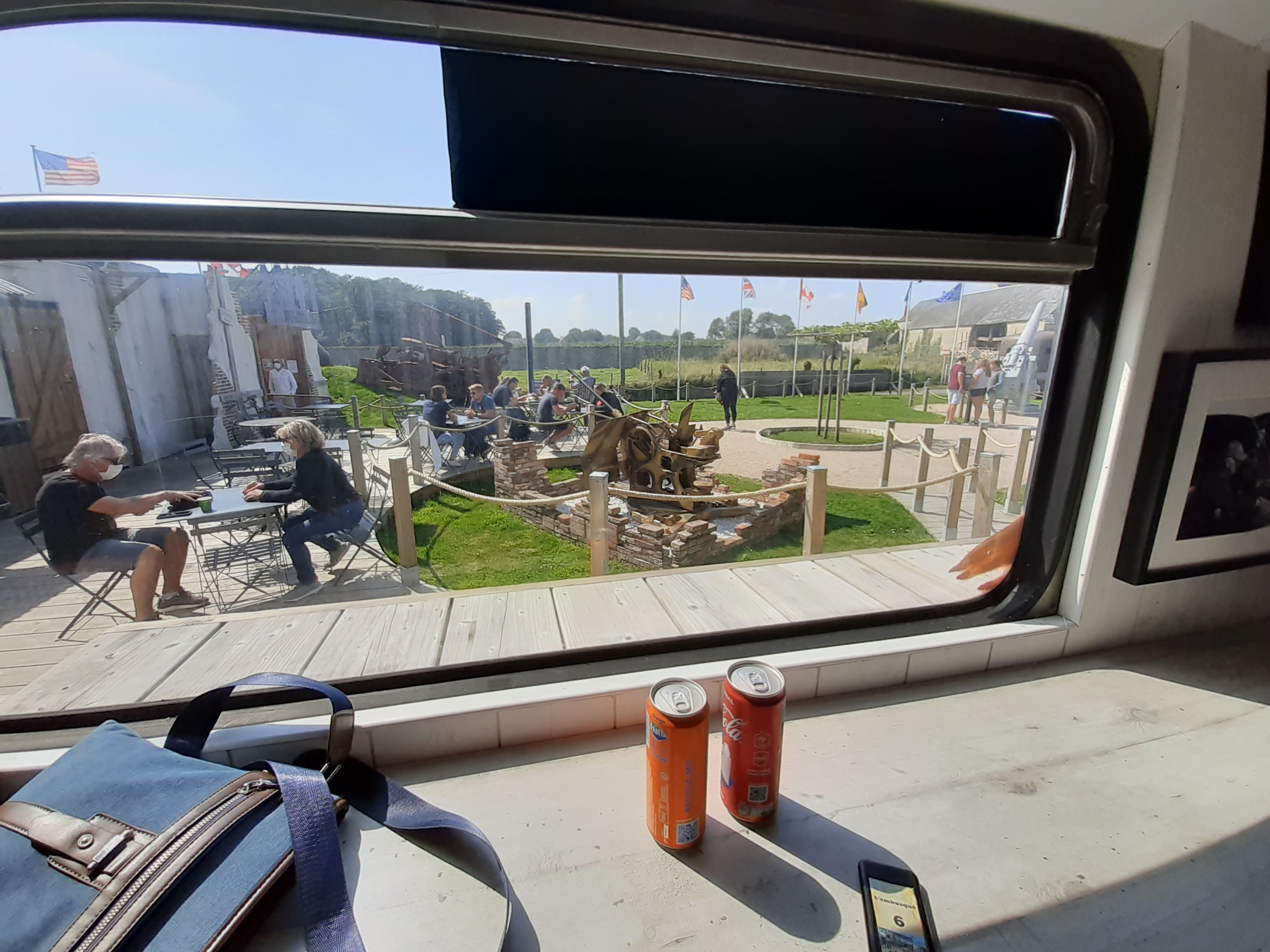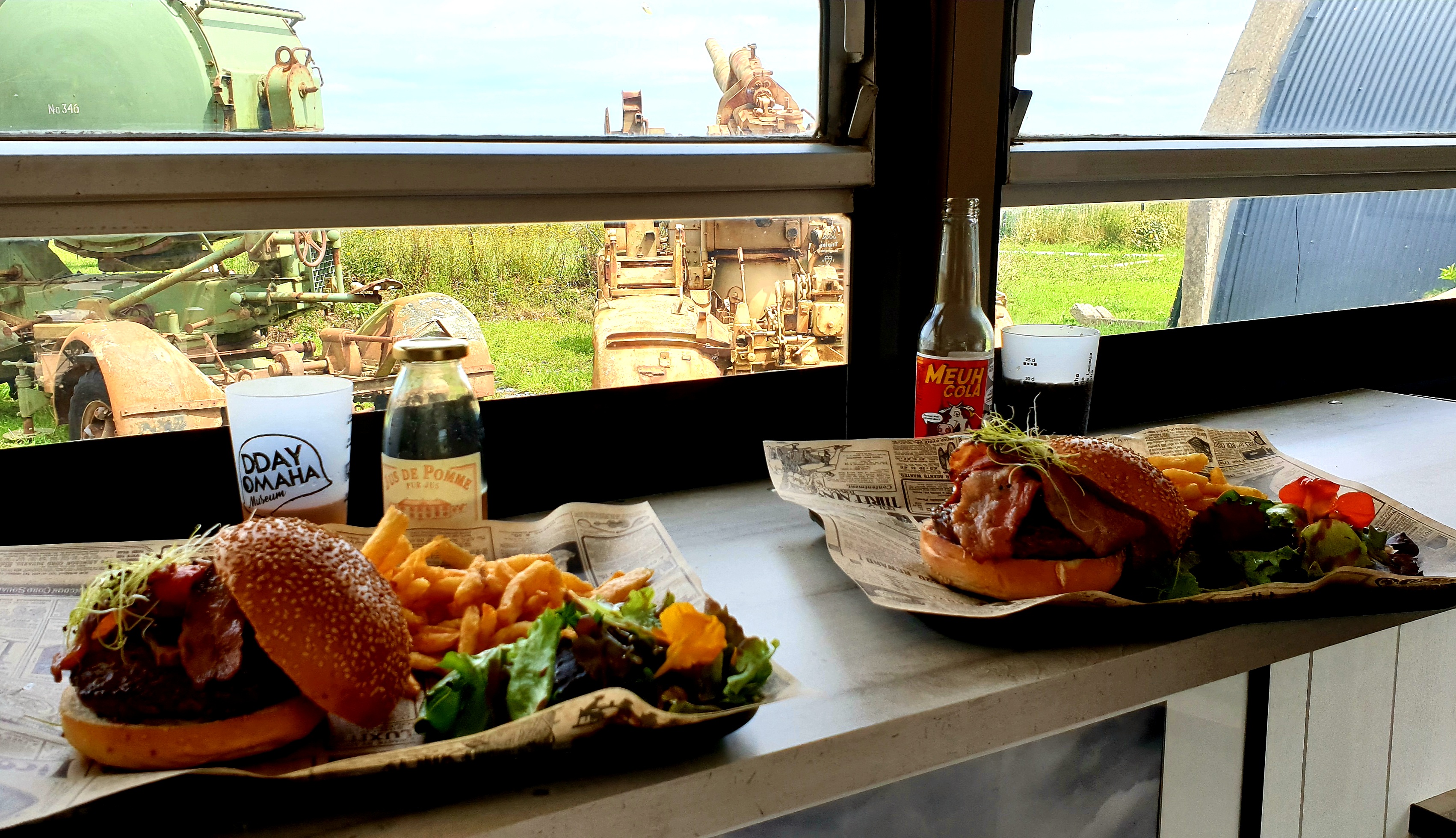 L'endroit est génial, manger dans un bus avec vu sur les canons, les bateaux de débarquement et la mer au loin, service rapide, le burger est délicieux, la quantité est la, manque peut-être quelques dessert et par soleil il fais vraiment chaud dans le bus