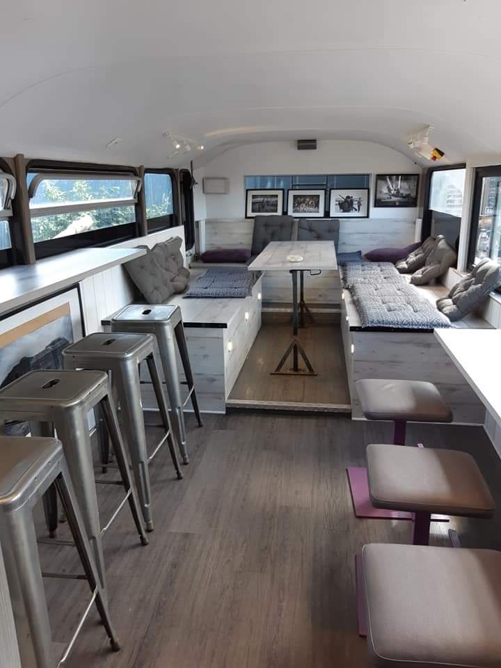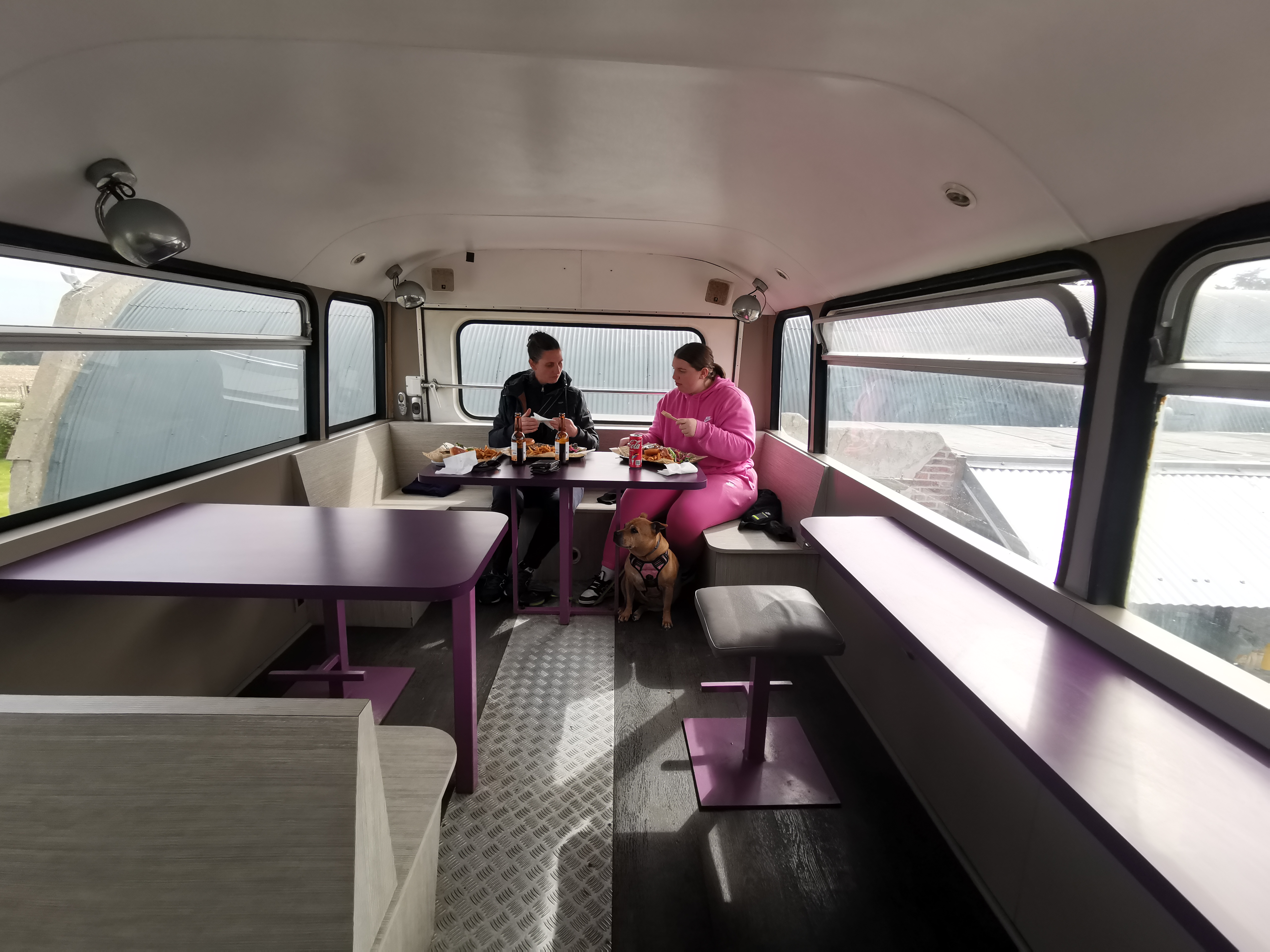 Salle atypique aménagée dans un bus. Espace cosy au rdc ! Excellent repas, les frites maisons sont excellentes. La table sur la zone cosy n’est pas stable mais sinon c’est très bien. Les animaux sont acceptés.