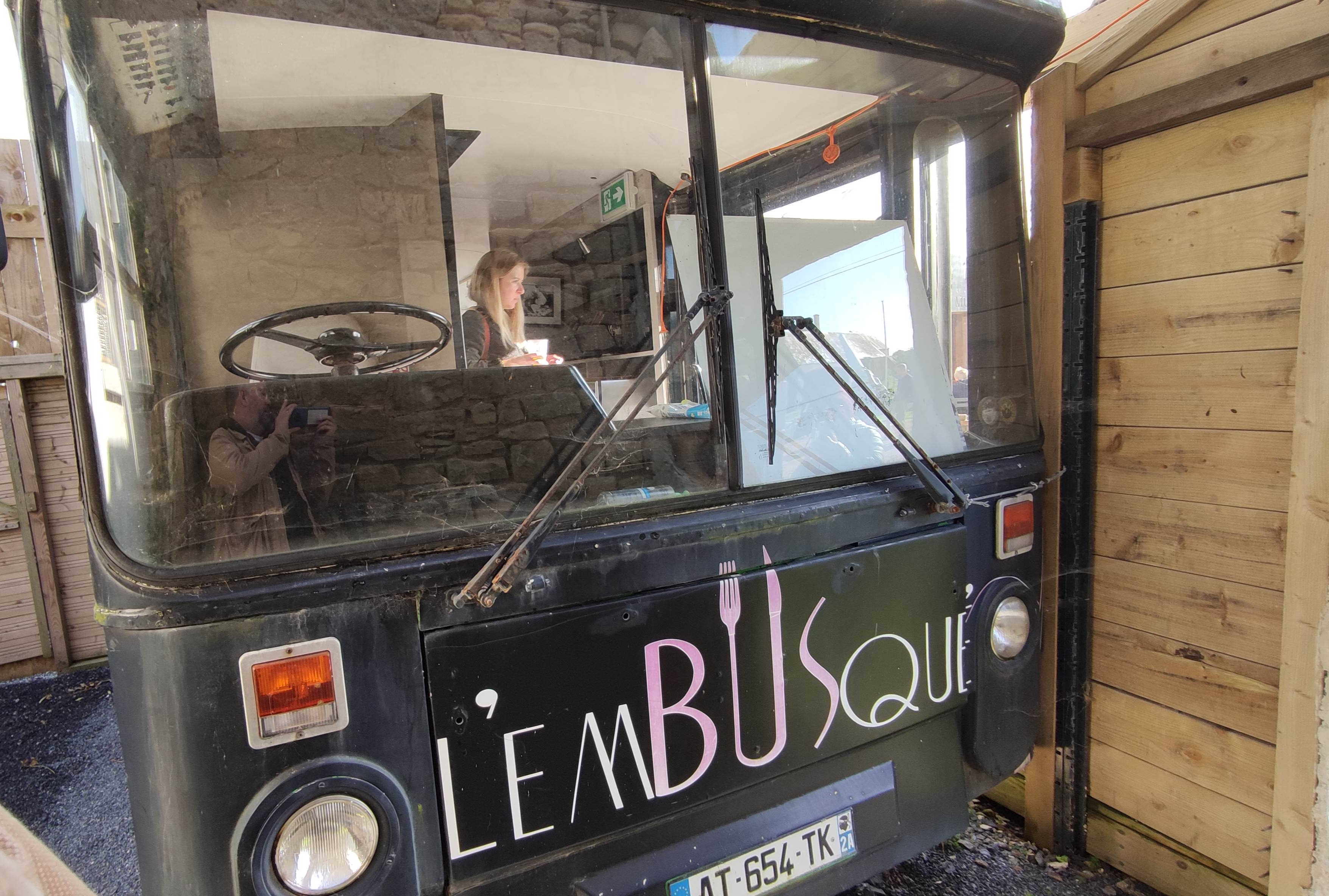Lieu Atypique, bus aménagé où l'on peut s'asseoir pour se restaurer, mais vu le temps nous avons déjeuné à l'extérieur. La carte est réduite, mais les mets sont frais et certaines boissons sont locales. J'ai pris une salade au poulet très bonne, (12€). Je regrette juste de ne pas avoir pris de frites avec, car j'avais encore faim en sortant de table et pas de pain en accompagnement. Mon fils et mon époux ont choisi qd à eux un burger normand (steack/andouille/camembert..) Et un classique (steack/bacon..) les deux accompagnés d'une poignée de frites et salade au tarif de 15€. En boisson, jus de pomme et bière locale. Une étoile en moins pour le peu de frites servie.