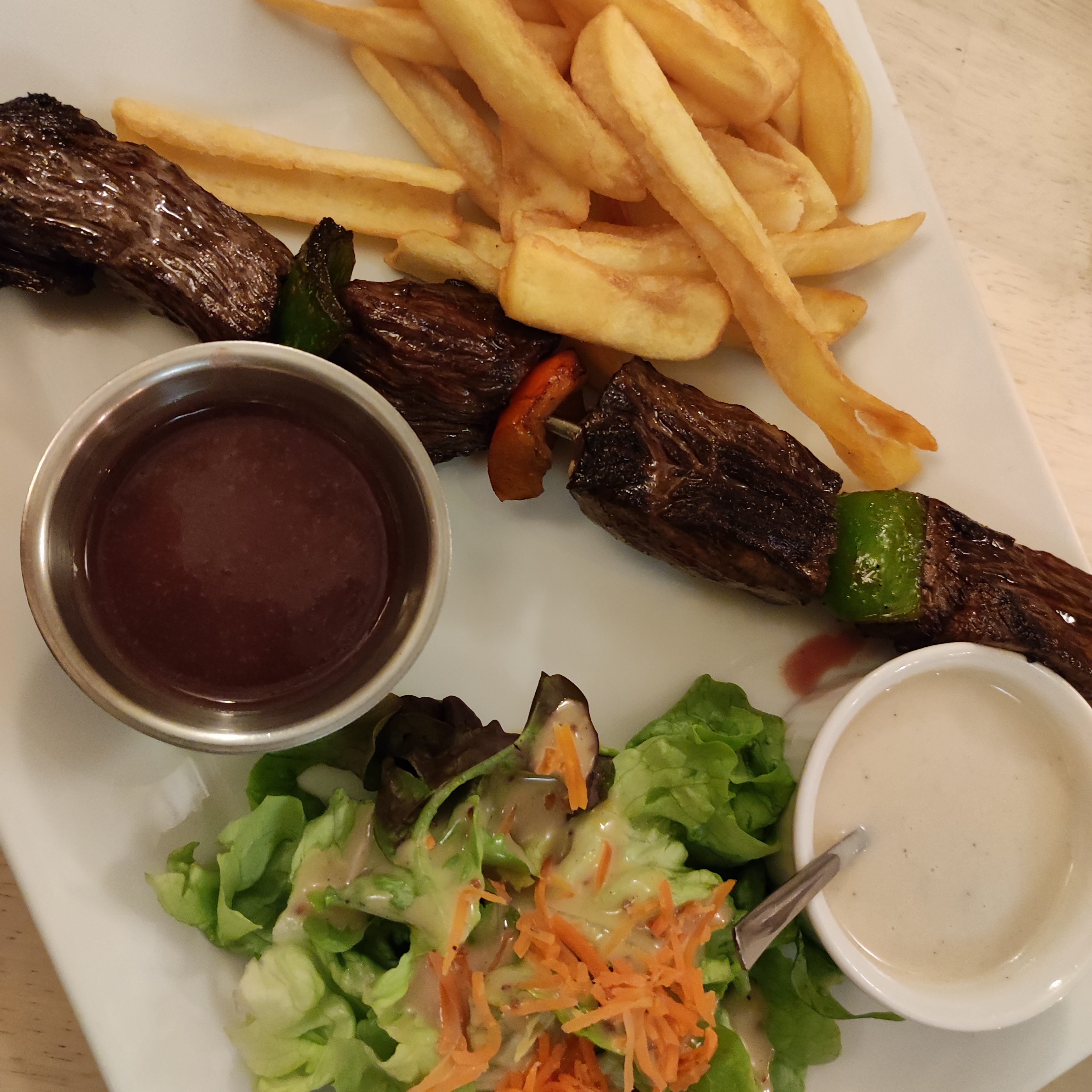 Excellent restaurant avec un concept de brochettes variées (poissons ou viandes) et préparées de façon très savoureuse. Il est également possible de déguster de très bonnes salades. Les plats sont copieusement servis, accompagnés d’un crémant si vous faites ce choix. L’accueil est soigné dans un cadre très bien aménagé et spacieux. Les desserts sont également de qualité notamment le tiramisu spéculos poire et le café gourmand. Les prix sont très corrects. Immanquable lors de votre visite à Chalon-sur-Saone.