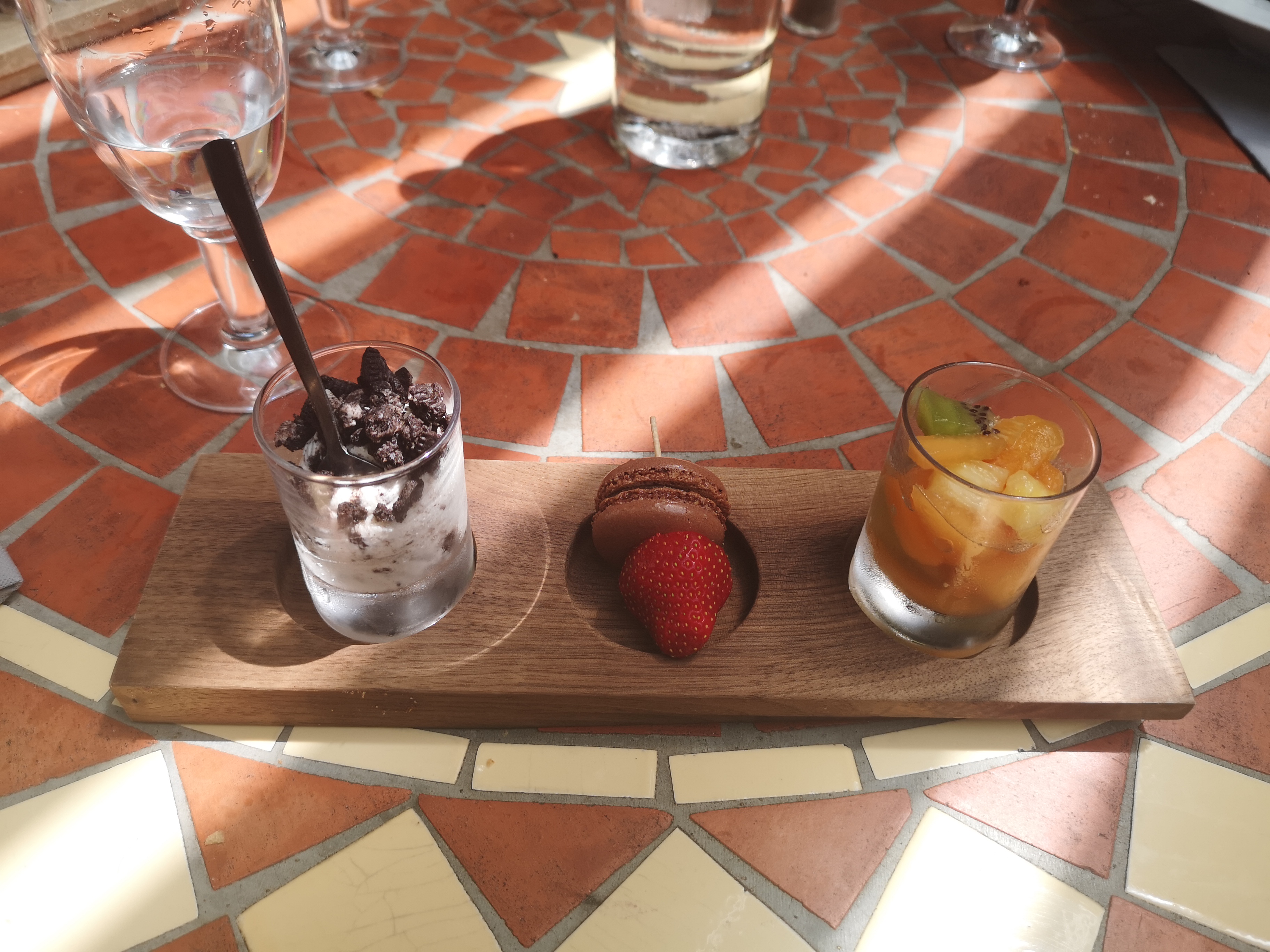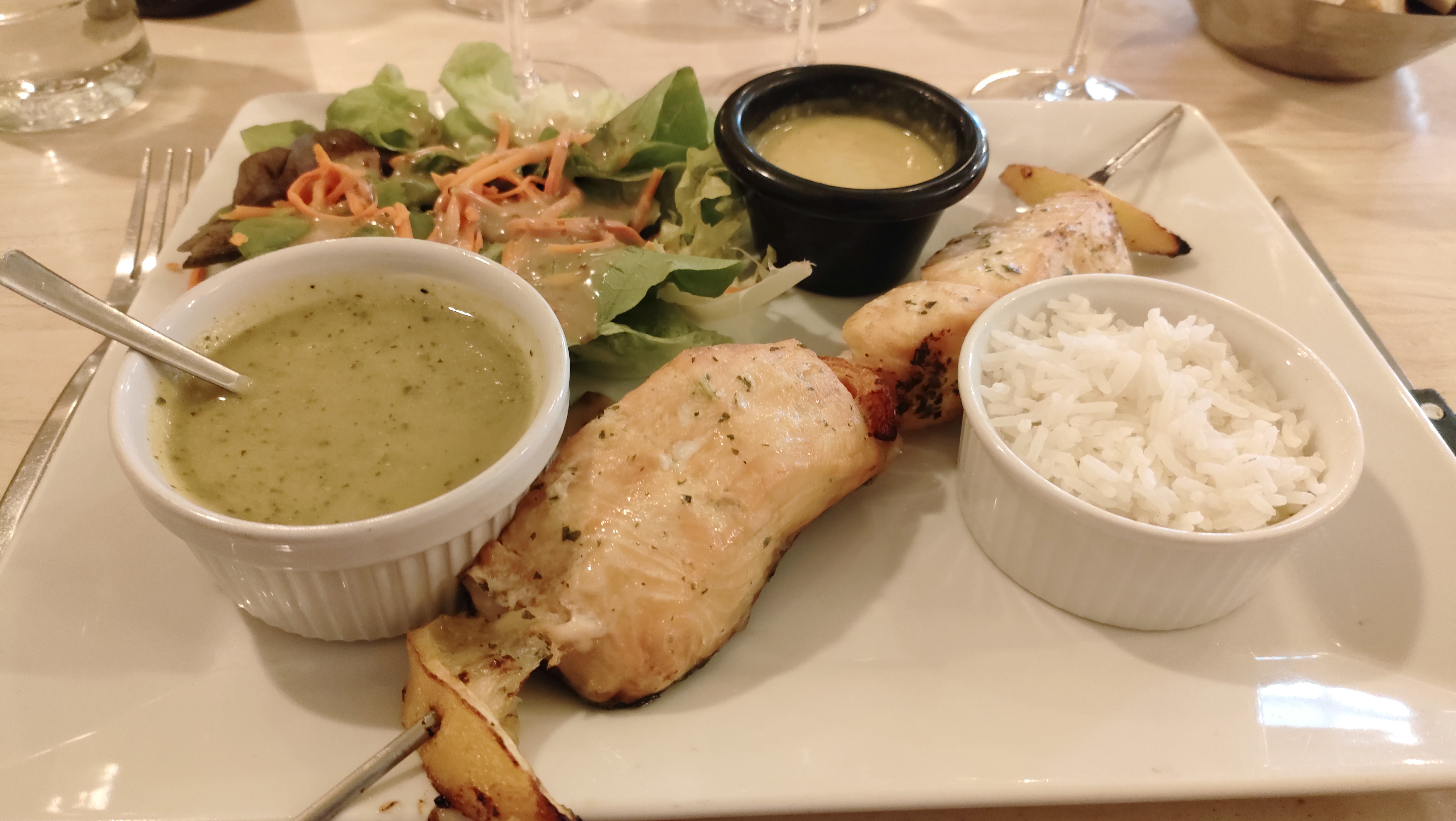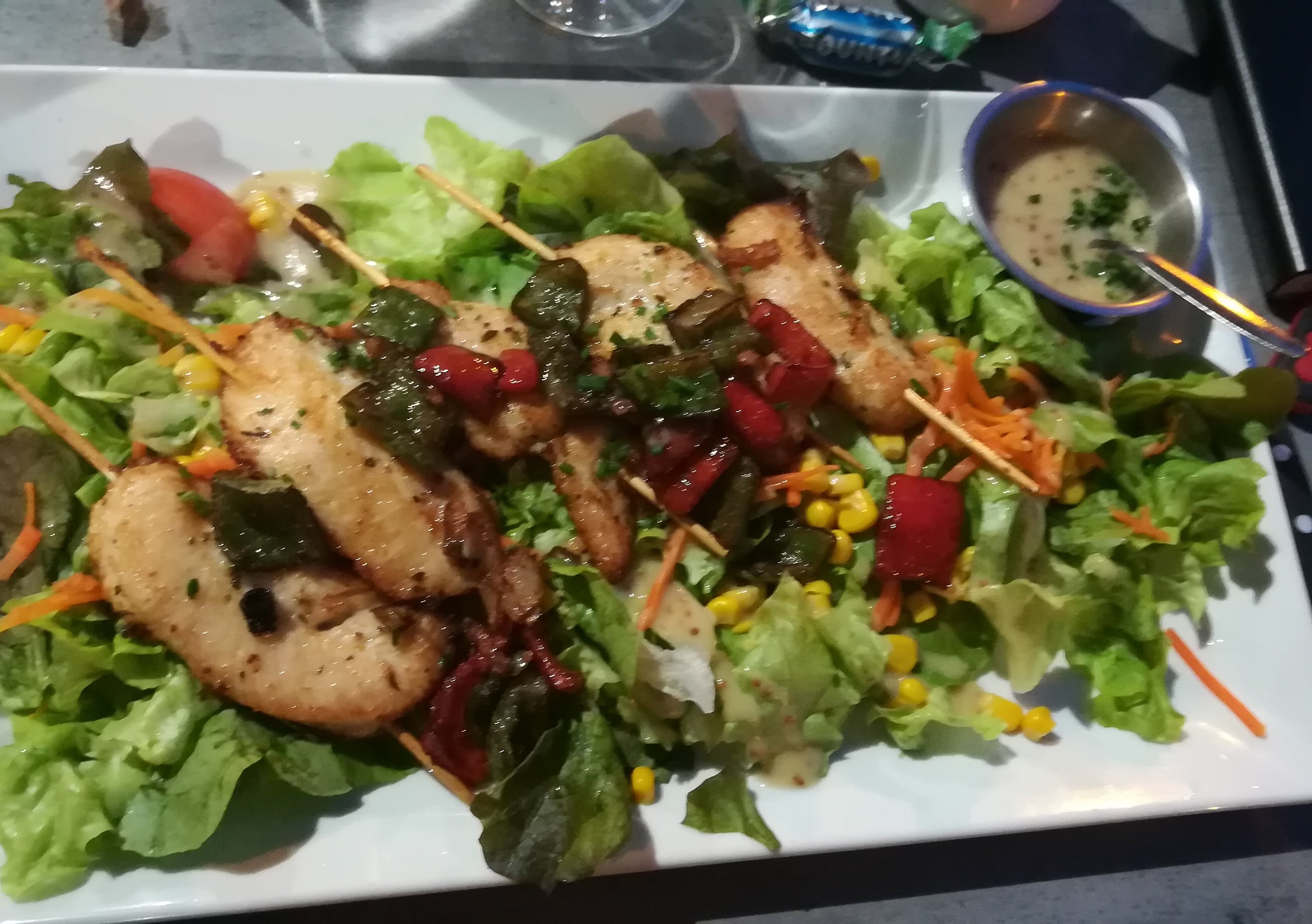 Brochettes de saumon délicieuses... Dessert gourmand et des serveurs tout à fait disponibles... d autant que nous étions avec des enfants et que nous avons eu plusieurs demandes😊 Merci