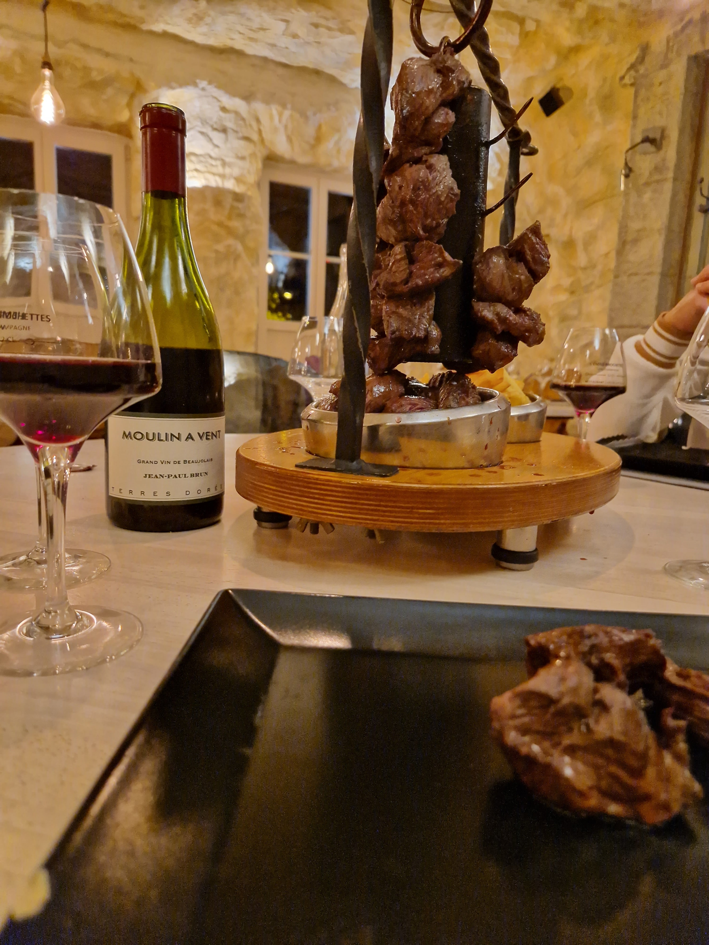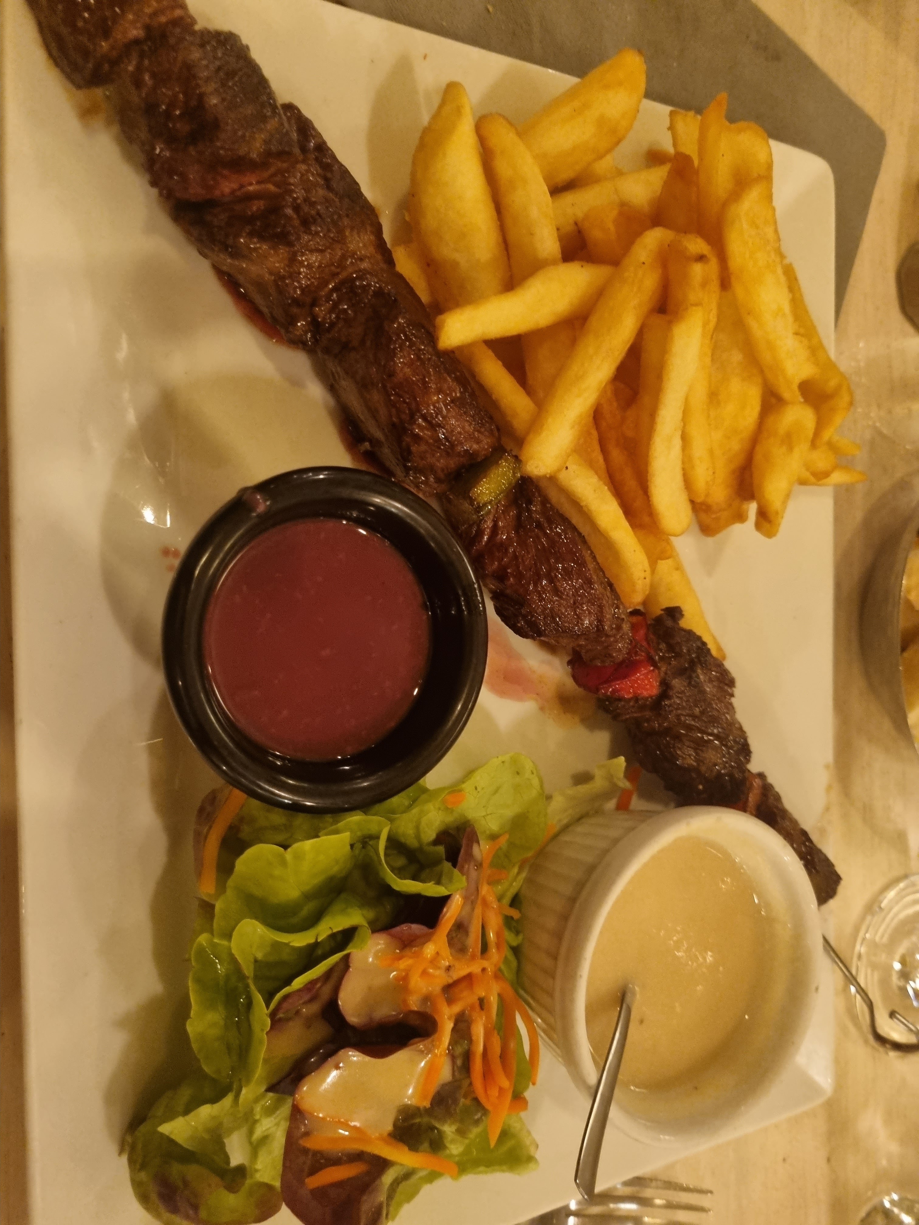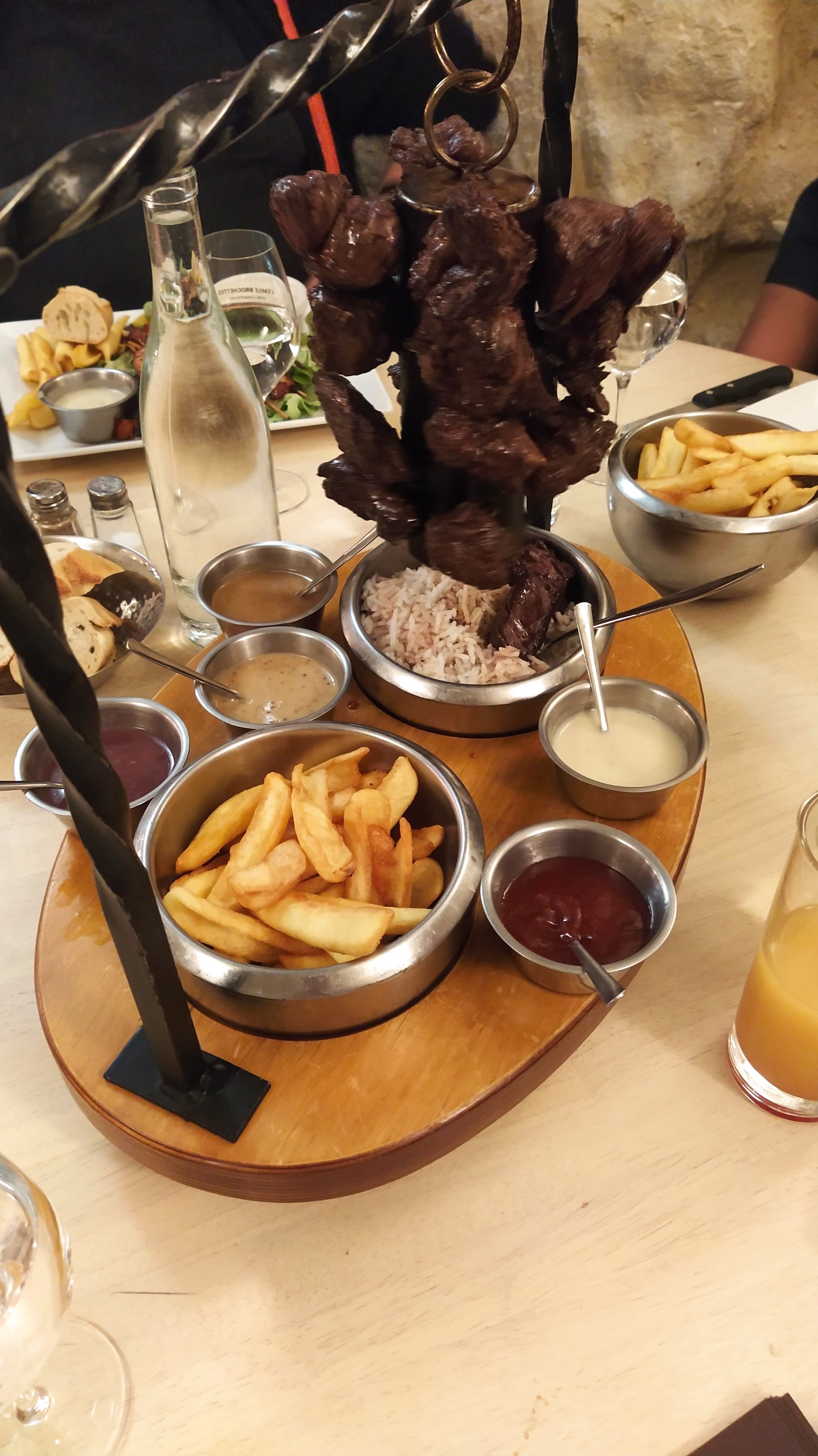 Découverte de ce restaurant un soir de semaine. Tout d'abord le décor intérieur est très beau, vous entrerez dans une cave à vin creusée dans la roche. L'ambiance qui est dégagée est agréable. Vous aurez un large choix de spécialités de brochettes ainsi qu'une grande carte des vins. Le service a été correct. Au niveau de la cuisine nous avons tout deux apprécié nos plats, les cuissons des viandes sont maîtrisées. Je n'y reviendrai pas tous les jours mais j'ai passé un bon moment.