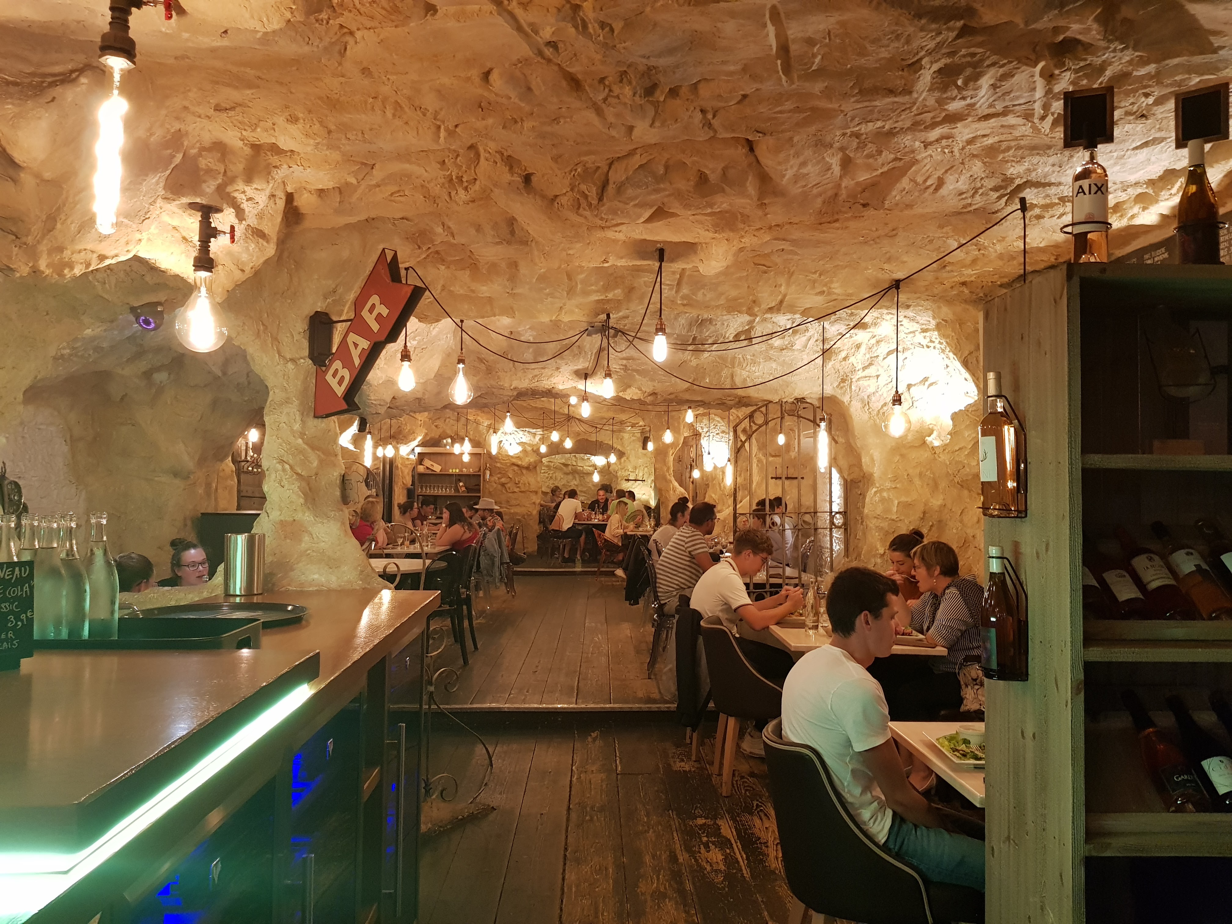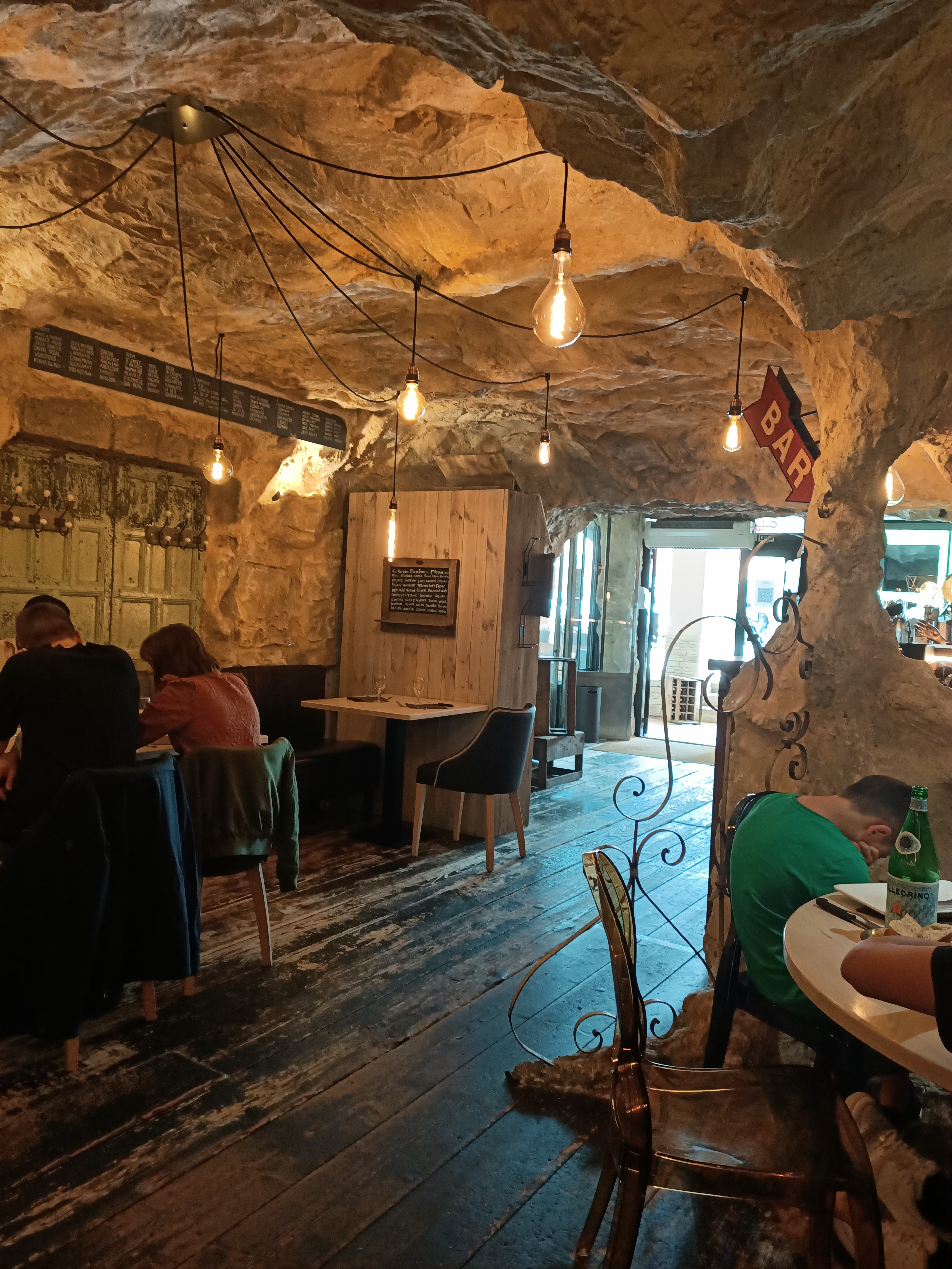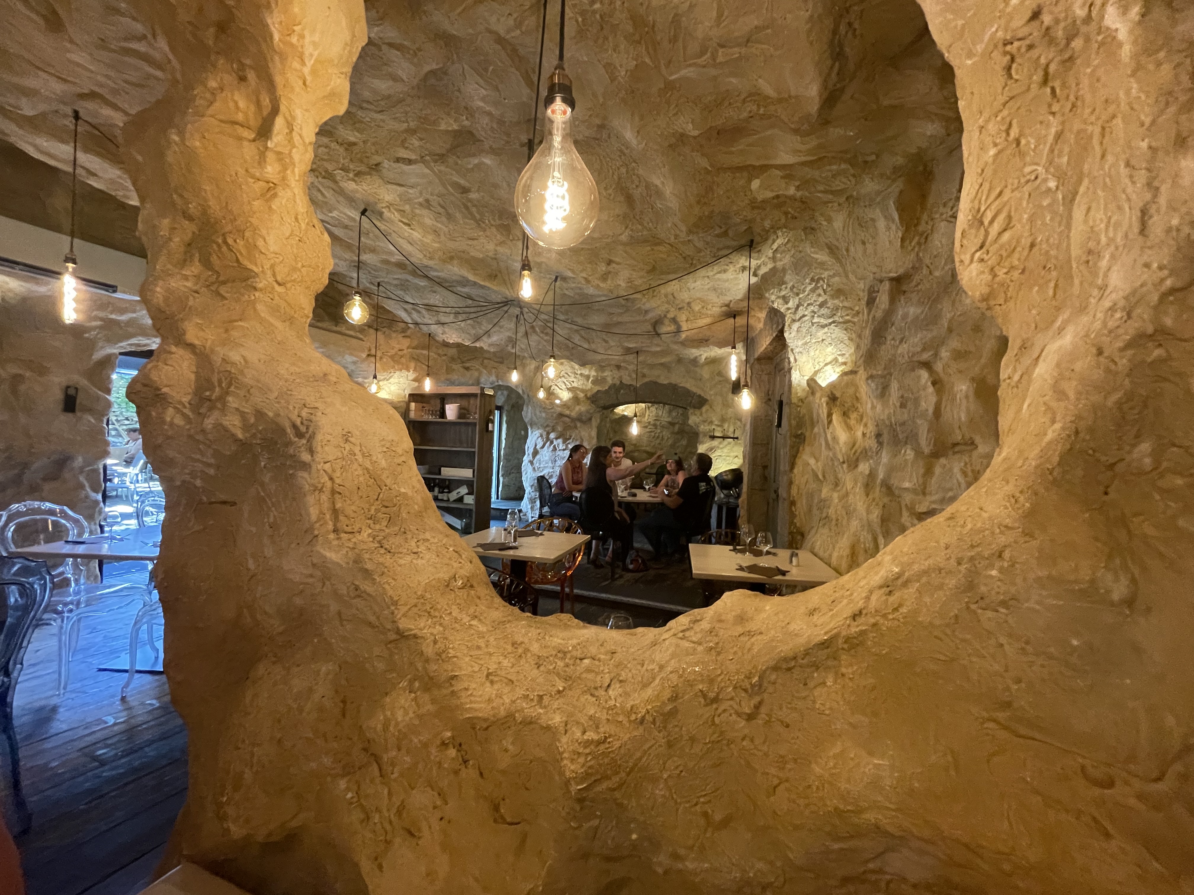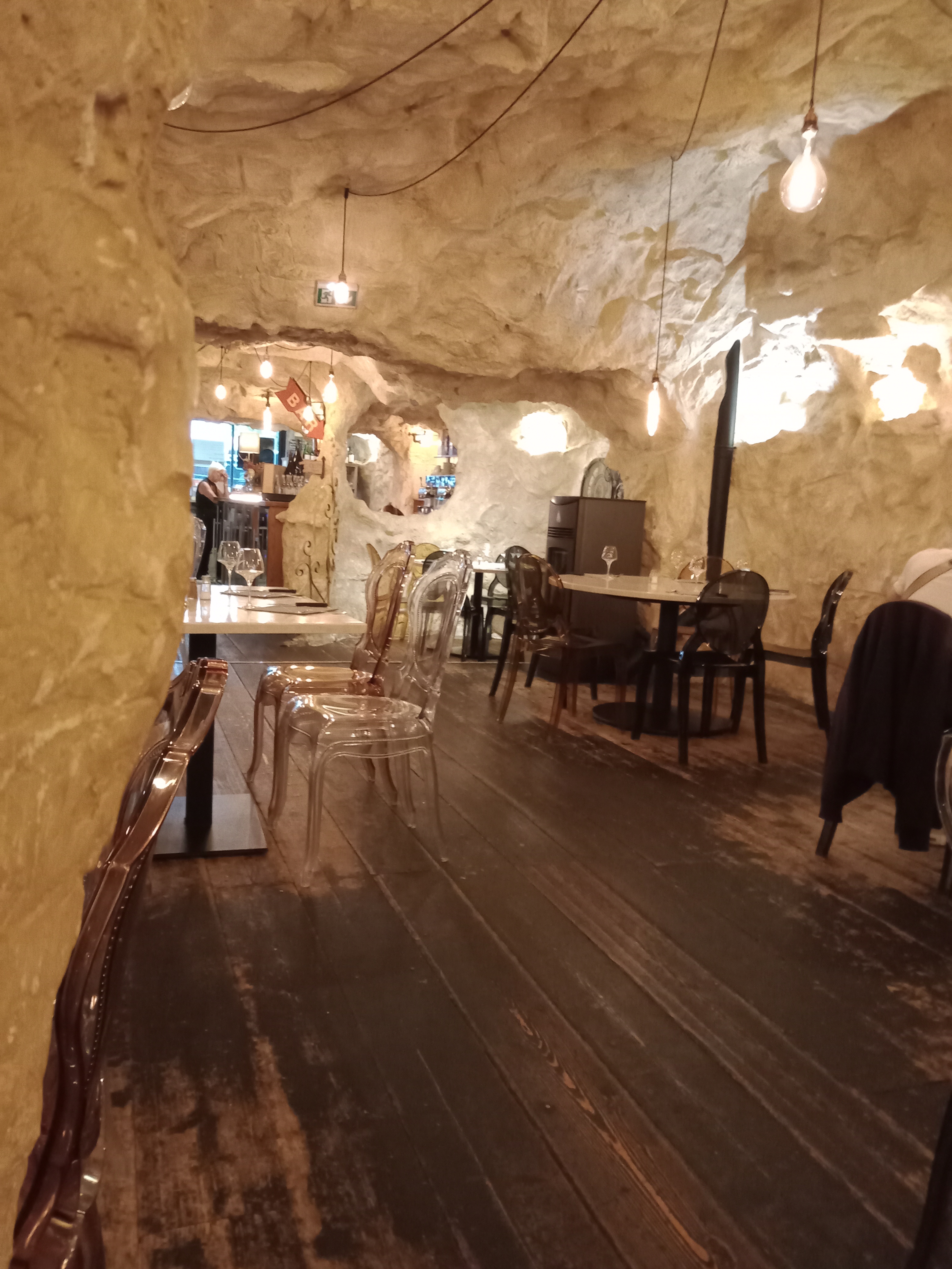 Un restaurant avec une décoration type caverne, un bon service, un bon accueil au plaisir