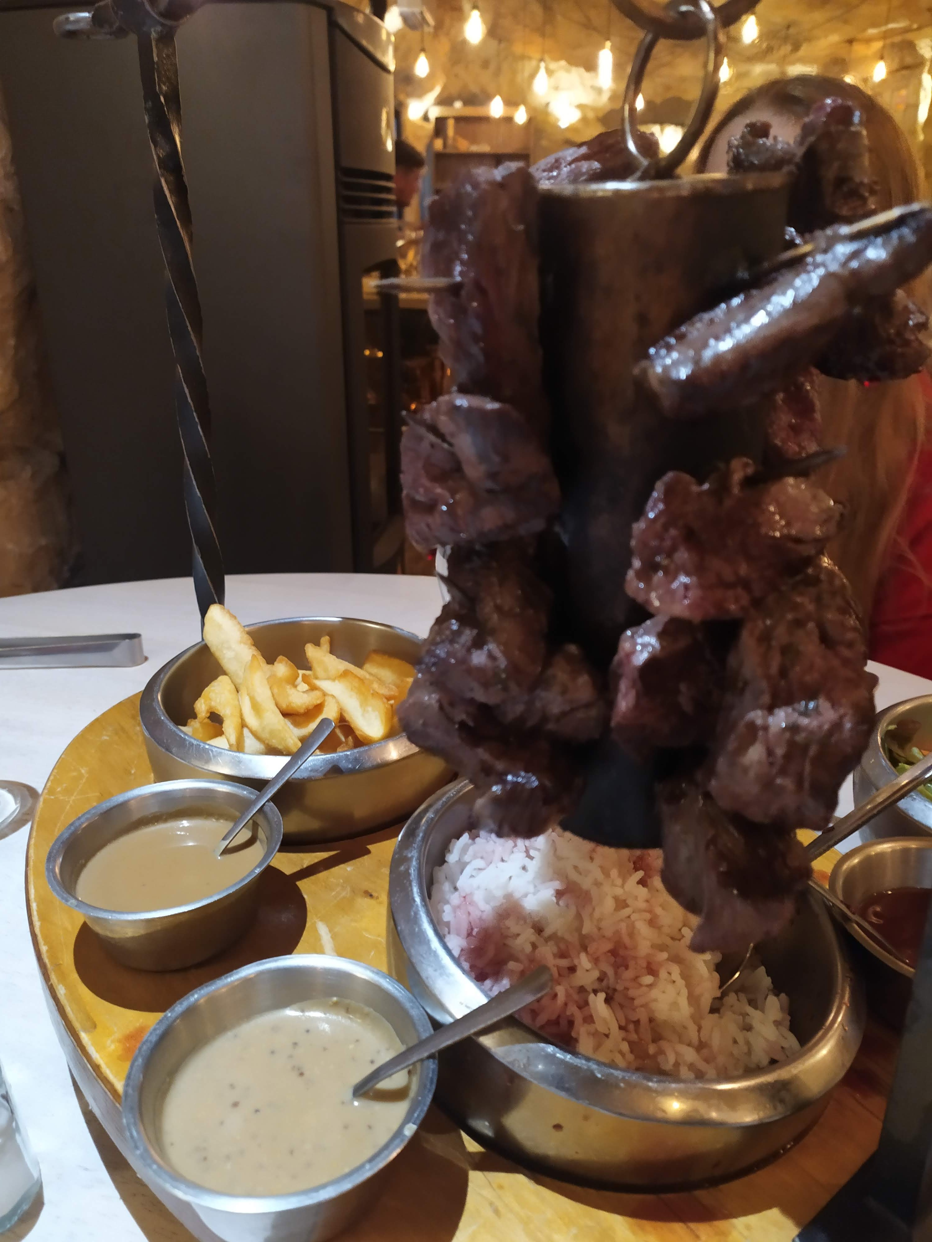 Un endroit très joli, voûté comme dans une grotte, bien illuminé, côté déco, rien a dire c'est très beau. Repas très bon avec une étoile de plus pour le camembert pané qui est un délice. Une multitude de choix de brochettes qui ont l'air toutes autant délicieuses les unes que les autres. Cependant j'ai trouvé qu'il n'y avait pas énormément de choix au niveau des dessert, un peu basique. Une étoile en moins car lors de ma réservation, on m'a demandé de quitter les lieux avant 21h30 ... Ça ne se fait pas!! Par contre, réservation vivement recommandée!
