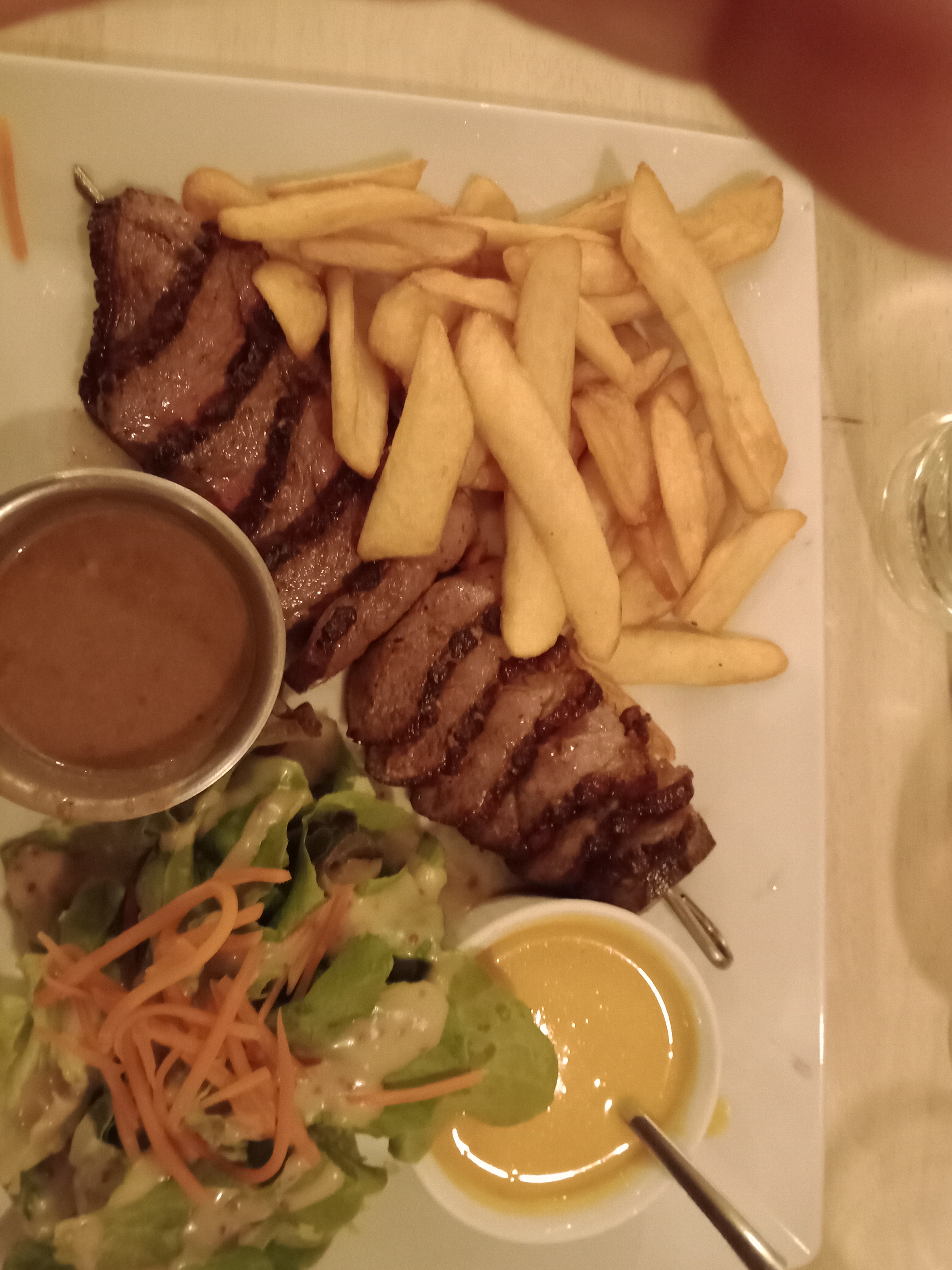 Très bon repas, copieux ET de qualité. Concept de brochettes. Camembert pané, Morteau, poulet ... Menu enfant avec un véritable morceau d'onglet par exemple... Service rapide et efficace ( pas besoin de demander 3 fois du pain !) Petit patio très tranquille à l'intérieur.