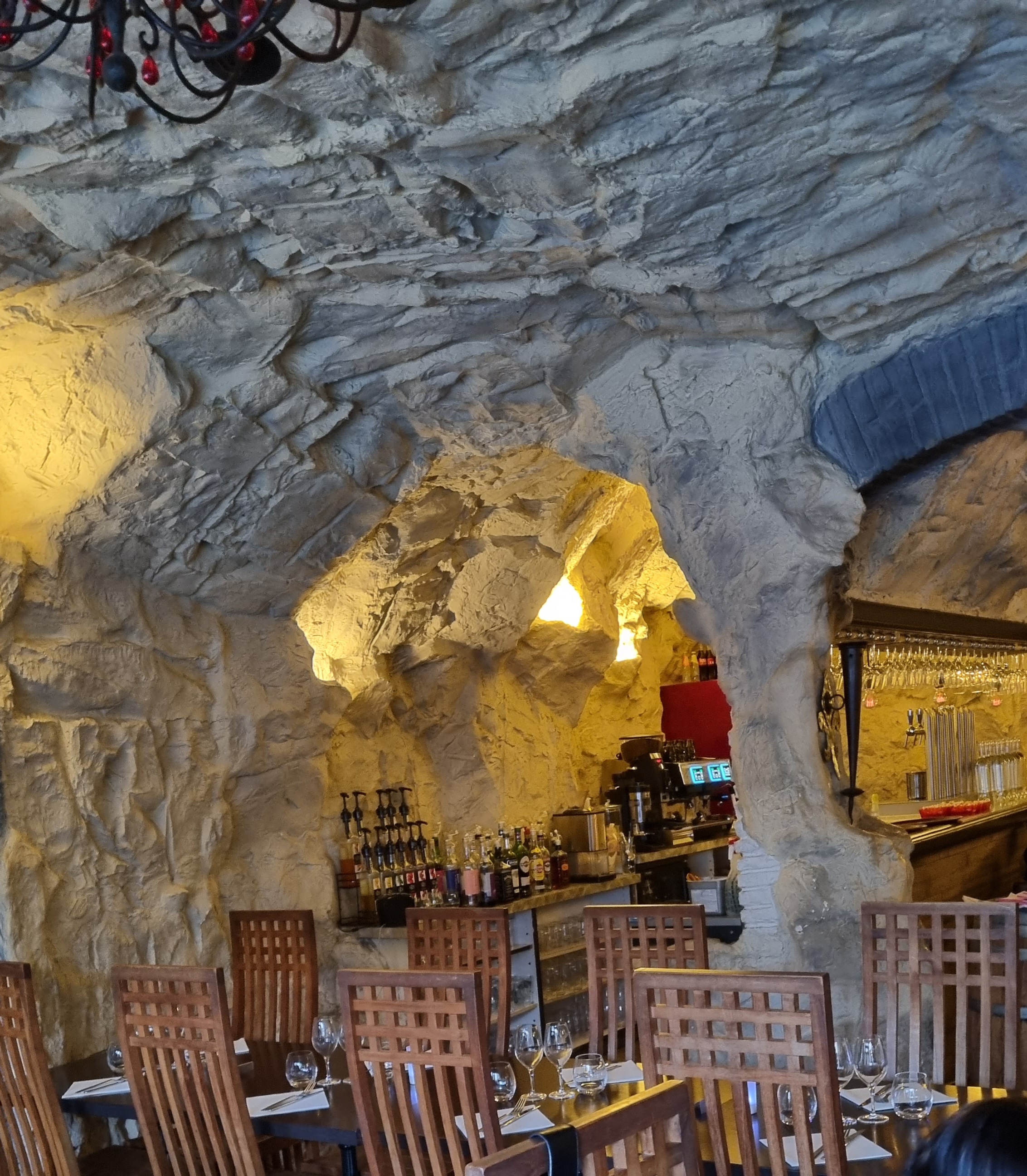 J'ai découvert ce lieu ce soir , invitée par mon Valentin pour la circonstance, très atipyque : une grotte superbe, j'adore les lustres, ambiance feutrée, musique, service impeccable et serveuse souriante et agréable, délicieux repas servit rapidement.