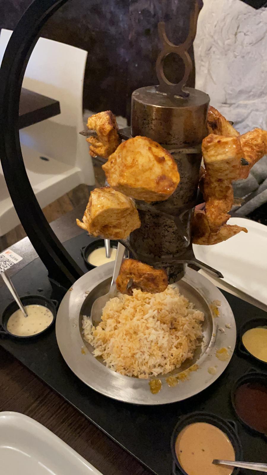 Réservation pour trois personnes. A notre arrivée nous avons demandé la possibilité de prendre deux viandes poulet et bœuf sur la même potence ce qui nous a été refusé. Nous avons donc décidé de prendre deux potences pour trois. A l arrivée de celles-ci il n y avait que quatre pics present sur la potence,sur lesquels était plantés le poulet, les autres étant cassés, le reste du poulet était dans le saladier de riz en dessous. Interpellant le serveur, celui-ci me dit ne pas être choqué par cette pratique. Qu en est il lorsqu'on commande une brochette.... ce qui confirme que la viande n est pas cuite sur la potence et qu il aurait pu faire l effort de nous la proposer en saladier comme cela a été le cas.