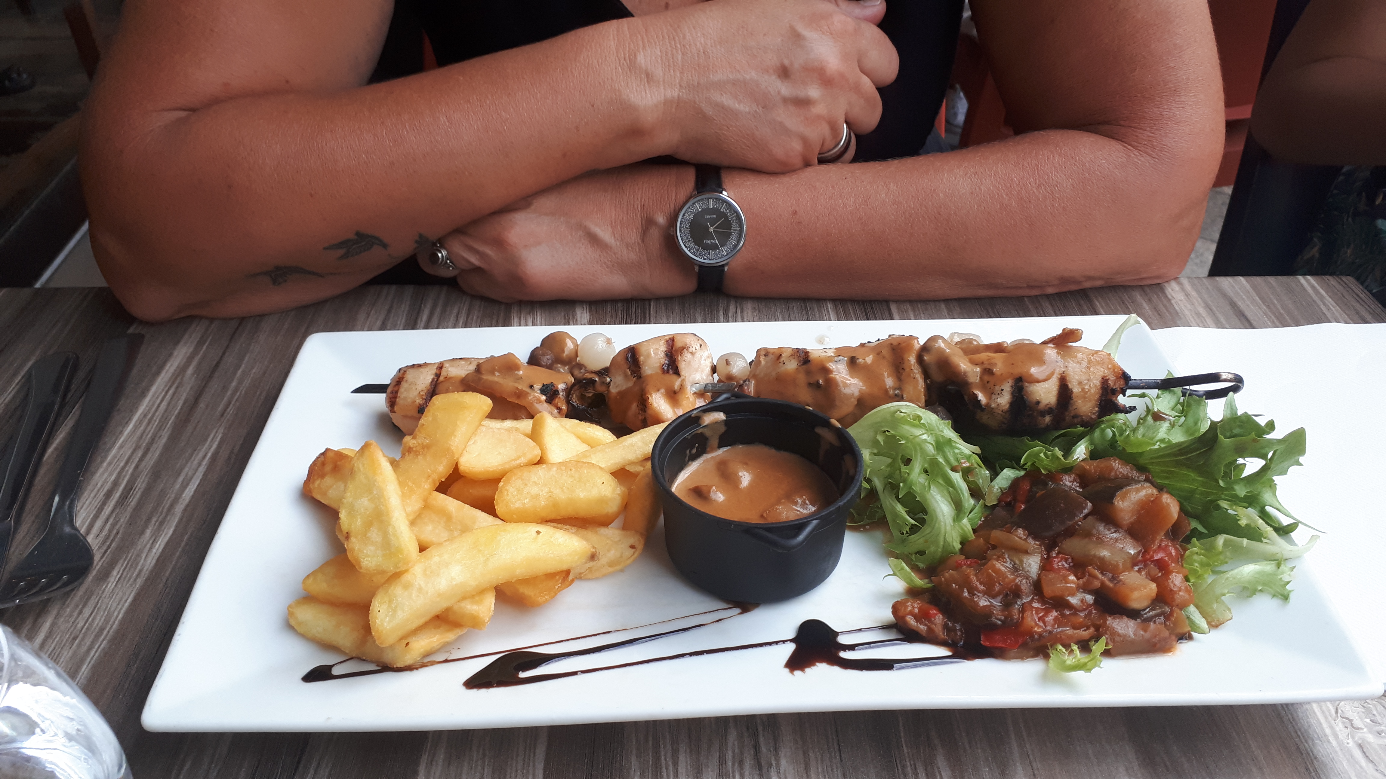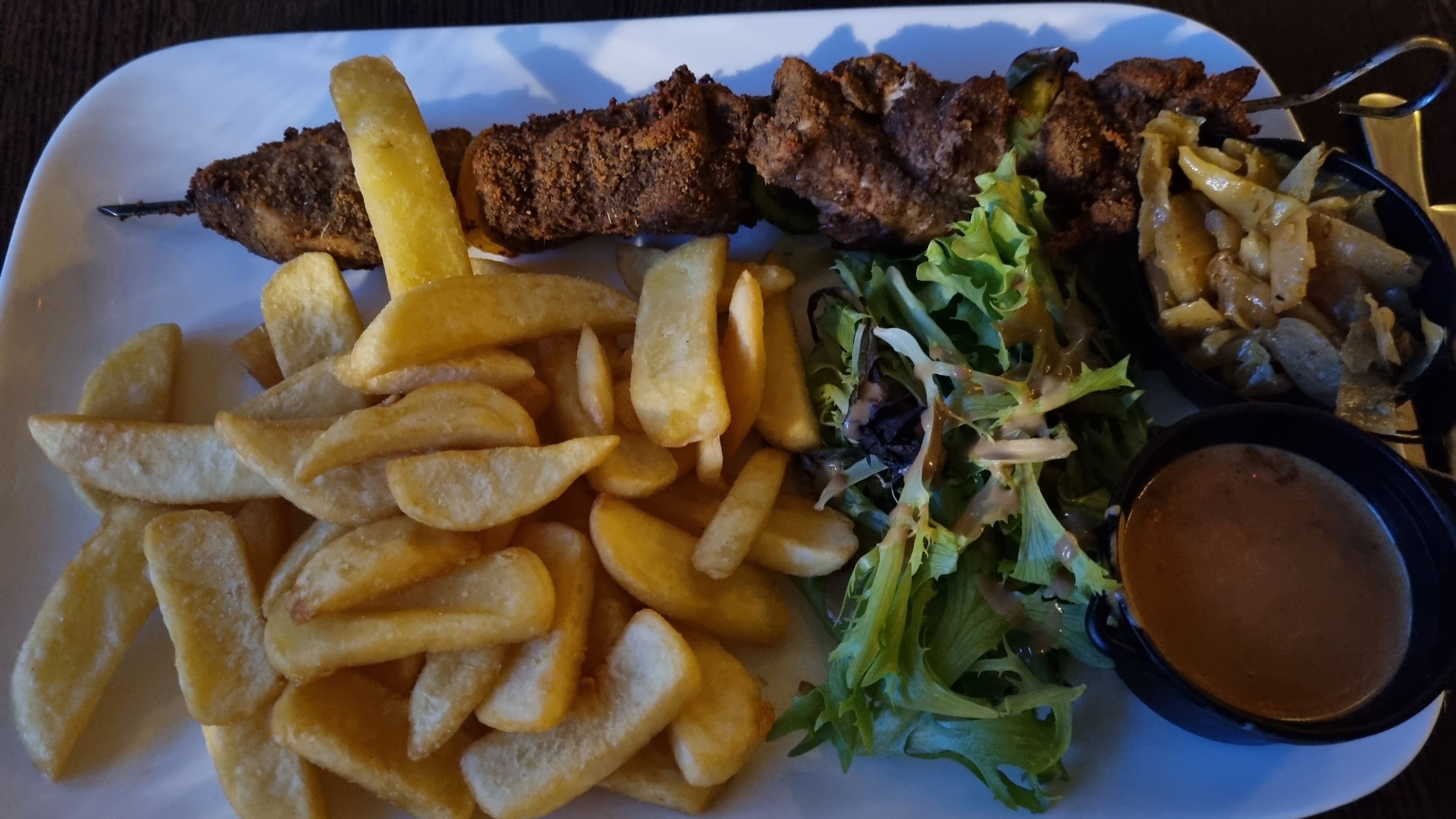 Le concept est alléchant. Néanmoins, serveur moyennement aimable. Brochette sèche et sûrement cuite au four. Les frites n'étaient pas suffisamment cuite et les légumes ont été ajoutées pour faire légumes mais n'allaient absolument pas avec le reste. Bref nous sommes rapidement partis.