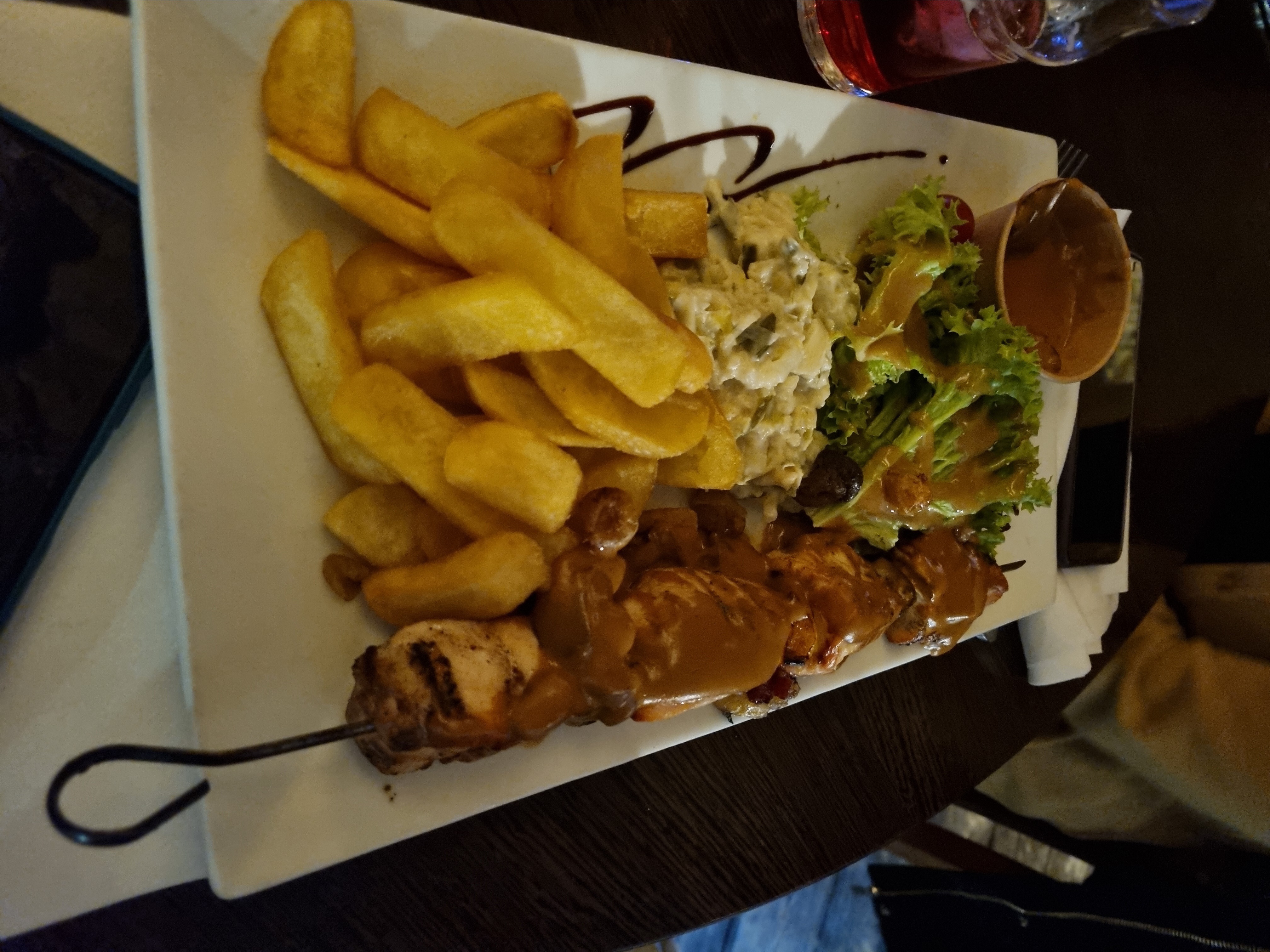 Tout était excellent ! Le cocktail sans alcool était bon. La brochette de poulet façon grand-mère était excellente ! La cuisson était vraiment parfaite, le poulet tendre, la sauce super bonne et les frites également. En dessert les profiteroles étaient succulentes ! Concernant le service, il a été rapide et l'ensemble des serveurs/serveuses étaient agréables et souriants. Je recommande vraiment.