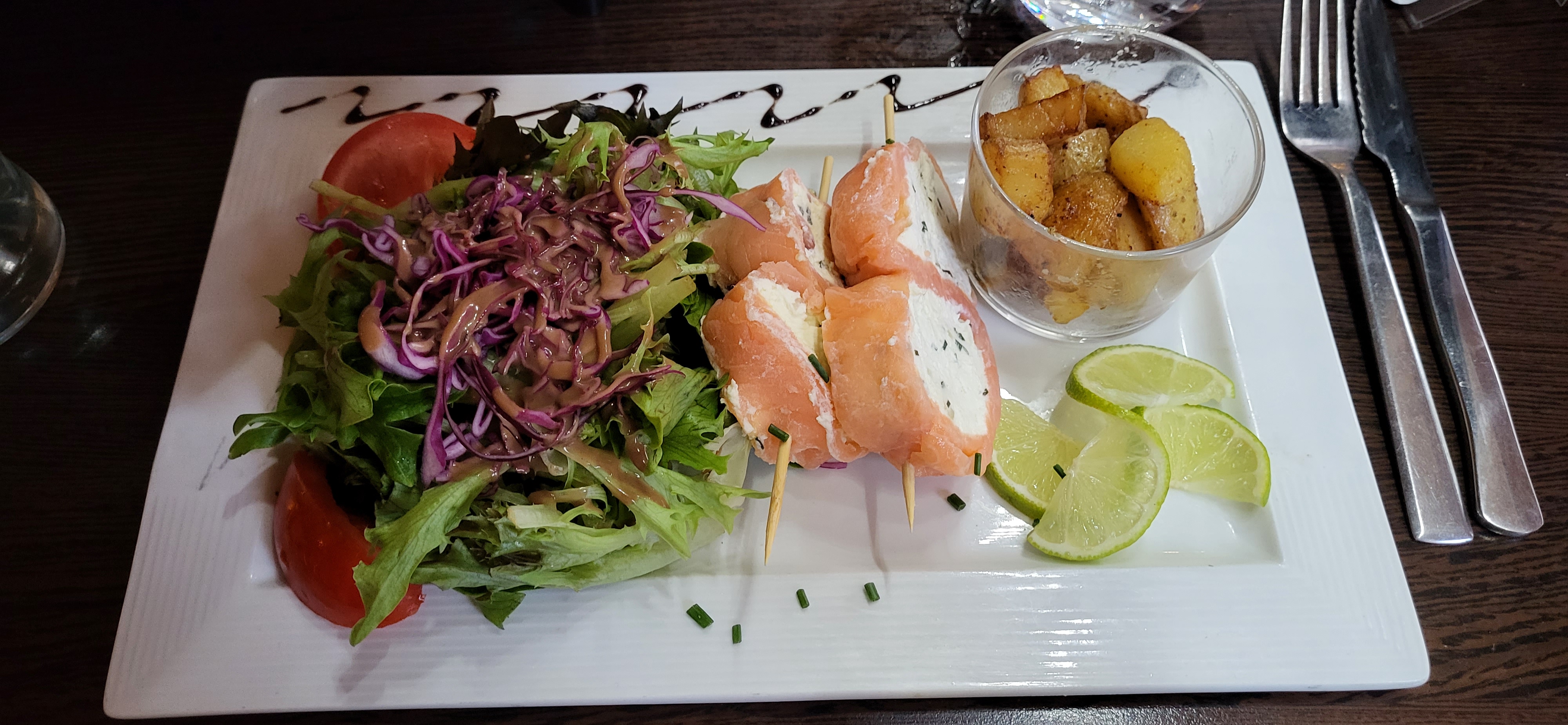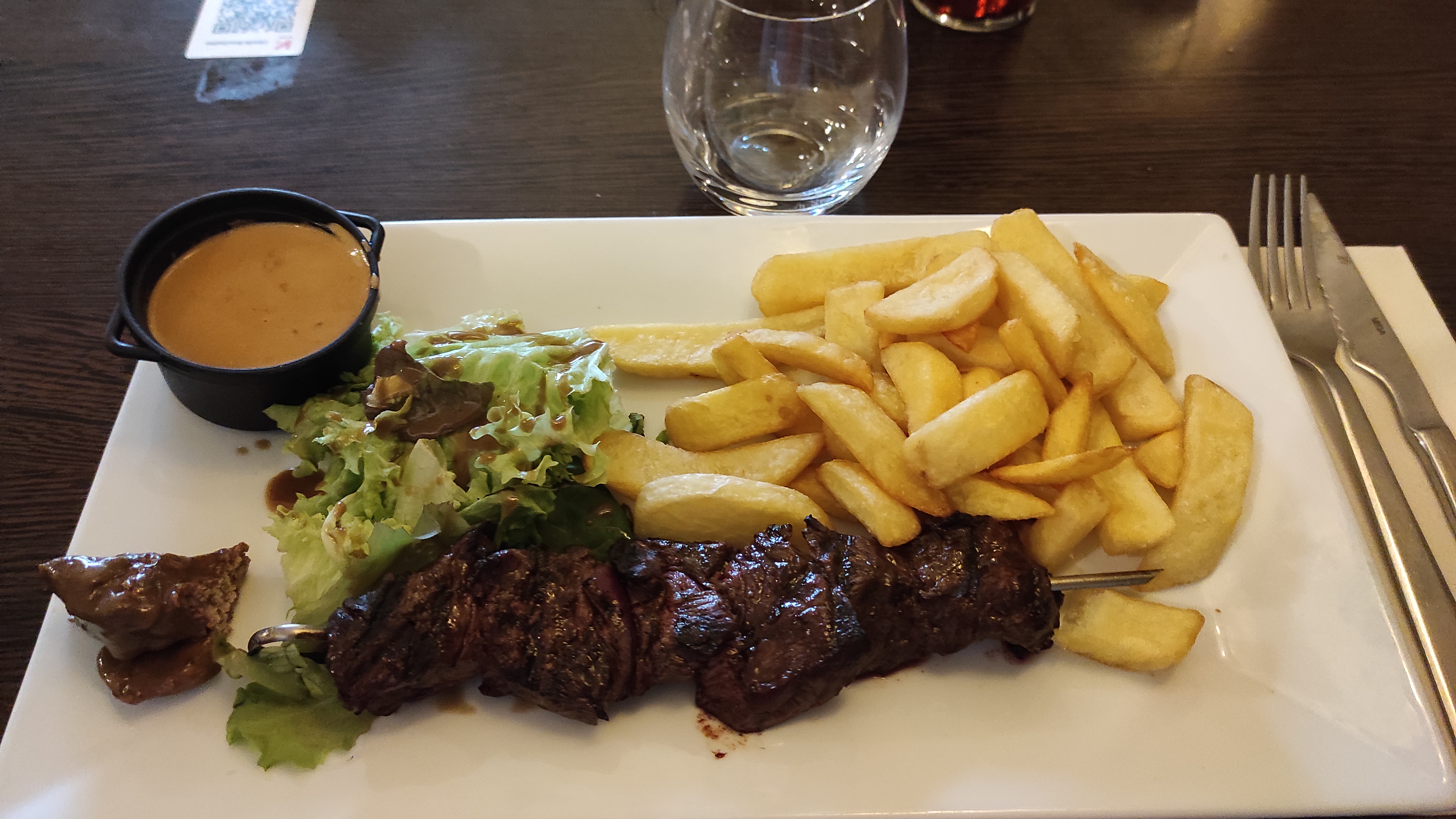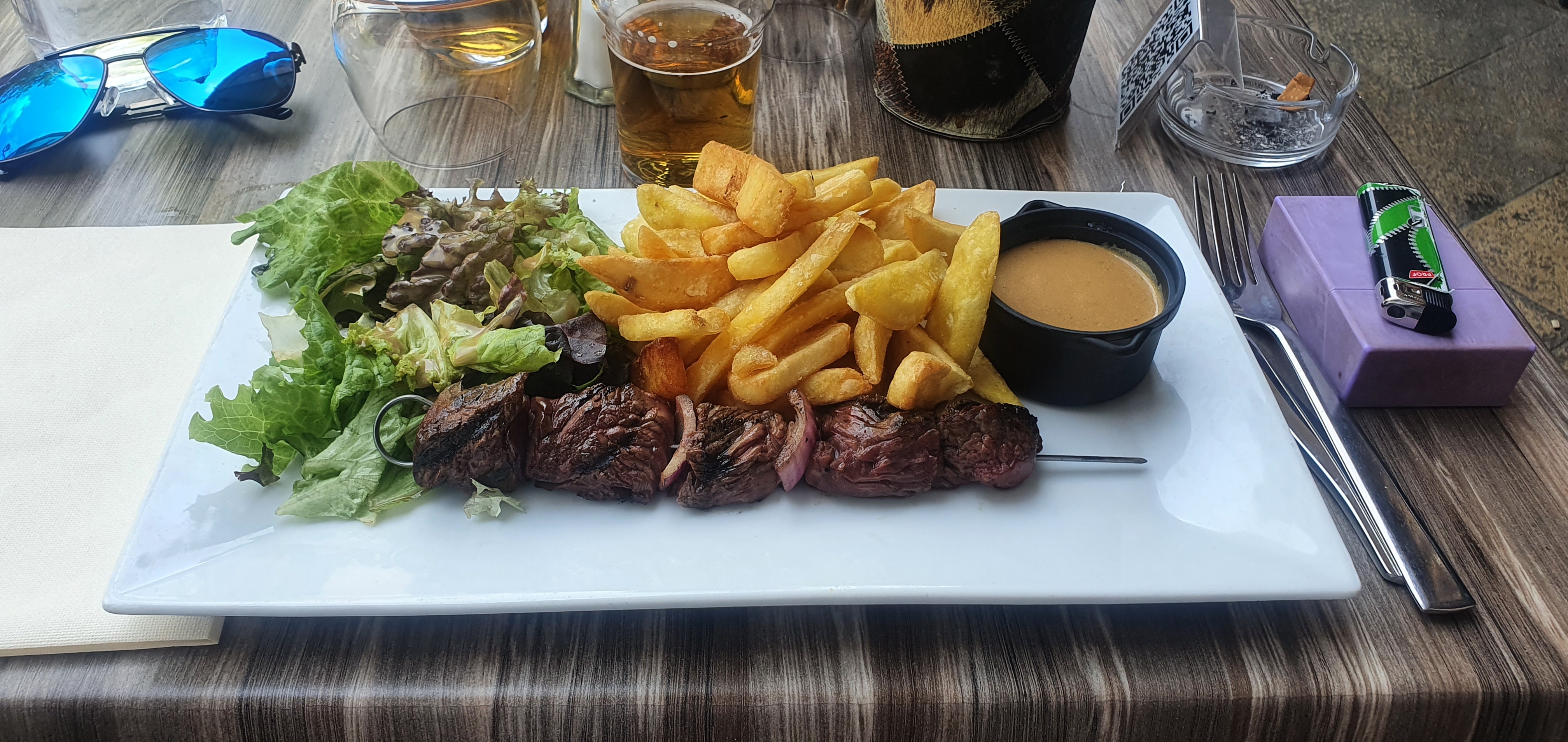 Niveau cuisine rien a redire : en entrée les brochettes de camemberts panés cetait excellent, et la brochette d'onglets de boeufs tres bonne également. Niveau service : c'était un petit peu plus complexe. Nous sommes arrivés, le serveur s'approche de nous sans un bonsoir, il prends sa tablette pour vérifier nos pass sanitaire, les scan, on lui dit quand même de nous même qu'on est deux et que cest pour dîner, il nous pointe une table a l'intérieur. Il n'aura pas décroché un seul mot. Les trois serveuses qui composent l'équipe manque peut être d'expérience, mais elles donnent le meilleur, sont très gentilles et souriantes et ça c'est top. Donc les engueuler devant une salle de restaurant avec encore des clients, perso c'était gênant. Bon courage les filles !
