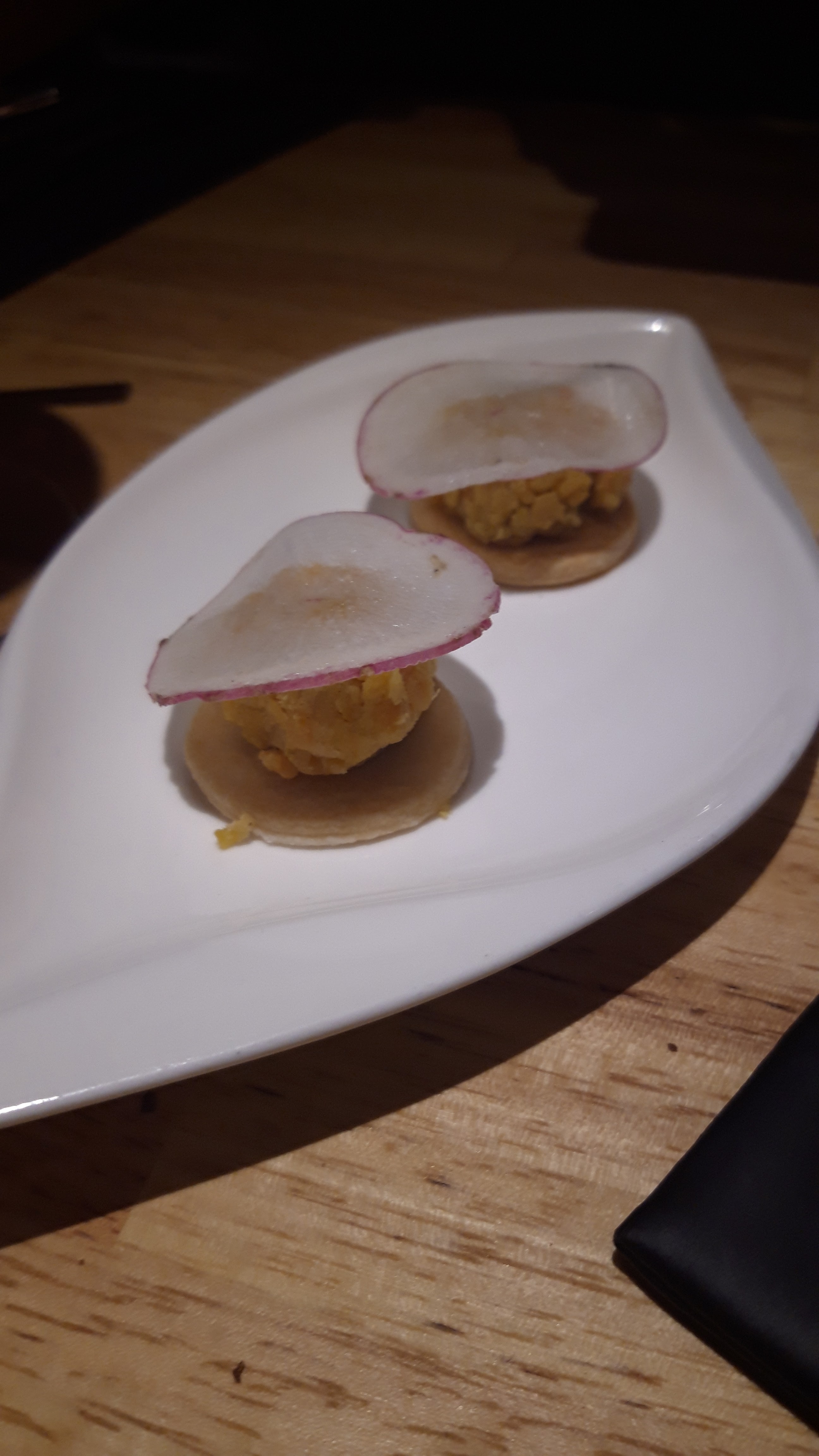 La cuisine est intéressante, on est ici dans la recherche d’associations de saveurs avec des menus dégustation interessants, à prix raisonnables. Mais c’est en salle que cela ne suit pas : climatisation en panne pour plusieurs mois, atmosphère qui devient étouffante au fil de la soirée (inacceptable pour un restaurant d’expérience qui doit offrir le confort nécessaire à la dégustation), service désinvolte (on ne change jamais les couverts même s’ils sont nettement salis du plat précédent : pas de respect du goût et de l’élégance), un garçon qui clame « et hop! » à chaque fois qu’il pose un plat sur la table (on n’est pas à la cantine)… il est urgent de travailler la rigueur en salle qui n’est pas au niveau.