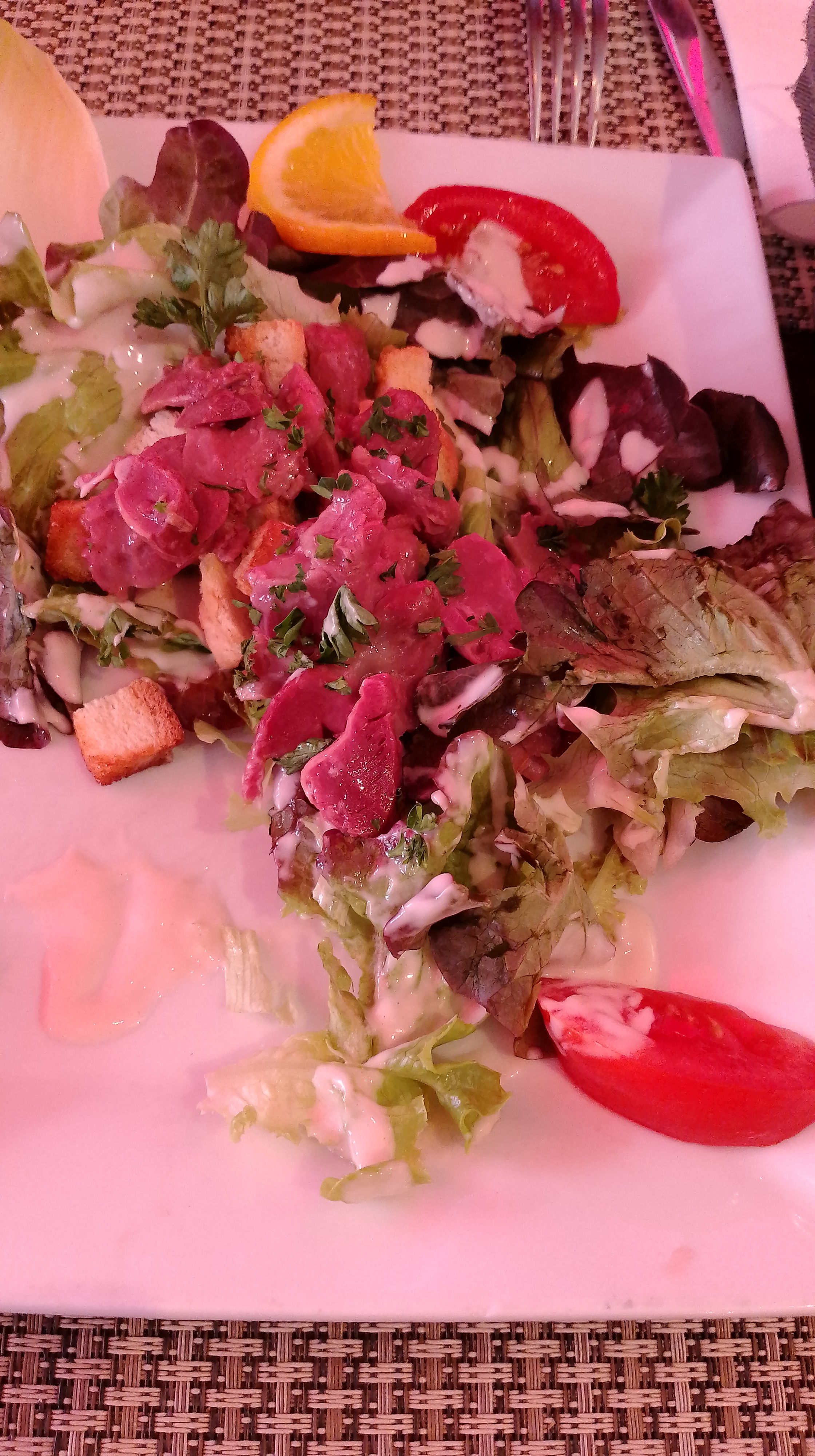 nous avons pris le menu à 27 euros proposant le pavé de taureau afin de se régaler...déçu on s attendait à meilleur ? pavé sec sans sauce viande cru alors que nous avions demandé cuisson à point et saignantes la garniture limite par contre en entrée une bonne assiette de salade....le reste correct....