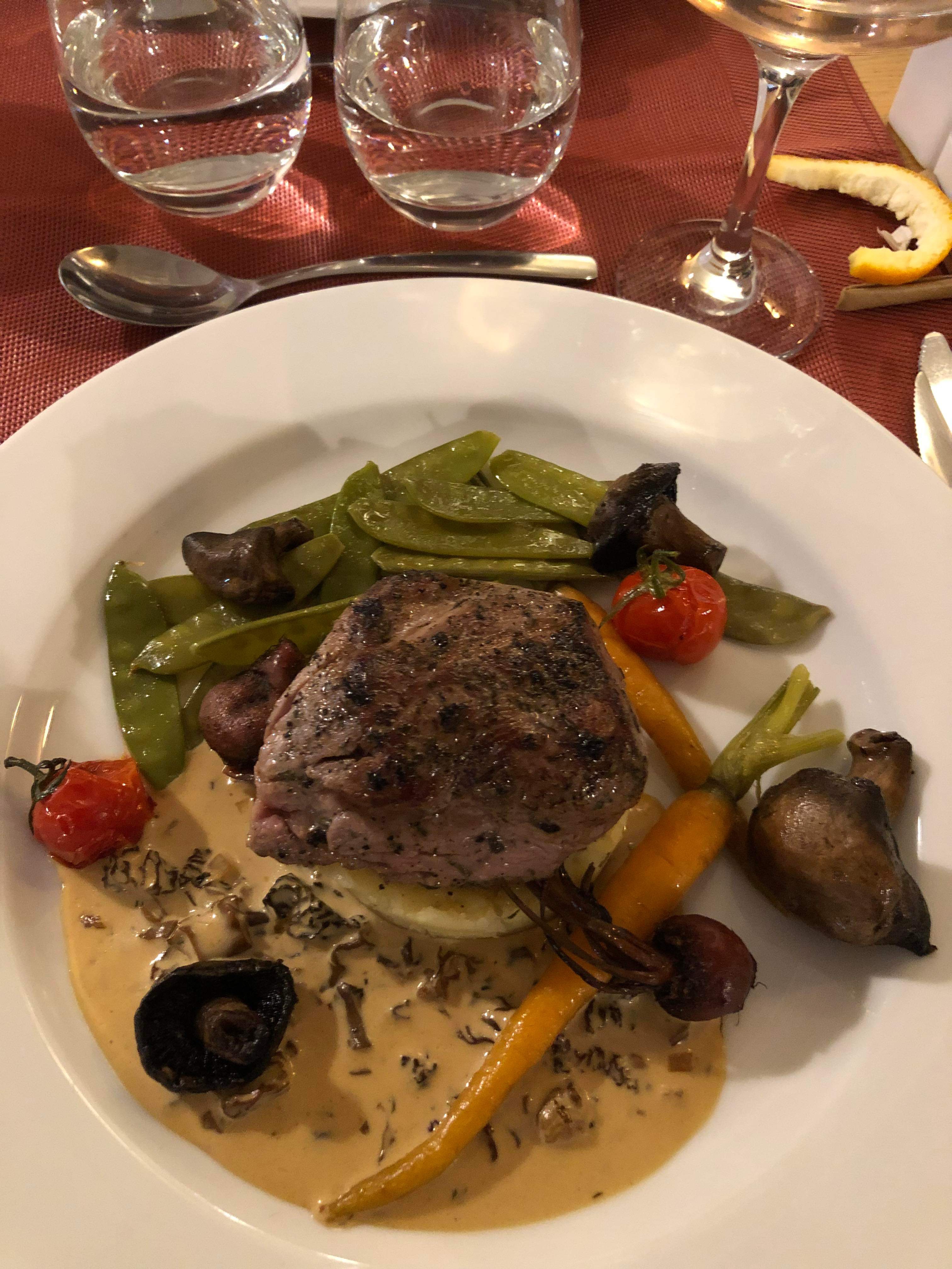Vraiment extra. Très fin et très copieux (Foie gras vraiment top, souri d'agneau fondante, côte de veau étonnement bien parfumée, dessert super beaux et bons) Nous avons sans regret choisi la formule demi-pension de l'hôtel car nous nous sommes régalés !