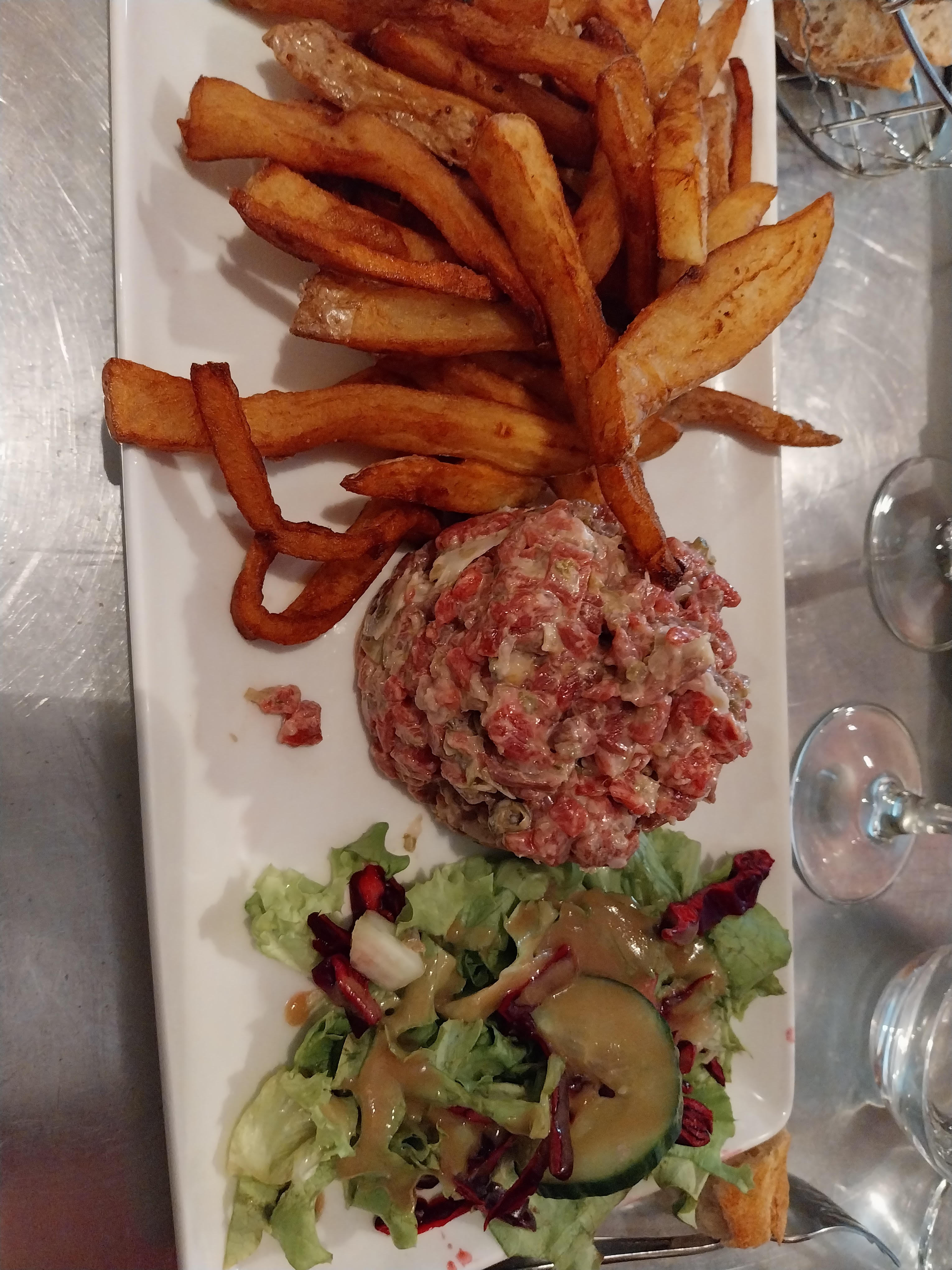 Très très bon accueil.. Les serveurs au top.. Ils connaissent vraiment leur carte.. Assiette copieuse.. Frites maison très bonnes.. Seul petit bémol (qui n'en est pas vraiment un) l'assiette de fromages et beaucoup trop petite pour son prix.. Il y a 4 minis morceaux et pour moi qui suis une fanatique de fromage j'ai été déçu. Je donne 5 étoiles, qui je pense sont tout à fait méritées.. Le prix est très correct également.. Je recommande...