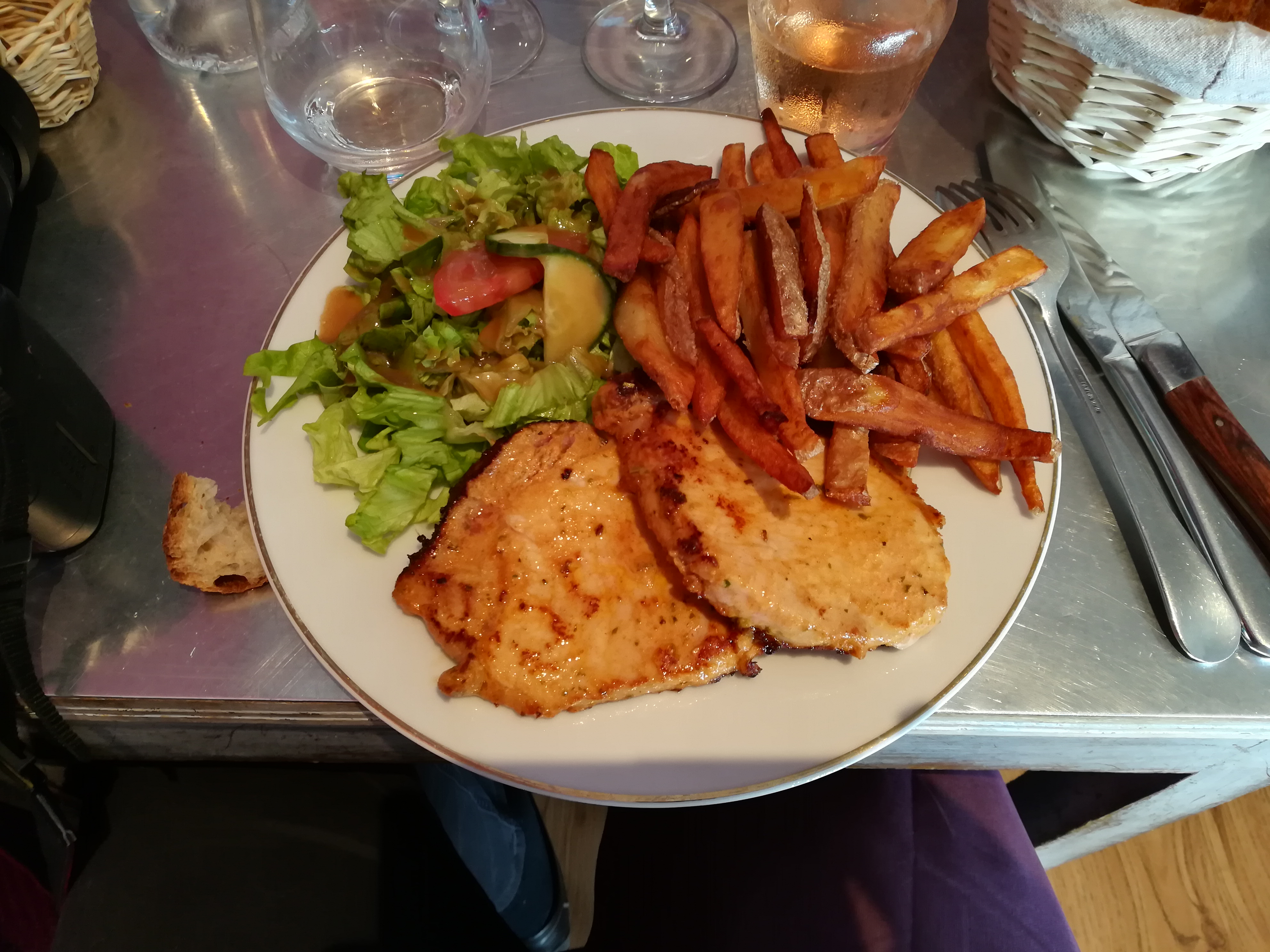 Nous étions de passage et nous avons été vraiment déçu par ce restaurant . Un accueil sans sourire, les plats sont fades, les frites ne sont pas croustillantes comme le citent certains commentaires Le cuisinier s'essuie le front de sueur avec ses mains et continue à préparer les plats sans se les laver La fille qui aide n' a pas de filet pour ses cheveux La poubelle à coté du bar était archi pleine et personne ne se souciait si elle allait être vider ou qui allait le faire et pour le pain placé à coté de celle -ci , je ne savais pas ce qu'il faisait là même si c'était du pain à jeter j'ai pris un thé en fin de repas ,il restait des traces de café sur le bord de la tasse ,le serveur m'a dit que c'était normal et que ça ne s'enlevait plus ... J'ai enlevé les traces avec ma serviette.....n'ont -ils pas de tasses plus grandes que des tasses à café ( en verre par exemple )?????? Bref un resto nul !!!!! et je pèse mes mots
