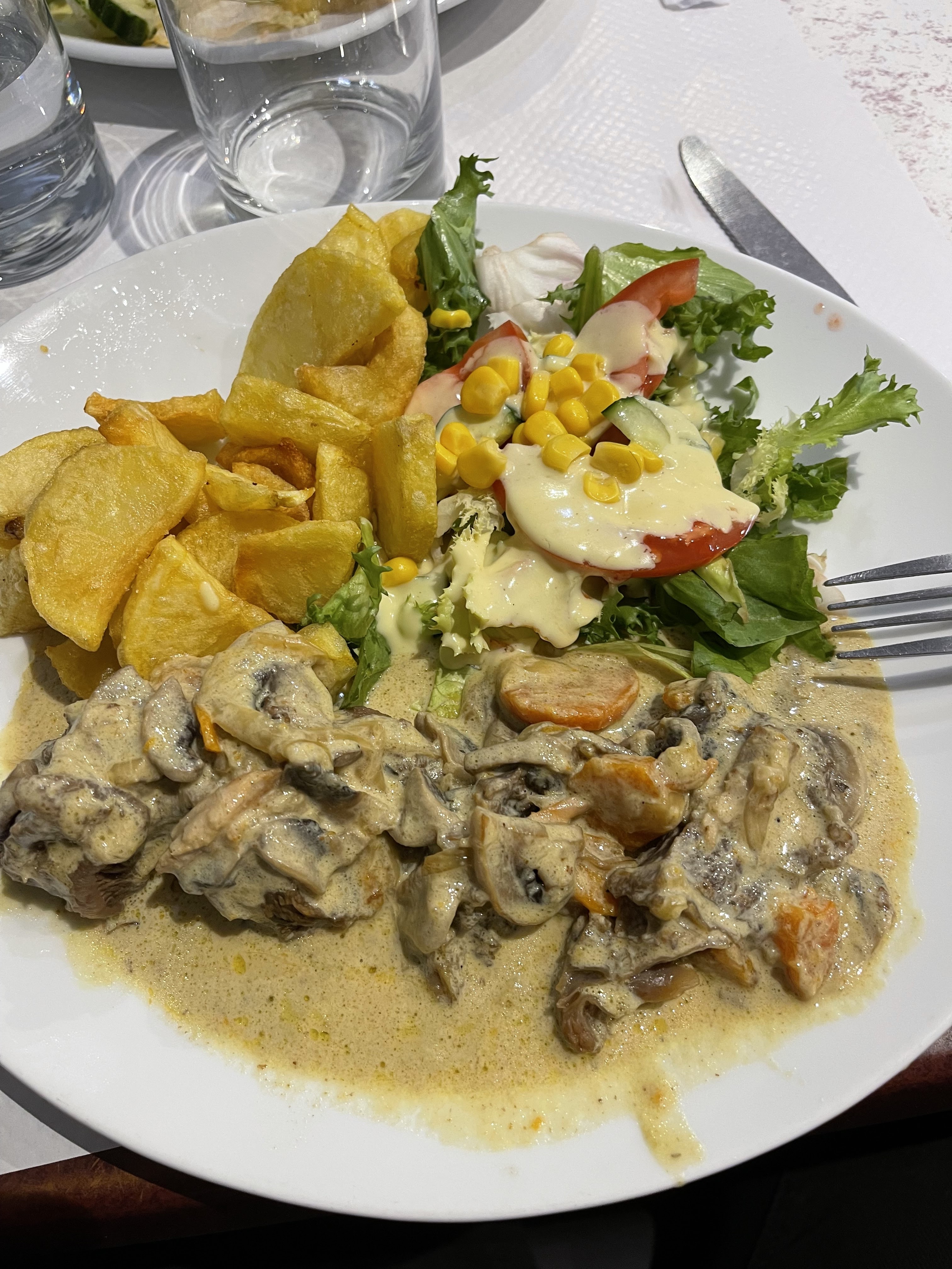 Bon , c’est malheureux qu’ils marquent que c’est du fait maison alors que non , c’est flagrant que c’est du surgelé réchauffé, que ce soit pour la viande ou les frites . Pas de goût, avec une salade qui n’a pas l’aspect d’être fraîche du tout. Je vous déconseille de manger ici .
