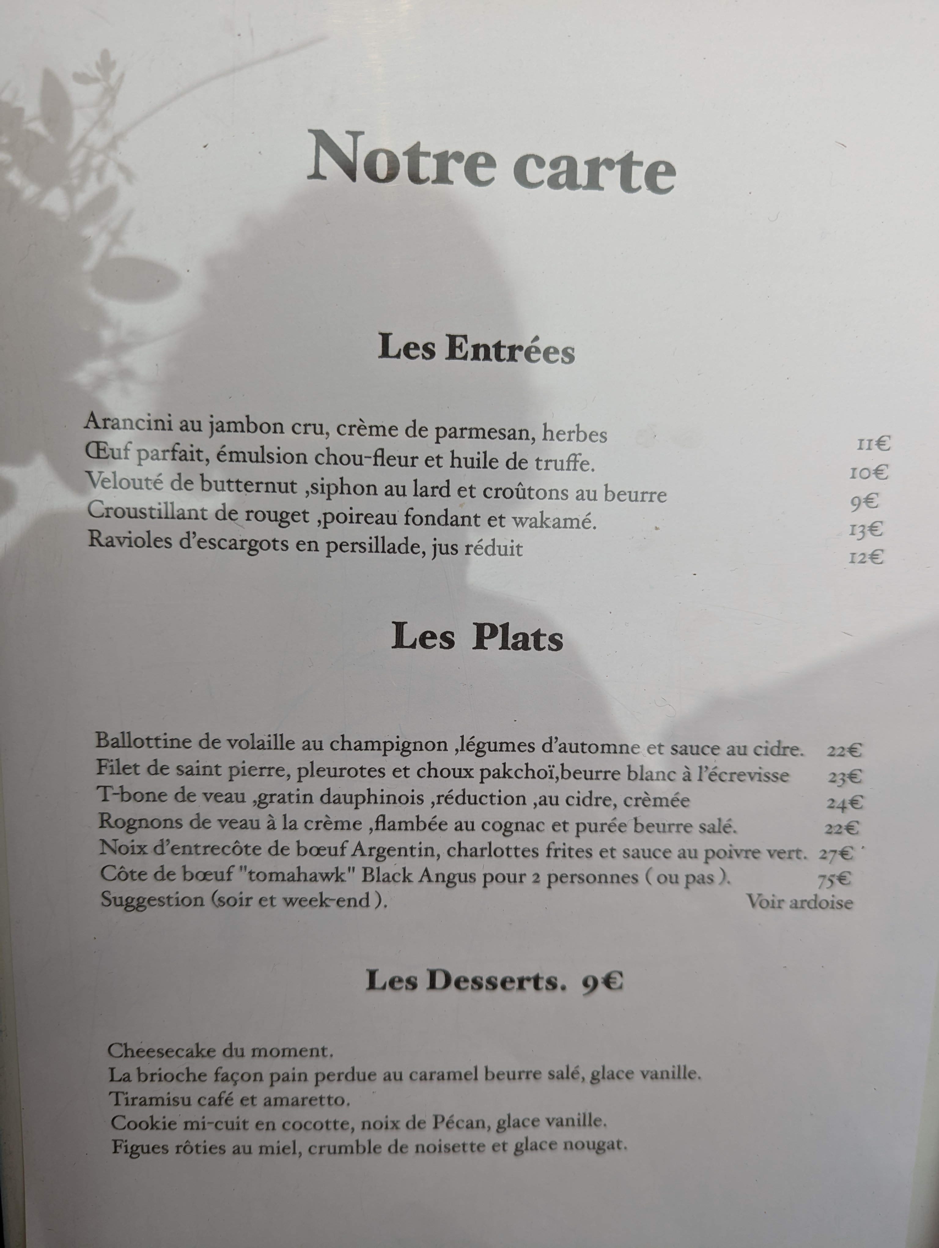 Un délice de l'apéro au dessert: 2 Spritz bien tassés,un steack argentin avec sa sublime sauce servie à part avec un verre de Bourgogne pour moi et un suprême de volaille pour madame, un tiramisou et une brioche perdue, & café et 1 vieux rhum en digestif, le tout au prix de € 99,20 ... c'était fabuleux et rapport qualité prix imbattable. On vous le recommande vivement, c'est mieux qu'un entracte, c'est la pièce entière.