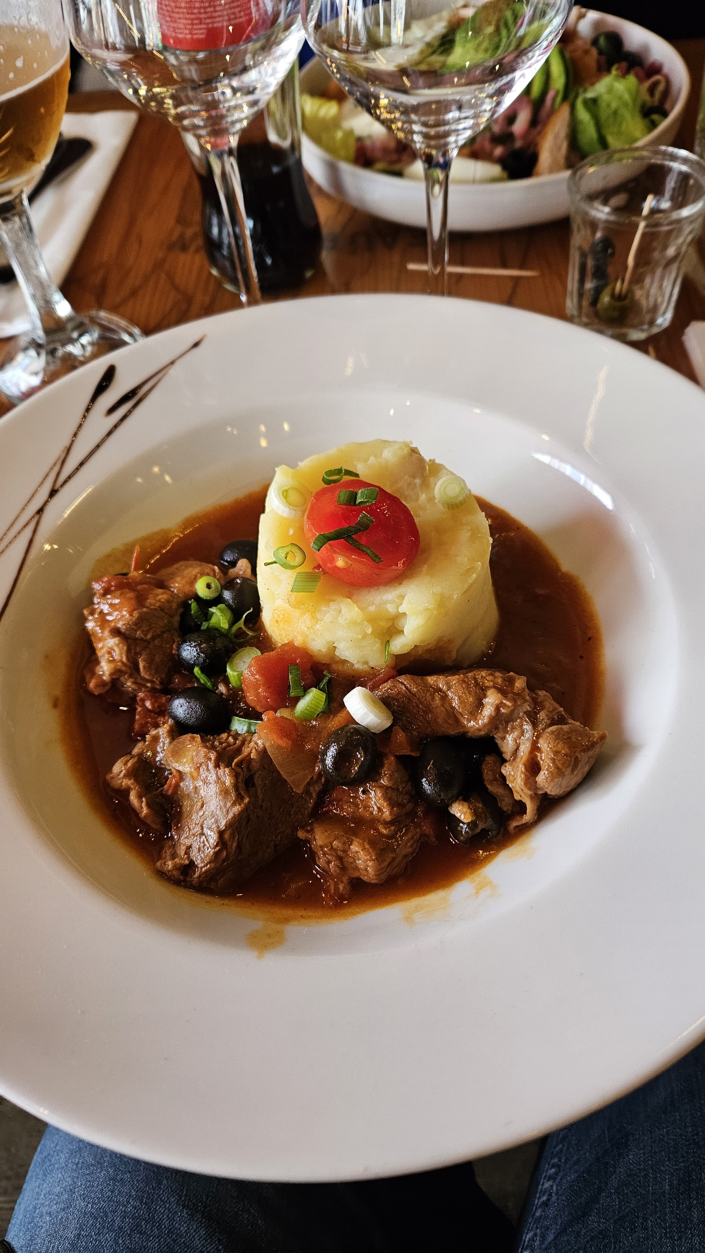 Petit endroit mignon, mais suivez ce que faisaient les locaux le soir de notre séjour : prendre un verre mais sauter le repas. Nous avons tous deux commandé le steak et avons été très déçus. Il n’était pas séché et était aussi résistant que le cuir d’une chaussure. Un simple steak est assez difficile à gâcher, mais je crains que la coupe qu'ils utilisent ne soit jamais comestible. Les pommes de terre étaient un peu insuffisamment cuites, mais comme je ne pouvais pas manger le steak, je les ai mangées. J'aurais commandé un deuxième verre de vin, mais ils manquaient beaucoup de personnel, alors plutôt que de prolonger mon repas immangeable, nous avons payé et sommes partis dès que nous avons pu.