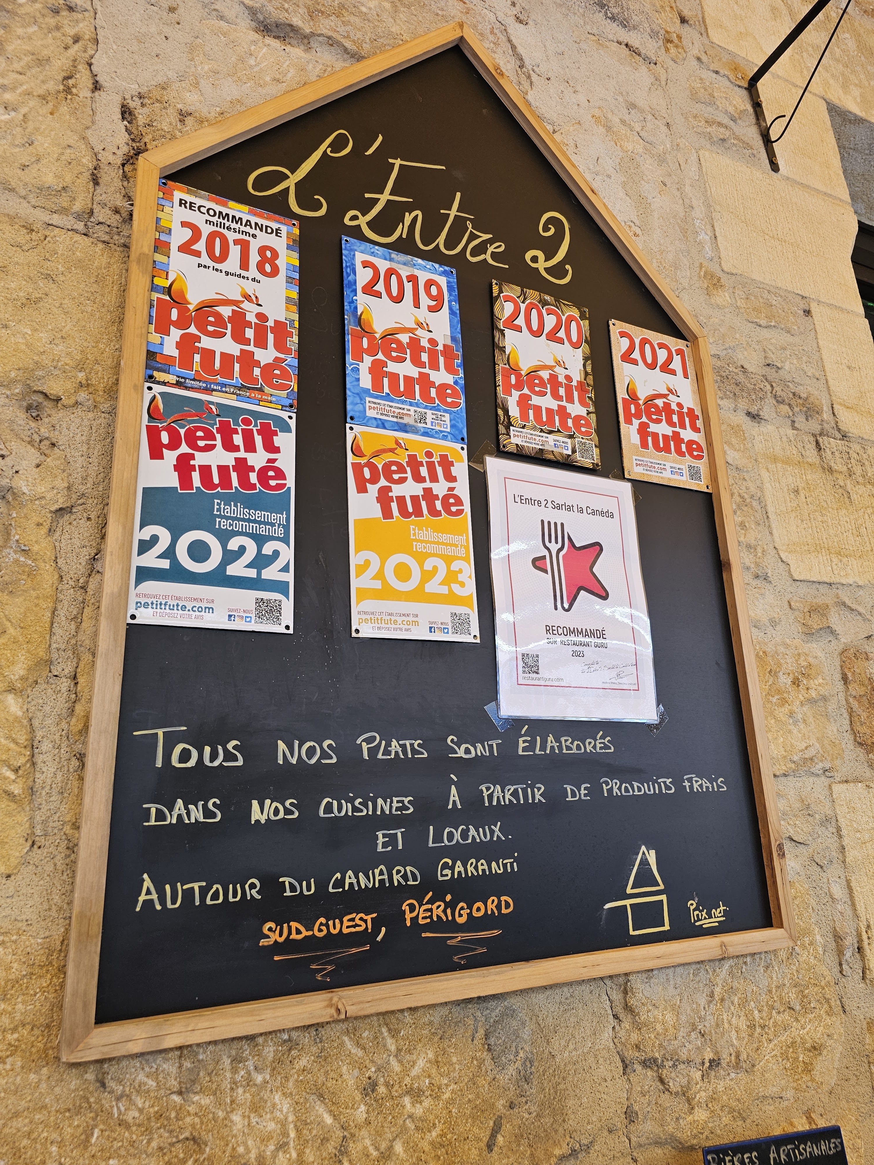 Difficile de s’y retrouver dans tous ces restaurants à sarlat! L’entre 2 est vraiment top. Le personnel est agréable. Le menu entrée+plat+dessert est à 15,80€ le menu au dessus est à 22€ On y mange bien, et les produits sont de qualité. Je recommande +
