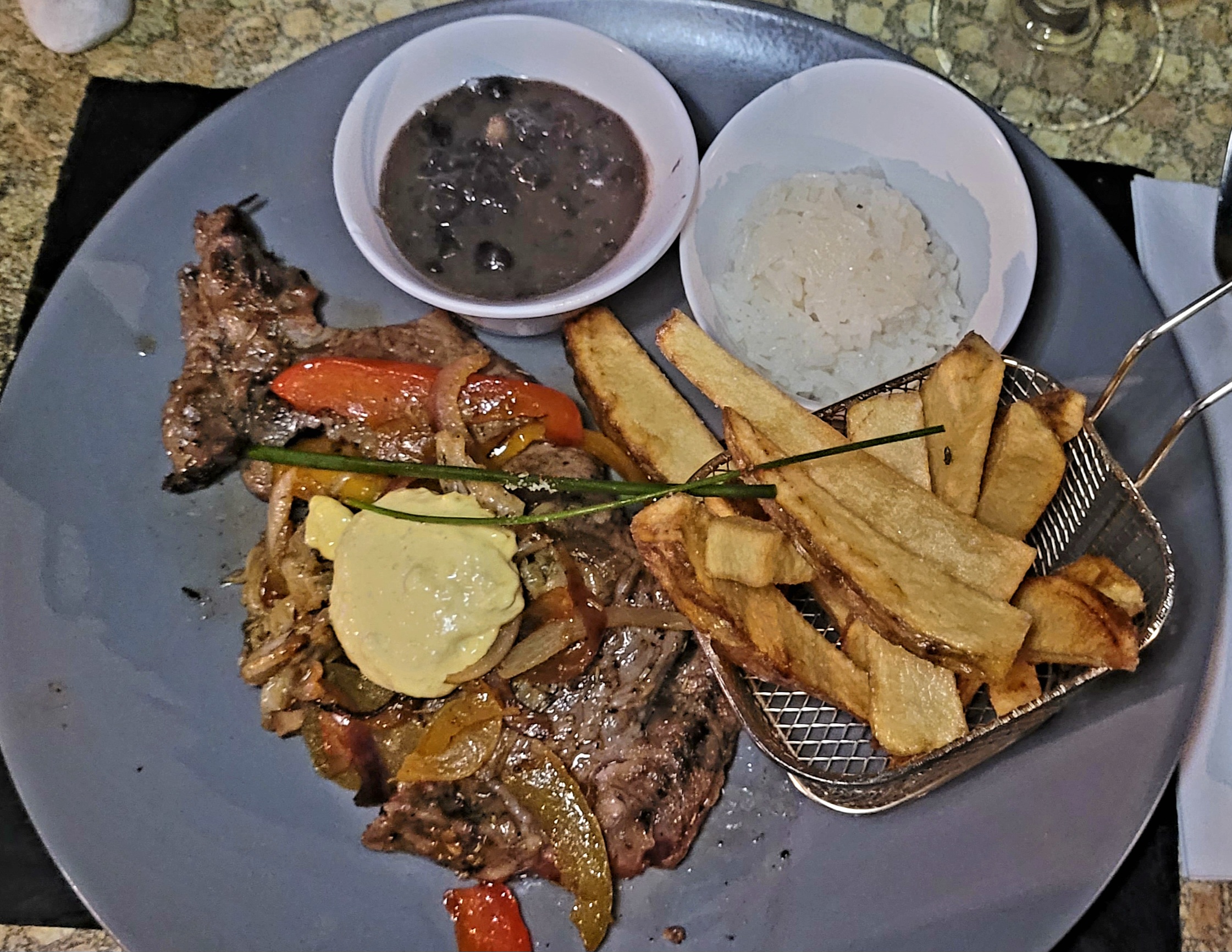 Excellent dîner. Beaucoup de choix. Foie gras ou salade de poulpe pour nous suivis de magret à l'hibiscus, fejoada ou picanià. Sorbets exotiques ou crème brûlee parfaite. Des plats copieux dont la variéte a satisfait les 3 convives. Gouteux. Service efficace et attentif. Une bonne adresse .