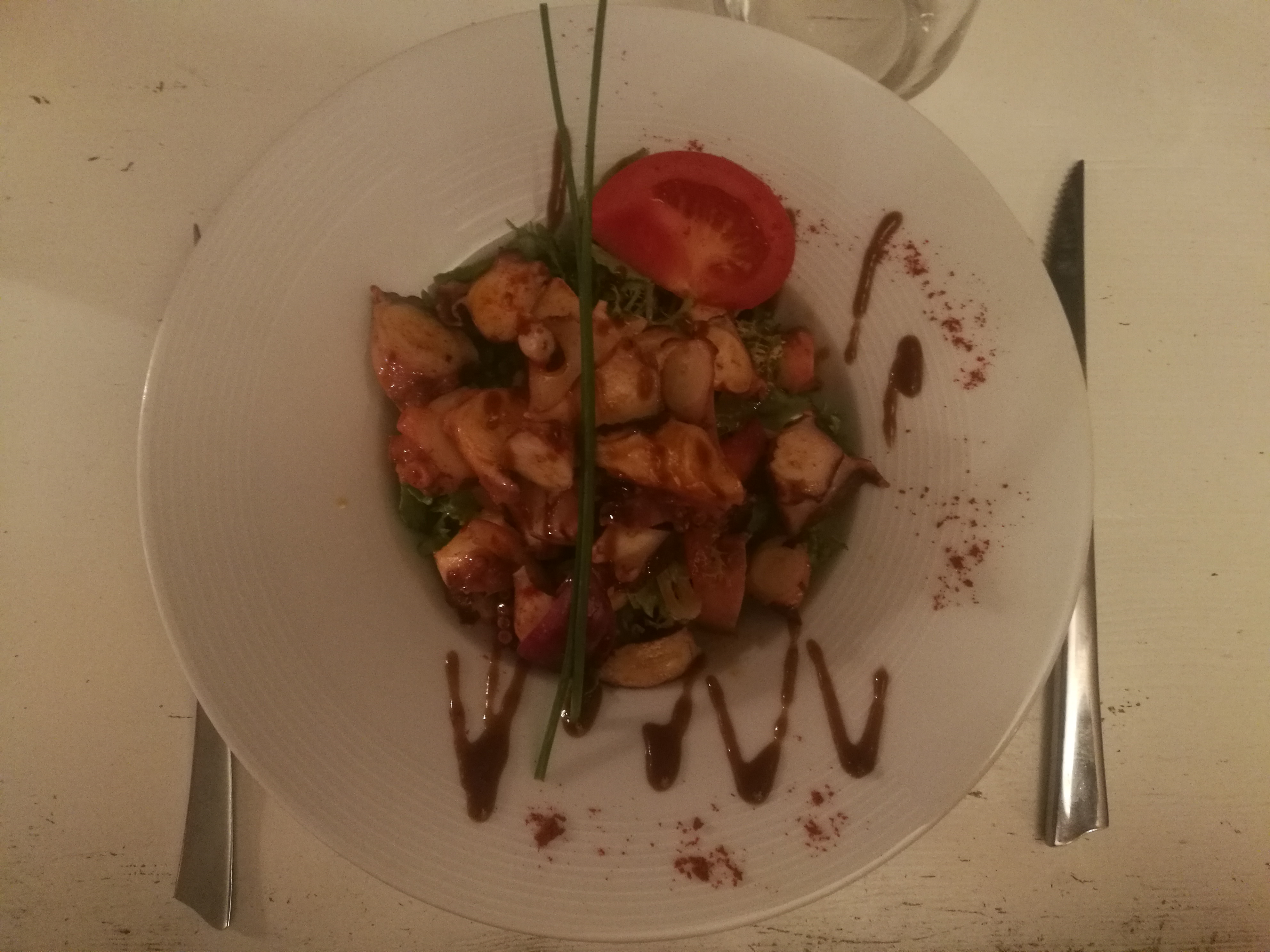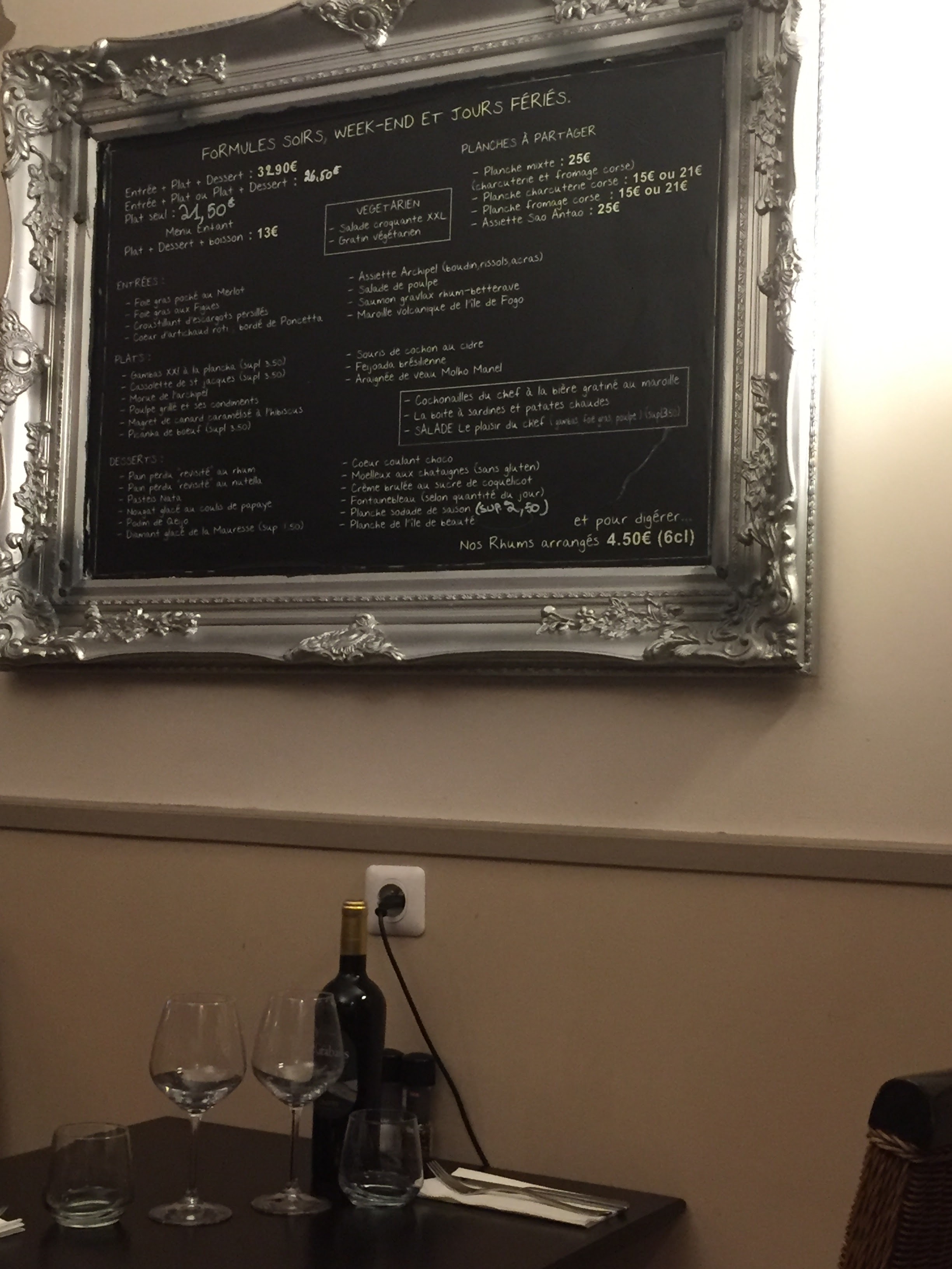 Un service très long ( 2h30 pour Entrée/Plat/Dessert ) Aperitif ok même si on a cherché le goût de rhum - Entrees au top (artichauts rôti et salade de poulpe) - Plats trop salés ( cassoulet brésilien, bof et poulpe grillé 2 bons morceaux, 1 trop salé, sauce insipide - servi avec riz et pdt mais annonce avec des pdt) - Desserts ok. Cadre agréable, joli salle peut être un peu bruyant mais comme beaucoup d autres petits restaurant malheureusement. Pas sûrs d y retourner malgré le geste commercial d offrir un des 2 desserts comme nous avons fait remarqué le problème du plat.