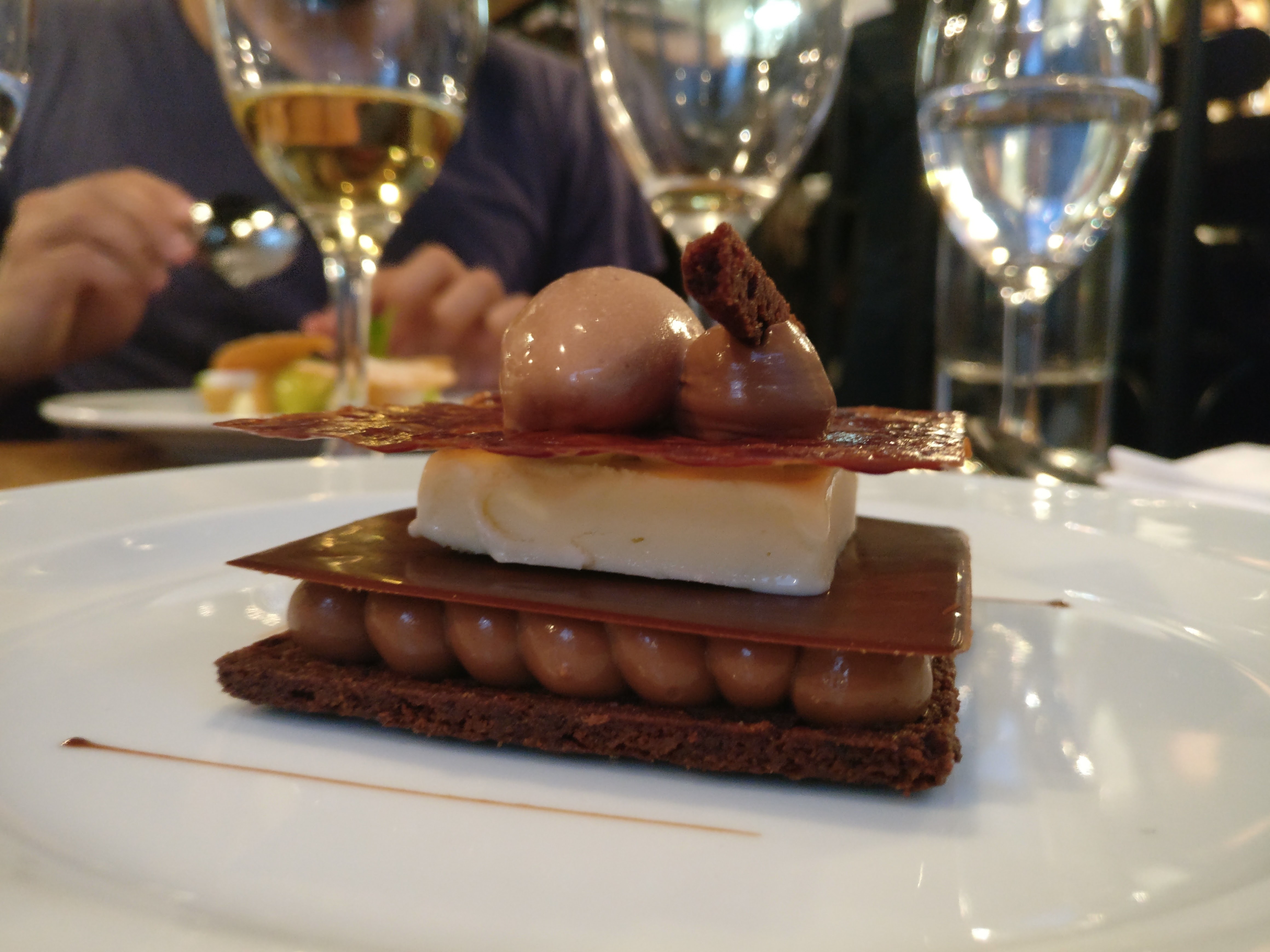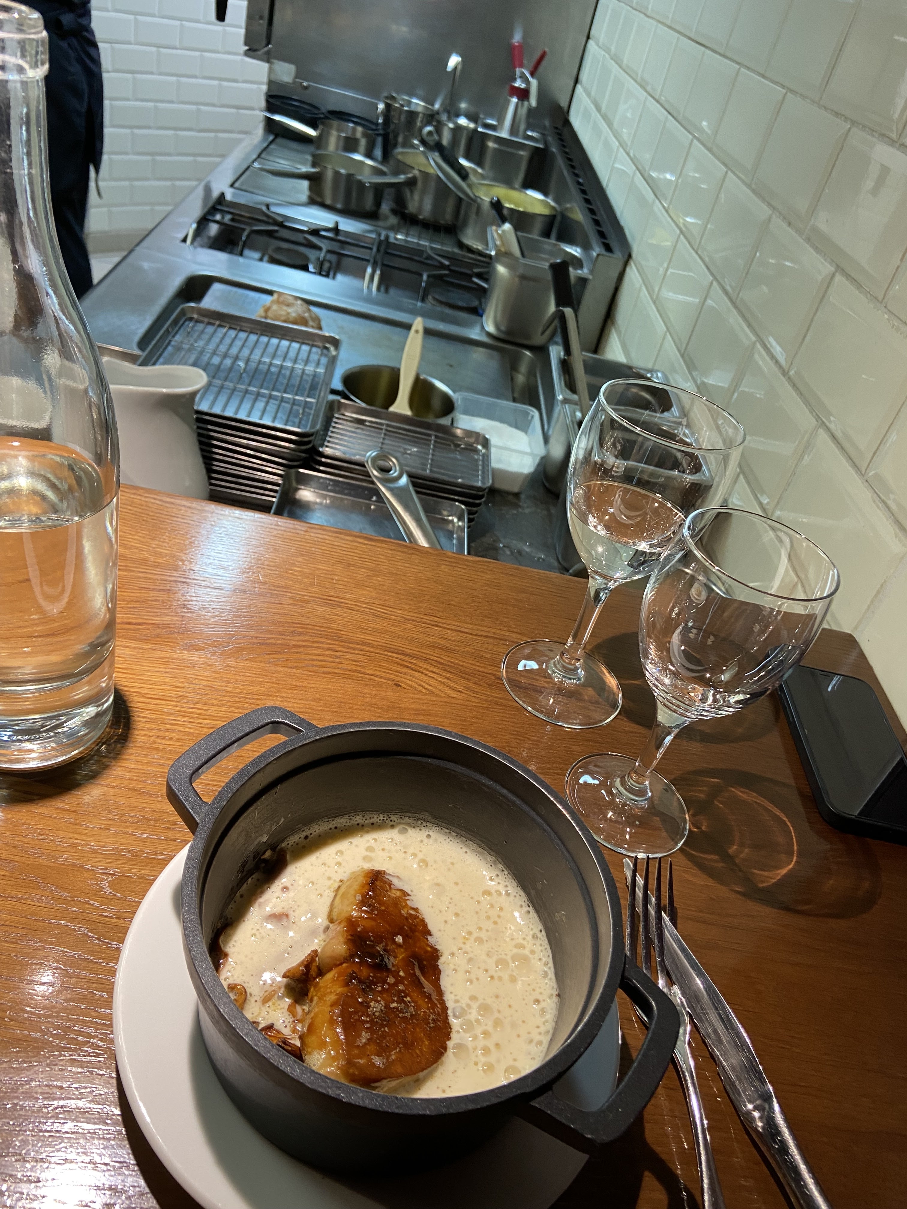 Installés au comptoir nous avons suivi ce ballet hypnotique de préparation au millimètre. Œuf croustillant en entrée à tomber, dessert pomme confite magique. Un seul bémol : le pain