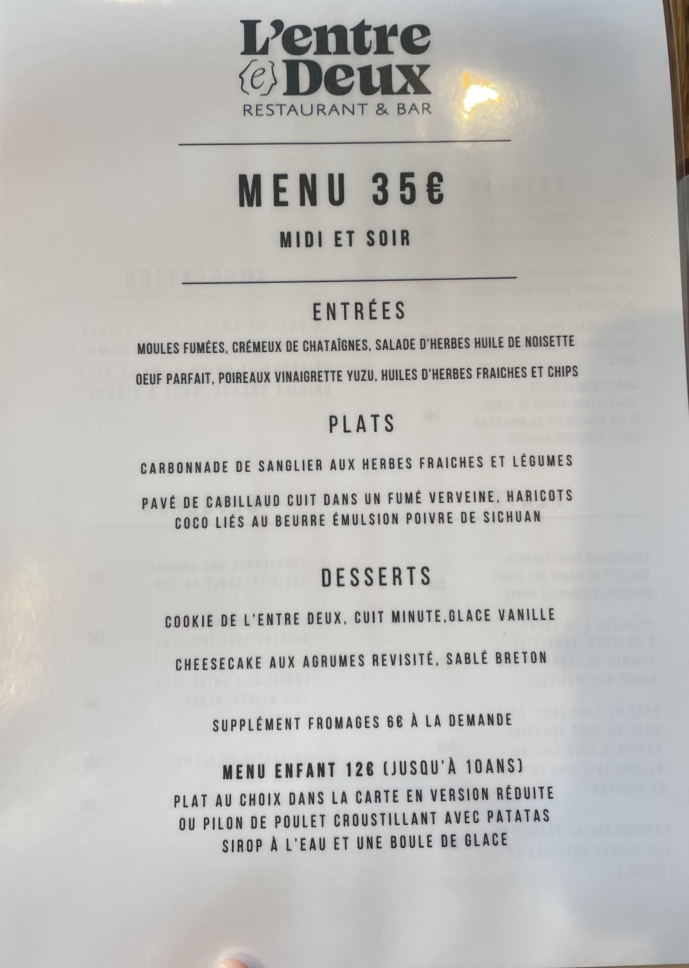 Un très bon moment passé à l entre deux! La cuisine est bonne, l équipe très sympathiques. On a hâte d y retourner !