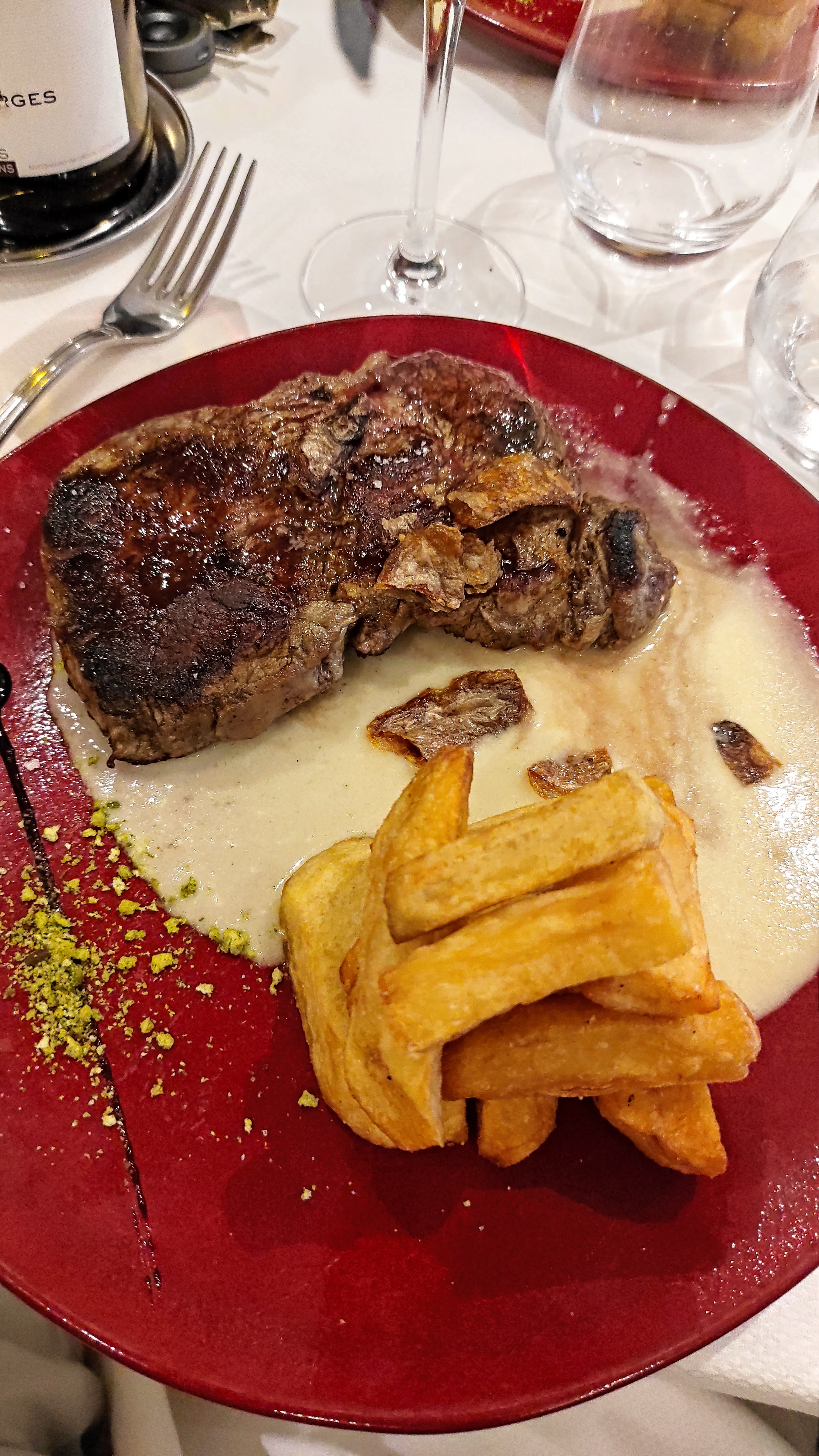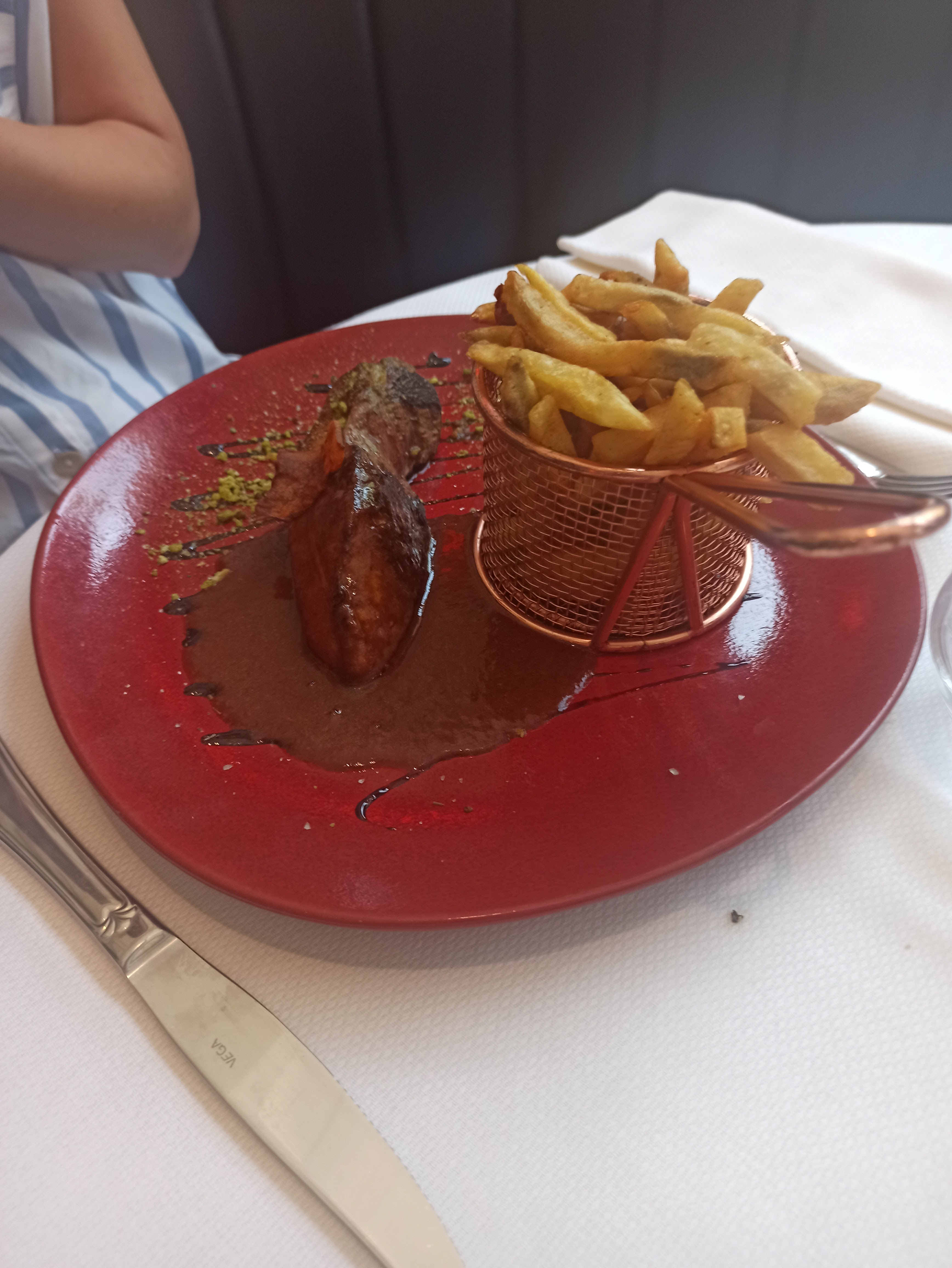 Tellement déçu par rapport aux avis .... Déjà pas de clim dans le restaurant malgré les grosses chaleurs ... On commande une bouteille de champagne Charles de nozian et on nous ramène une autre marque ...obligé de renvoyer la bouteille. On commande la bouteille la plus chef de vin et même pas on me présente la bouteilles et on me fait pas goûter ...les entrées sont vraiment bien par contre et les plats sont pas à la cuisson demandé.. quand on demande saignant on veut un peu de sang pas juste rosé et que dire de la sauce camembert qui est plus à l eau que au camembert. Les frites sont surgelés et vraiment pas en grand nombre . Les desserts sont originaux mais quand on mélange des pâtes feuilletées surgelés et des produits frais ça rend un desserts fade . Et on oubli pas les cartes en cuir qui sentent le vomi quand tu l ouvres . Une vraie déception .