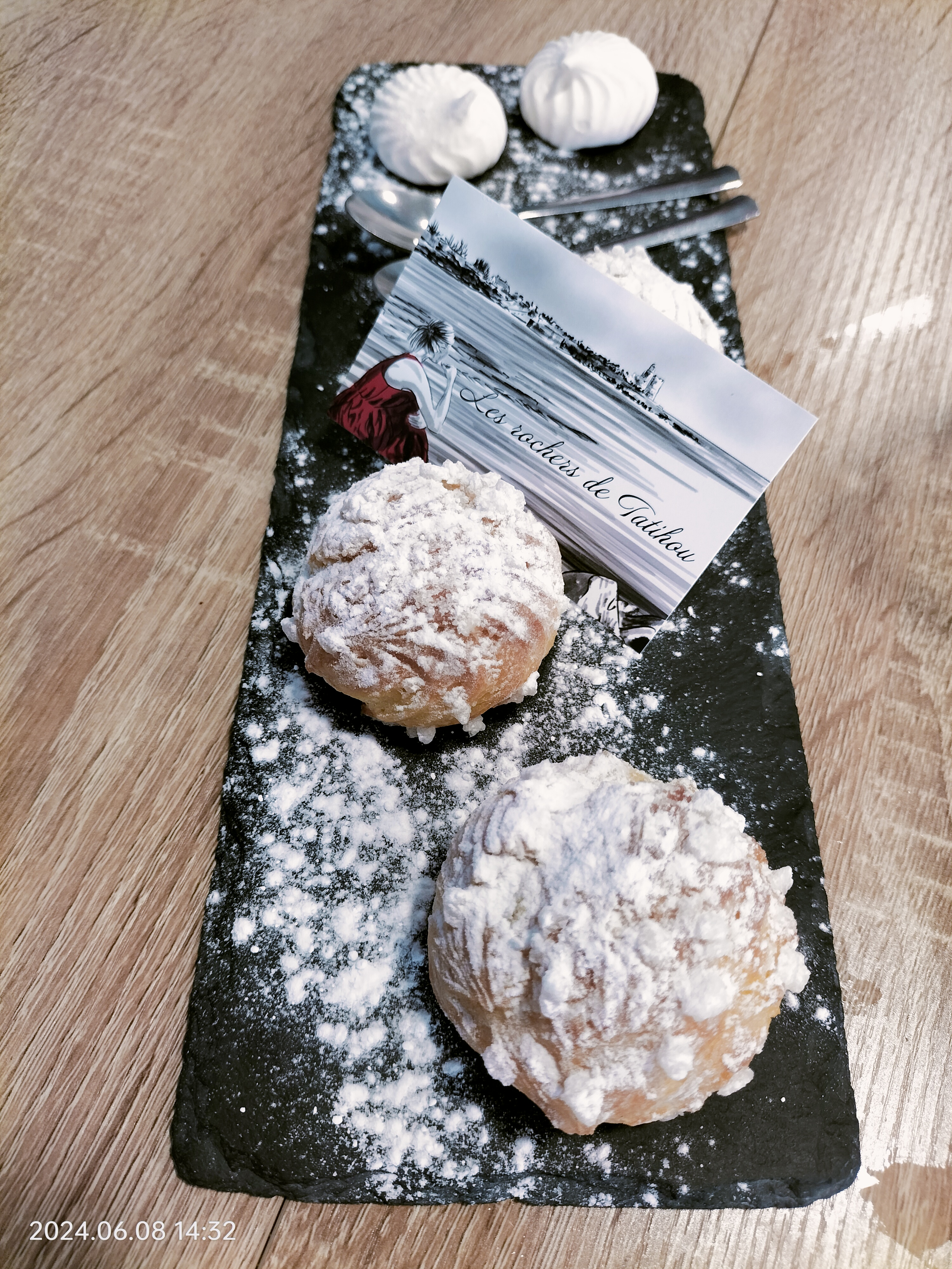 Arrêt déjeuner alors que la bruine tombe aux alentours. Excellent accueil avec des plaids et surtout des huîtres et des produits extras frais et goûteux.