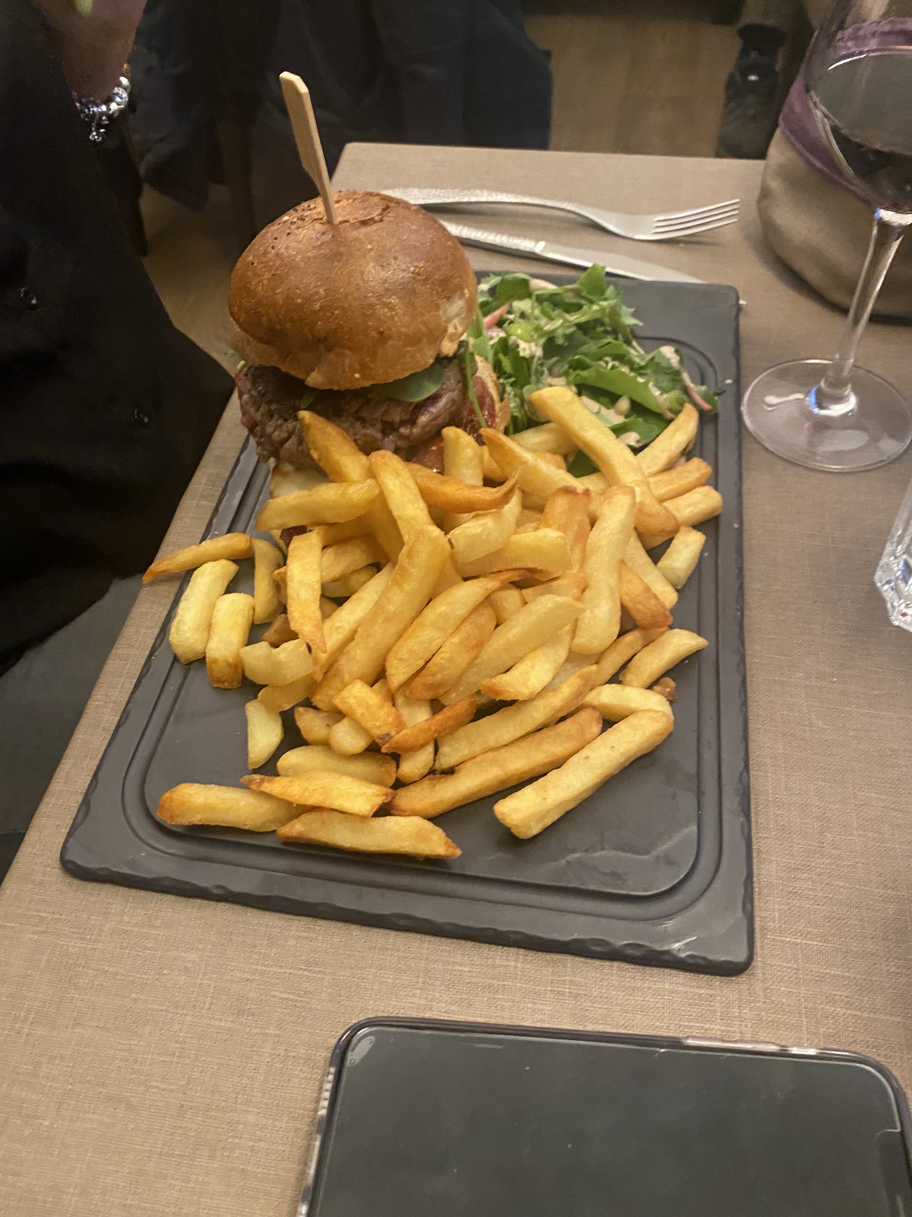 Correct. Évalué avec bienveillance. J'attendais mieux en consultant les avis. Deux serveurs qui mettent le masque sous le nez voire sous le menton. Frites froides et dessert décongelé.