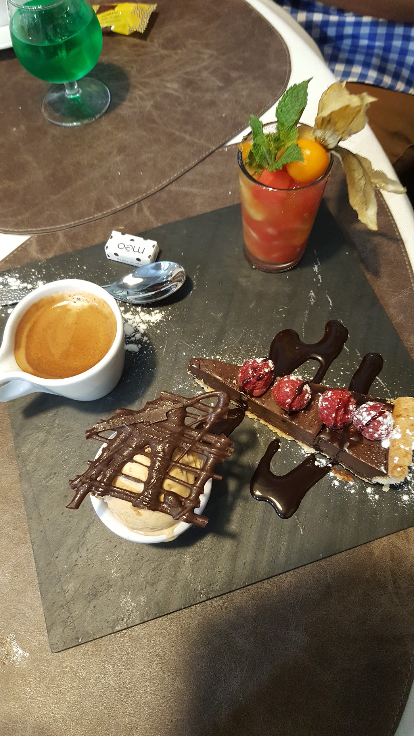 C’était parfait. Produits de qualité, portions comme il faut, serveurs adorables, on s’est régalé. C’était la première fois aussi que j’ai mangé un café gourmand pareil, quel délice : choux au chocolat, cheese cake et crème à la pistache. Vous avez un pâtissier dans l’équipe ? On reviendra !