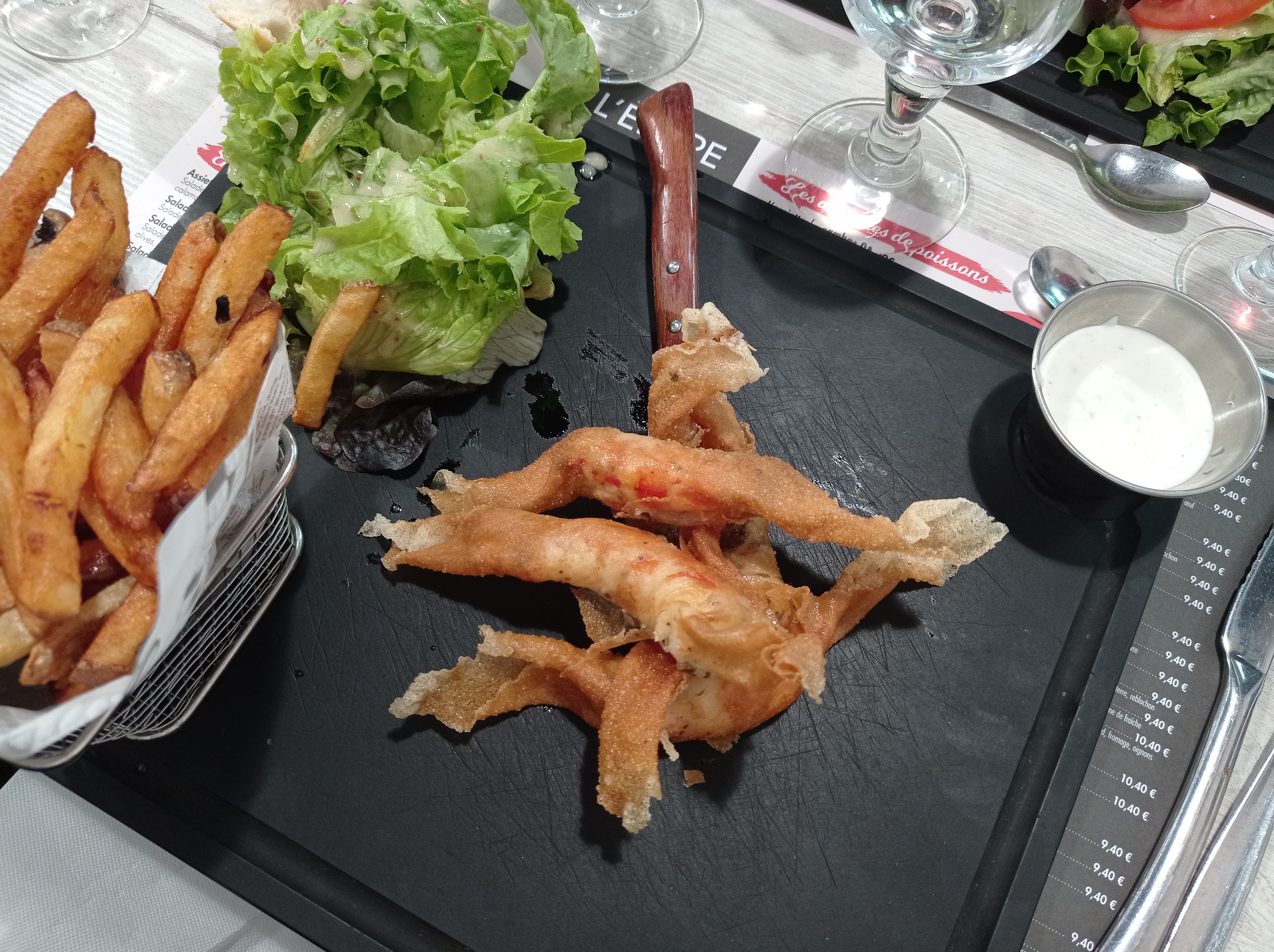 J'ai pris le menu du jour à 11,35 Un apéritif offert un vin de pêche je pense En entrée une verrine gambas délicieuse très fraîche Une viande grillée à point avec ses frites maison et une sauce aux poivres Un café La viande était juste parfaite les frites excellente Pas de temps d'attente malgré beaucoup de monde Si vous avez l'occasion allez y
