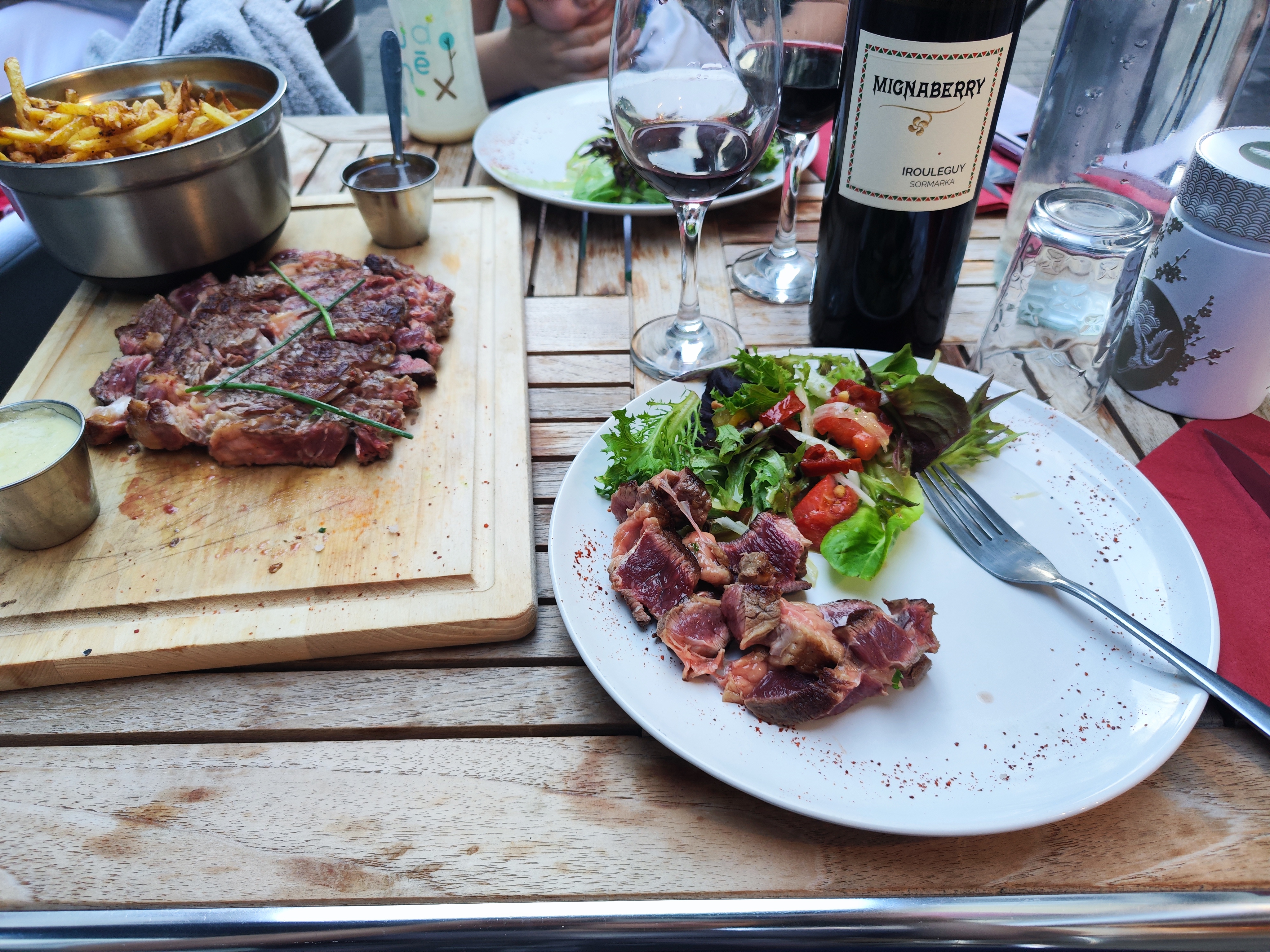 Peut-être que depuis l'entrée, cela n'attire pas l'attention, mais cela vaut la peine d'essayer. Nous y avons déjeuné pour deux personnes, avec un plateau de fromages en entrée, et une assiette pour chacun : une entrecôte et un magret. Les deux comprenaient de la salade, de la sauce et des frites maison. La qualité de la viande était si bonne. Le serveur était également très sympathique avec nous.