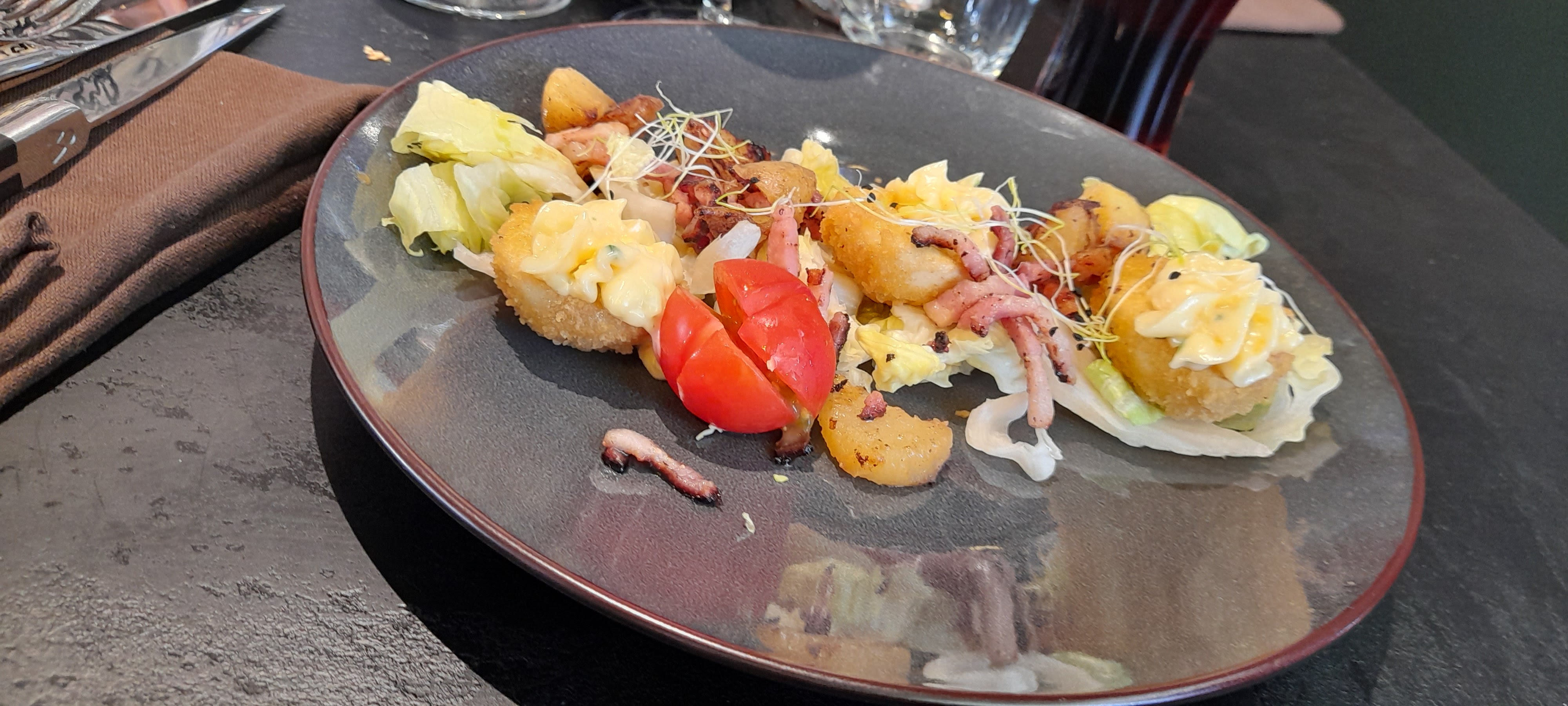 Belle découverte, belles assiettes, de bon plats, bien soignés, assez bon, belle déco, ambiance assez cosy, Belle carte de vin,