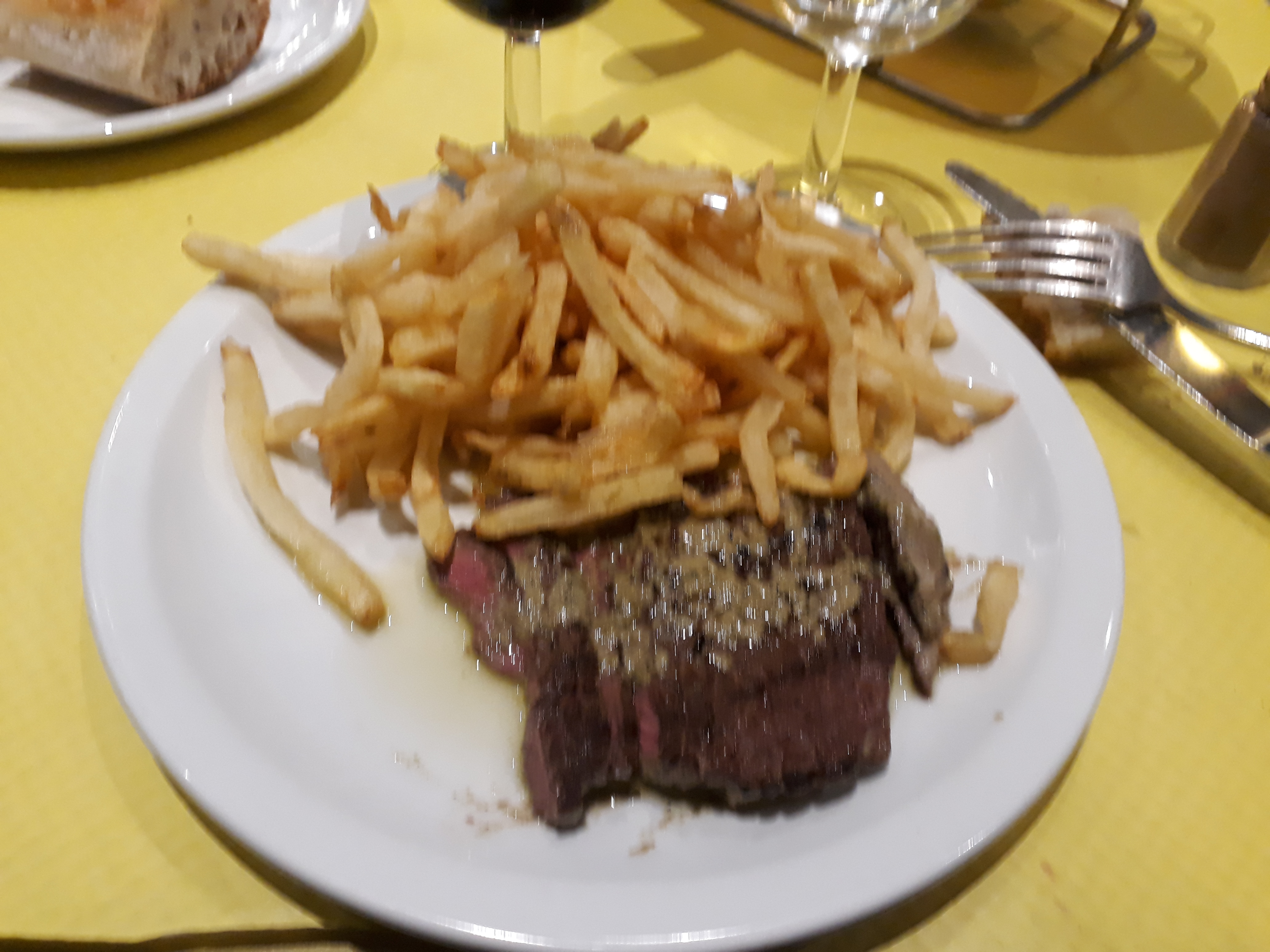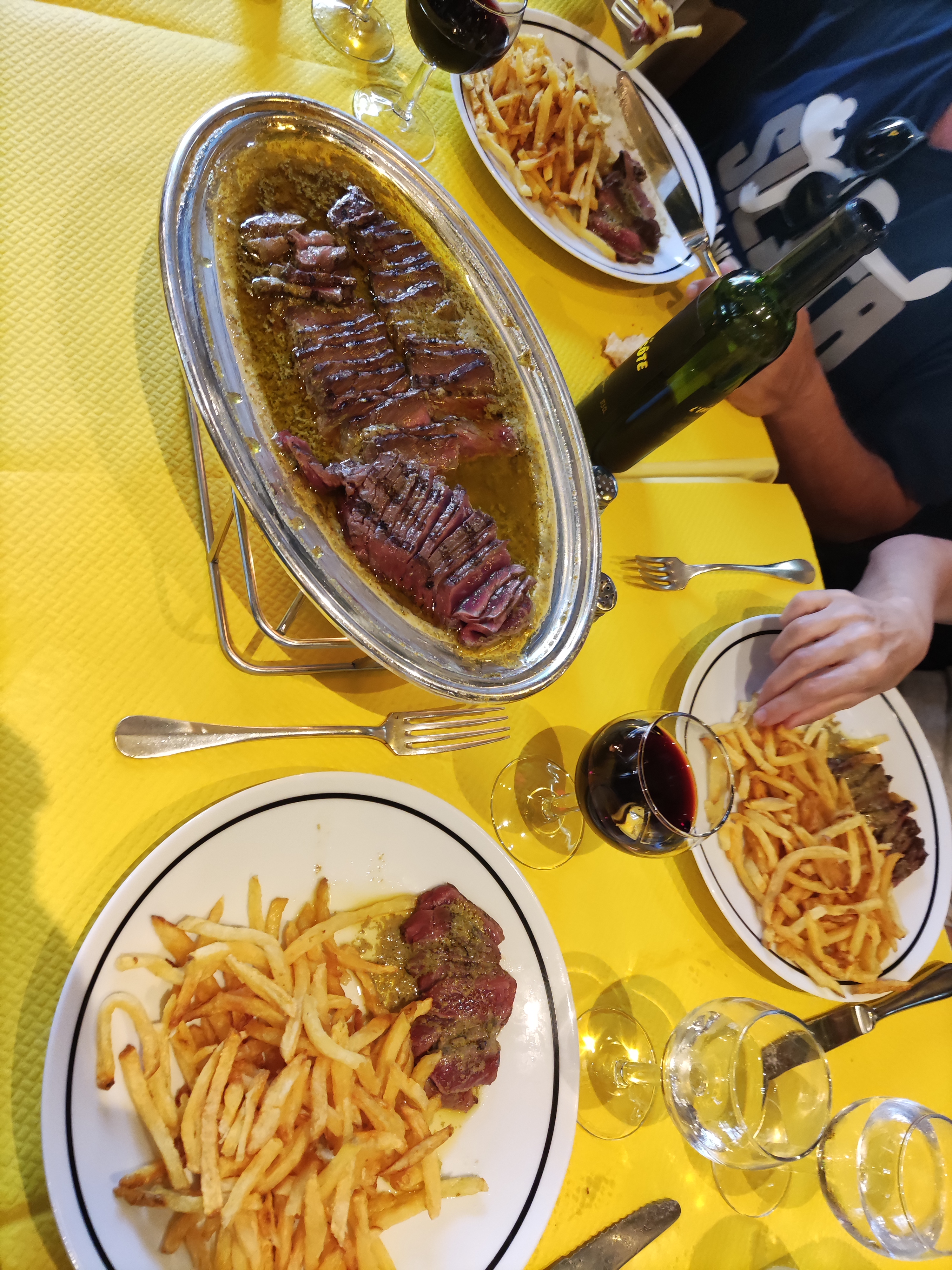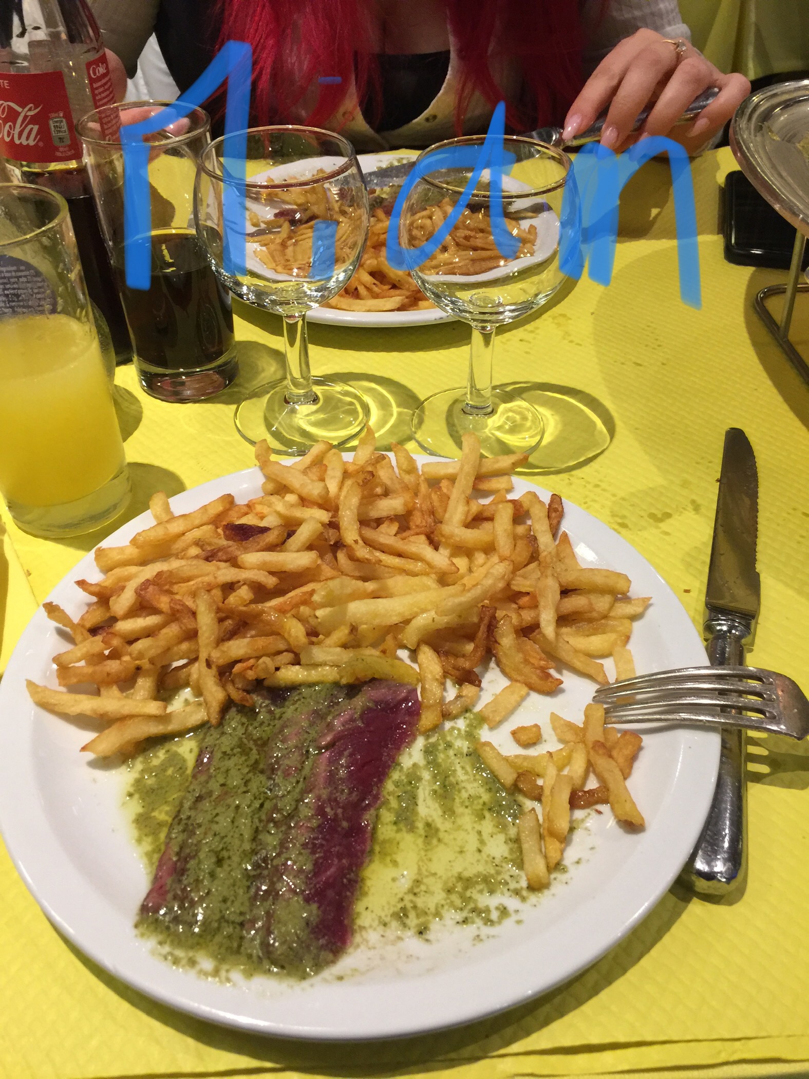 Nous y sommes allés sans savoir à quoi s’attendre exactement mais la longue file devant le restaurant qui ne s’arrête jamais nous a intrigué. Pour y entrer vous devrez attendre un petit moment il ne faut pas être pressé. Vous êtes placés assez rapidement, ils arrangent les tables pour vous installer. Nous étions arrivés vers la fin du service, le restaurant n’était pas très propre il ne faut pas trop y porter attention. Tout est fait très vite et les serveuses courent un peu partout. Une fois installé on vous amène une petite salade en entrée. Puis on vous demande la cuisson de la viande et si vous souhaitez des boissons. Vous n’avez pas de cartes. En effet, il n’y a qu’un seul menu : entrecôte servie avec des frites. Le service est rapide et le personnel est très sympathique. La viande est excellente et la sauce également tout comme les frites. Vous avez à peine fini qu’on vous propose de vous resservir des frites. C’est à volonté ici ! Au total le menu est à 20€. La durée sur place est assez limitée, je vous déconseille d’y aller si vous voulez vraiment prendre votre temps ou si vous voulez être au calme car il y a beaucoup de bruits. Cela reste une bonne expérience et ce goût unique nous donnera certainement envie de revenir !