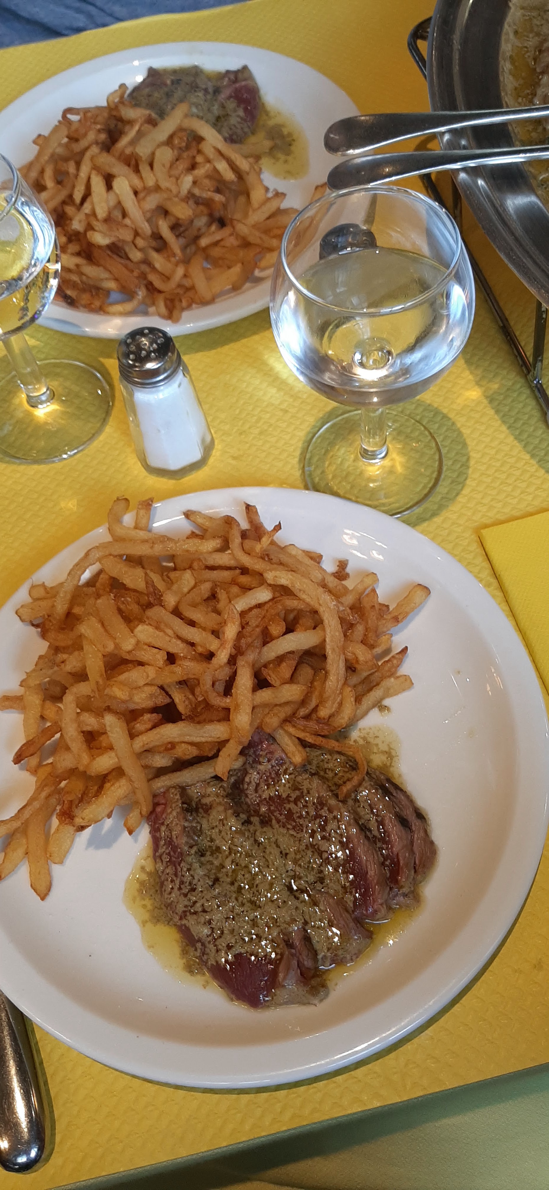 Nous y sommes venus pour un déjeuner en semaine à 2 personnes. Particularités : - pas de réservations possibles - un plat unique: une entrecôte avec des frites. Les clients sont accueillis en fonction de leur arrivée et placés soit au rez-de-chaussée ou à l étage. L attente avant d accéder au restaurant peut être longue. Ca n a pas été le cas le jour où nous sommes venus. Nous avons été placés rapidement. Une assiette de salade avec des noix nous a aidé à attendre le plat principal. L entrecôte est servie à l assiette et un 2eme morceau est présenté dans un plat à côté et maintenu au chaud. La sauce est divine! Les serveuses repassent avec les frites si besoin. Les desserts sont au choix et les portions énormes !!! Mon compagnon a bien cru ne jamais finir ses profiteroles!! Et ma portion de crème au caramel était elle aussi conséquente. Un très bon accueil avec des serveuses à l écoute. Je recommande.
