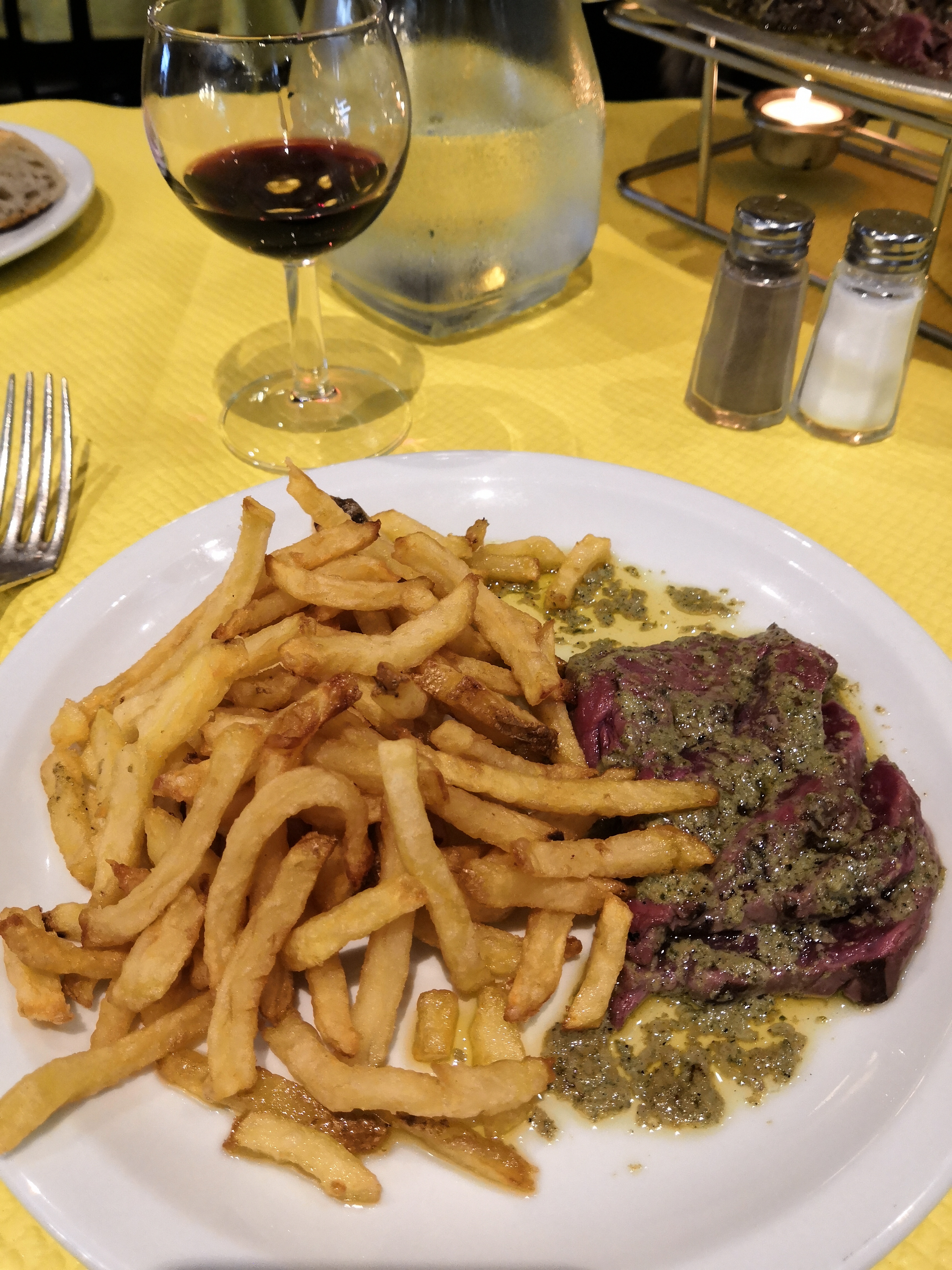Le repas est excellent : salade aux noix, faux filet de bœuf et frites avec une sauce secrète. Portions généreuses. Le service est rapide. Je recommande vivement ce restaurant mais attention à arriver de bonne heure car il y a toujours une file d attente, ce qui veut tout dire. C'est tellement bon que les gens sont prêts à faire la queue pour y manger. Allez y les yeux fermés, vous ne le regretterez pas.