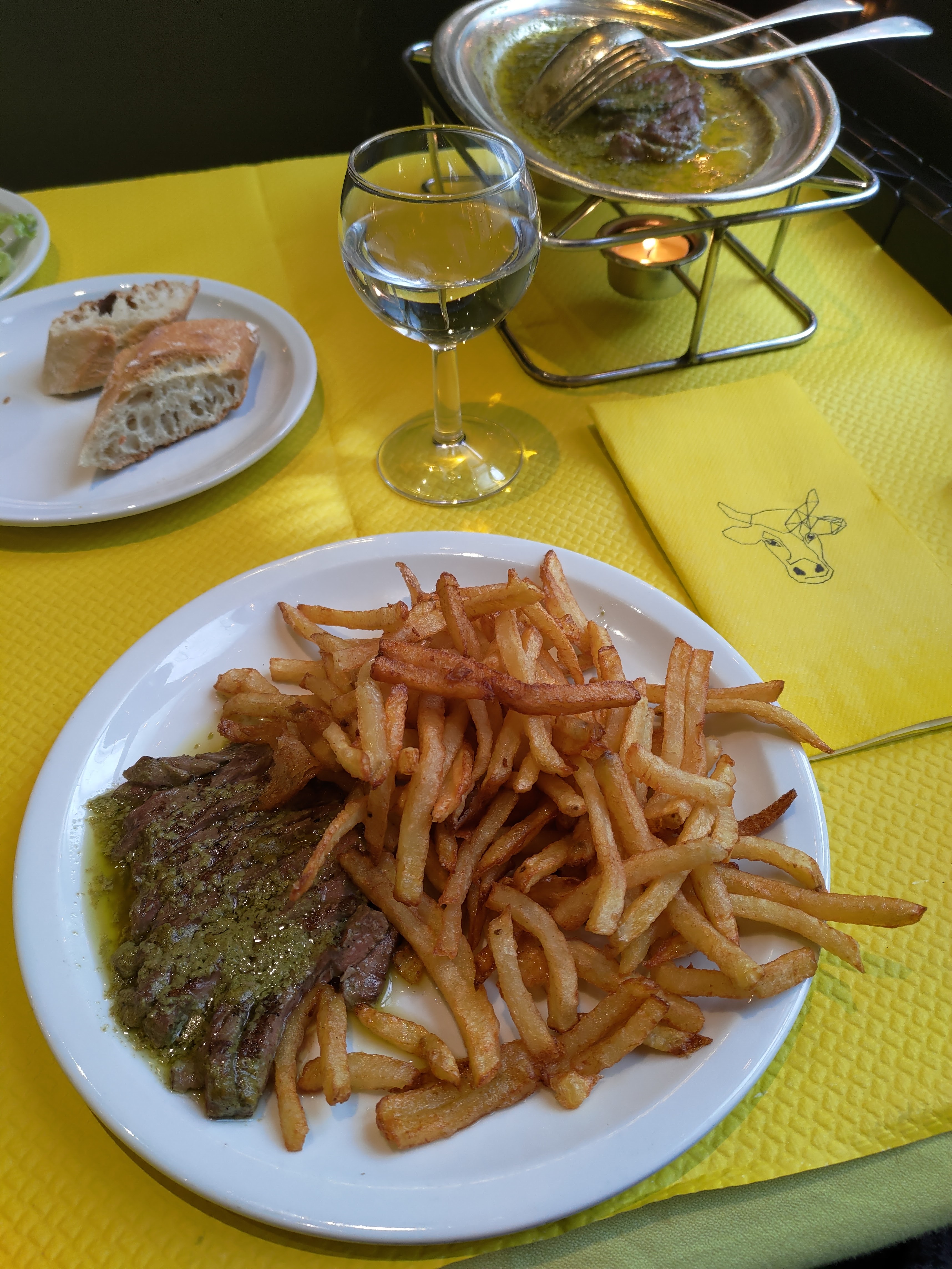 Le menu est simple: une salade avec des noix, de la très bonne viande avec une sauce incroyable et des frites a volonté. Tout cela au prix de 19€, boisson et dessert non inclus. Le service est très rapide et la viande reste toujours chaude. Le seul point négatif est la queue qu'il faut faire certains soirs (typiquement vendredi ou samedi).