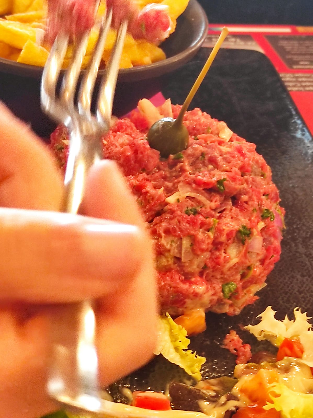 Accueil super mais déçu par nos plats. Nous avons pris tous les deux un tartare de saumon servi avec moitié fîtes moitié salade. A l aspect les dés de saumon étaient trop gros, pas de goût pour ce saumon. Mon mari l a mangé sans enthousiasme et moi aussi. Cette nuit malade tous les deux. Notre dessert moi mousse au chocolat et mon mari tarte à la poire amande. Pas une réussi pour nous deux. Dommage nous avons l habitude de cet établissement pour la viande parfait. Le poisson😩😩