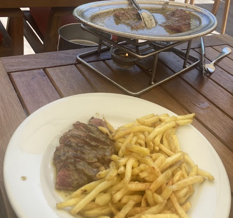 Attention a la cuisson de la viande : Je suis allé mangé avec un ami, nous avons tous deux 20 ans et avons eu l'impression d'être sous considérés par rapport a notre âge : nous avons été mis en plein soleil sans parasols parce qu'il n'y avait pas plus de place selon le serveur; alors que deux dames qui attendaient dernière nous ont été installées a l'ombre (sans réservation). L'entrecôte de boeuf que nous avions commandé respectivement saignante et a point est arrivée a point et bien bien cuite, très dommage parce que l'on sent bien que la viande est de qualité. Il a malheureusement fallut demander deux fois pour que les sauces que nous avions commandées nous soient apportées. Dommage que les serveurs ne fassent pas attention aux carafes d'eau vides. Pensez bien à réserver a l'ombre ou en salle, ce n'est pas agréable de déjeuner un plat de viande copieux au soleil. Les Frittes étaient très bonnes, les sauces au poivre et au beurre également.