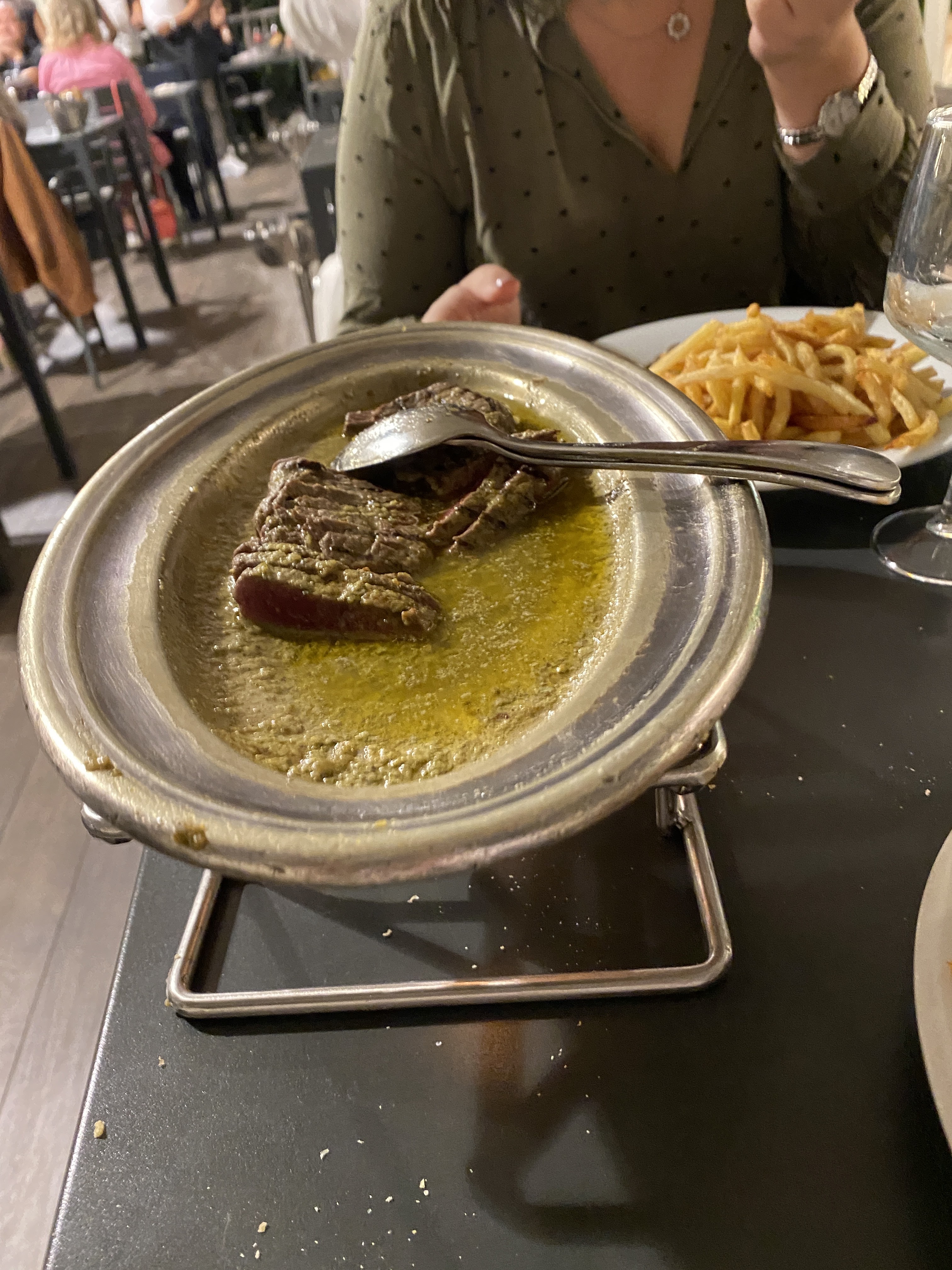 Je rejoindrai ici la plupart des avis concernant les prix pratiqués qui sont un peu chers par rapport à ce qui est servi. Cependant, la viande est de très bonne qualité, tendre et bien cuisinée dans une sauce « maison » qui reste secrète. Dommage que les frites ne soient que l’accompagnant de la formule à 26€ sans boisson ni dessert. Nous n’avons pas eu à nous plaindre de l’accueil et du service qui a été parfait. Préférez la terrasse en extérieur qui me semble plus sympa que l’intérieur.