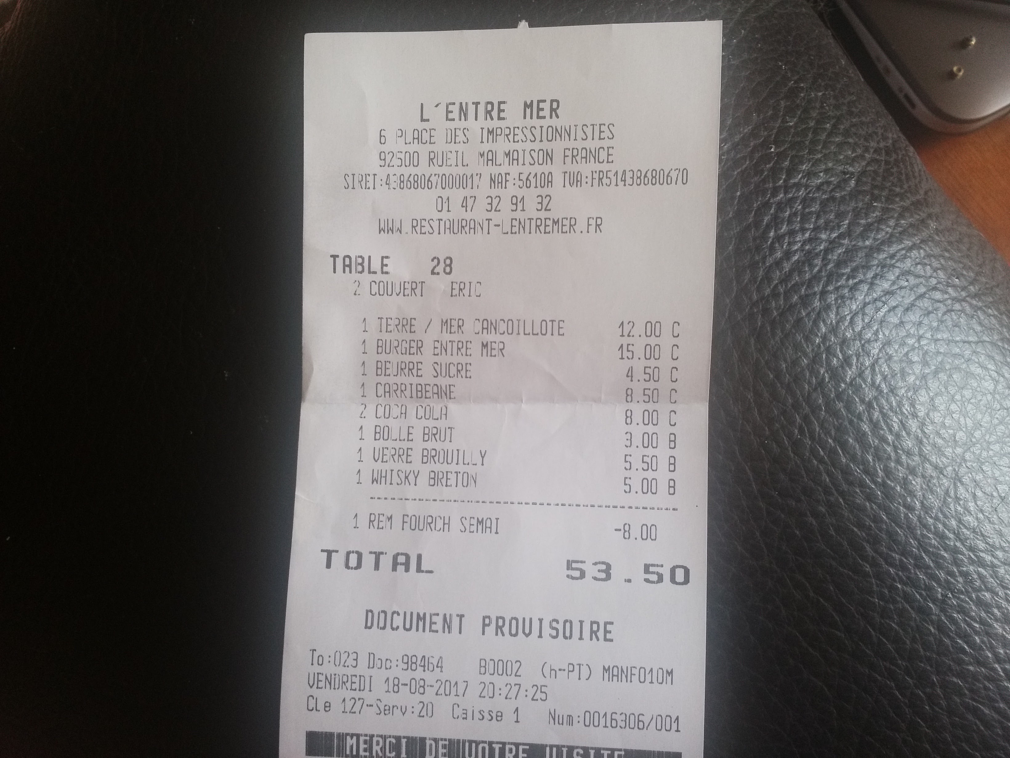 Nul, les Tables sont 20 Centimètres trop petites, entre les verres à eau, la bouteille d'eau, les verres des boissons, les couverts, les assiettes, l'éventuelles boisson et la serviettes, tout tiens en équilibre car il n'y a plus aucune place, et le pire dans tous ça c'est que il y avait largement la place de mettre des tables 20 Centimètres plus large, donc table inconfortable fouillis et brouillonne c'est un peux stressant on a peur de faire tomber des objets par terre tellement la table est charger, déjà quel idée de laisser des verres d'eau et une bouteilles d'eau qu'on à pas utiliser de la soiré. j'ai pris un Burger Entre Mer, autant le Steak du burger est bon, la réalisation est moyenne, les pains du Burger est Correcte sans plus, Les Frites ou Pommes Frites sont surement surgeler en gout les frites sont médiocres et pas très fraîches. dans une assiette quand il y a un petit cercle pour mettre les condiments ou épice comme de la moutarde ou ketchup, on fait en sort que cet parti soit proche coté client et pas à l'opposer et les Frites à coté du petit cercle c'est l'endroit qui sert à mettre le Ketchup ou la moutarde, pourquoi le Burger à été mis à coté du cercle j'en sais rien, et pour quoi il m'a été présenter du cote du centre de la table j'en sais rien mais c'est nul obliger de retourner l’assiette pour avoir le cercles vers soit. le Ketchup, est correcte j'ai vu pire, mais ça n'est pas du Ketchup Heinz ce qui est une grosse erreur à mon avis. le Pire pour moi ce fut la crêpe beurre sucre, la pâte à crêpe est mauvaise, car trop lourde, pas très aéré et manque de légèreté, la pâte n'ai pas l'air d'une grande fraîcheur, en suite quel idée de cuire la pâtes que d'un coté, il y a un coté de la crêpe qui est cuit et l'autres rien, le dosage de beurre et de sucre est trop faible, pour un restaurant dont la spécialité c'est de cuisiner des CRÊPES c'est inadmissible, comment peut on être aussi mauvais alors que c'est leurs spécialité. bref je n'y reviendrais pas.